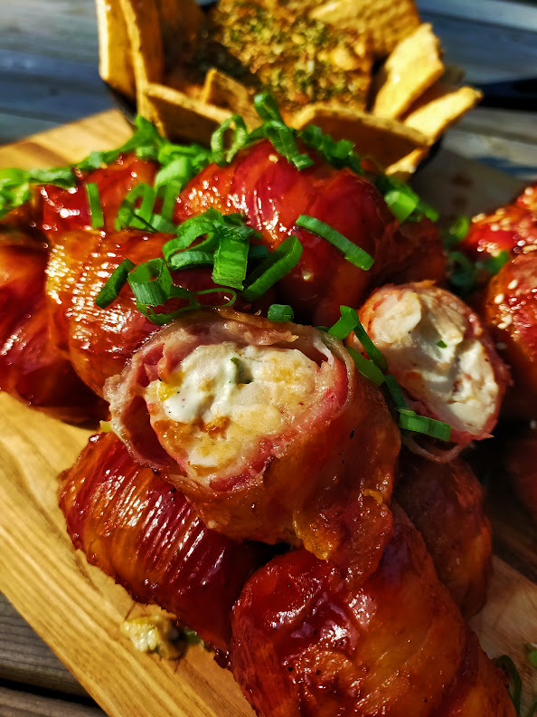 - Bestrooi de vleugeltjes met de bbg rub en rol ze goed in de ontbijtspek.