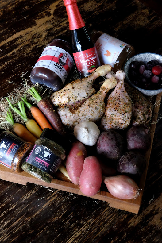 - Voeg nu de fond, kriekbier, black cherry bbq saus, honing en de kersen toe.