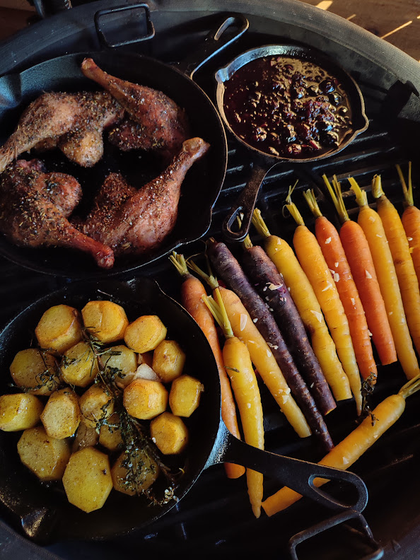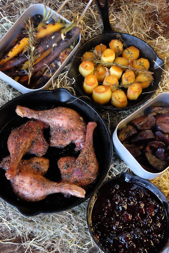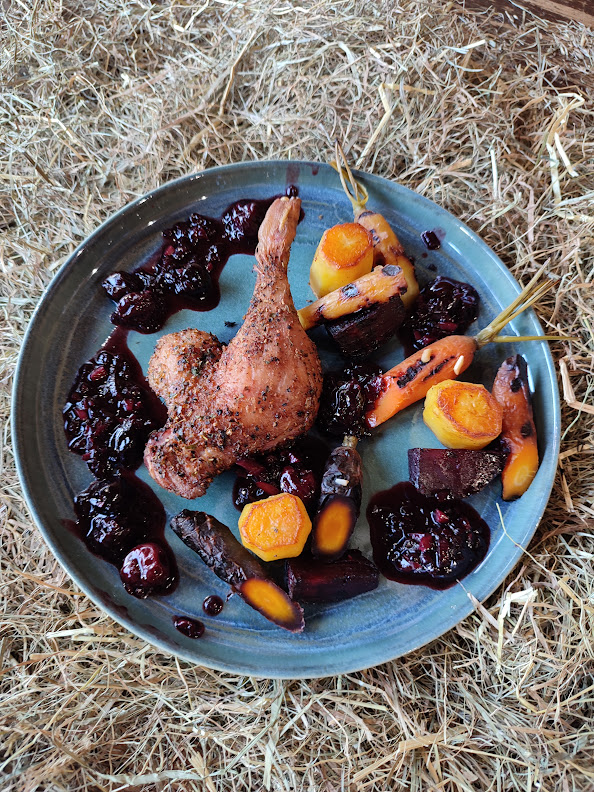 Hooi gerookte eendenbout met krieksaus, fondant aardappels, gegrilde regenboog wortel en gepofte biet