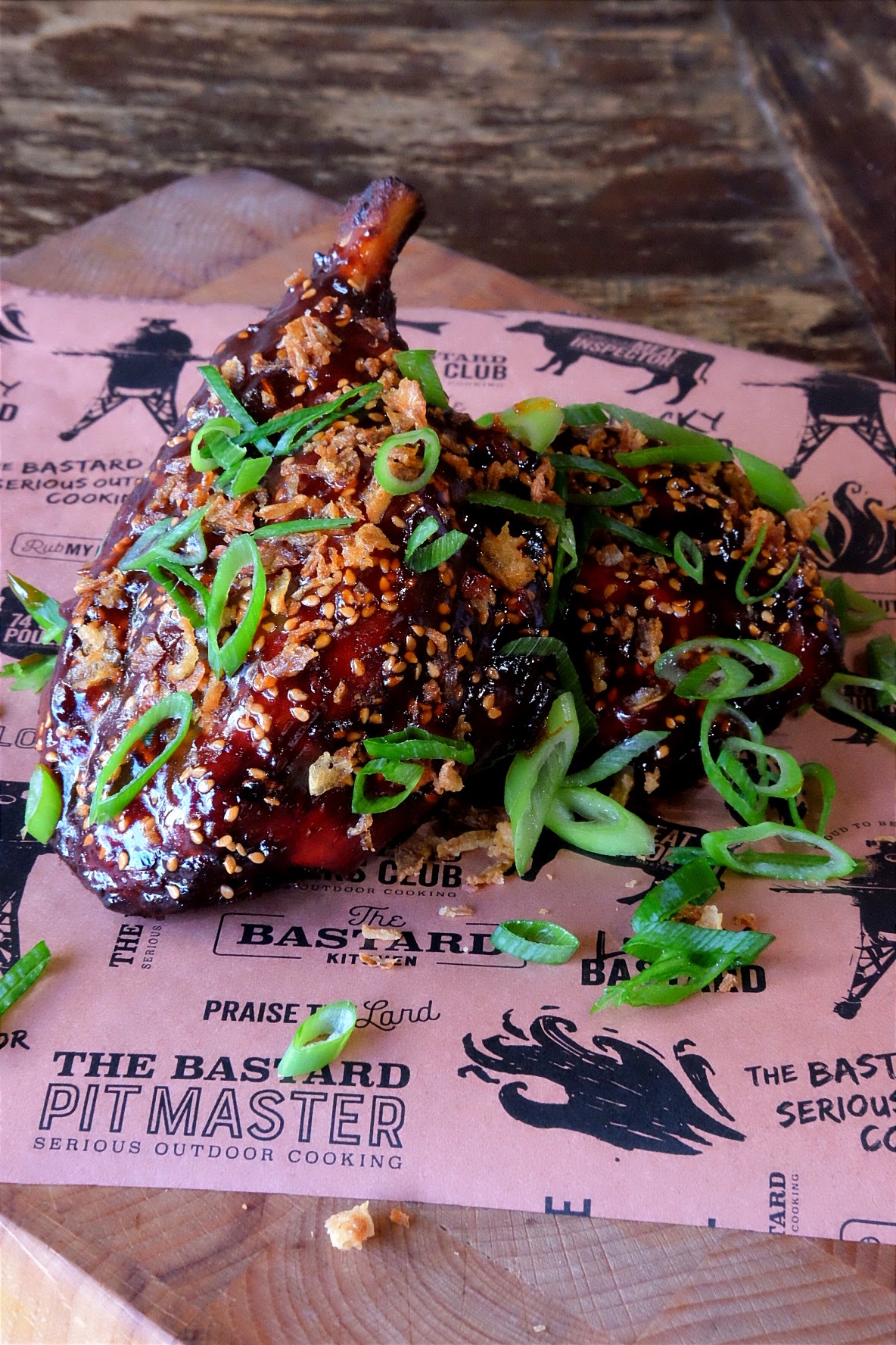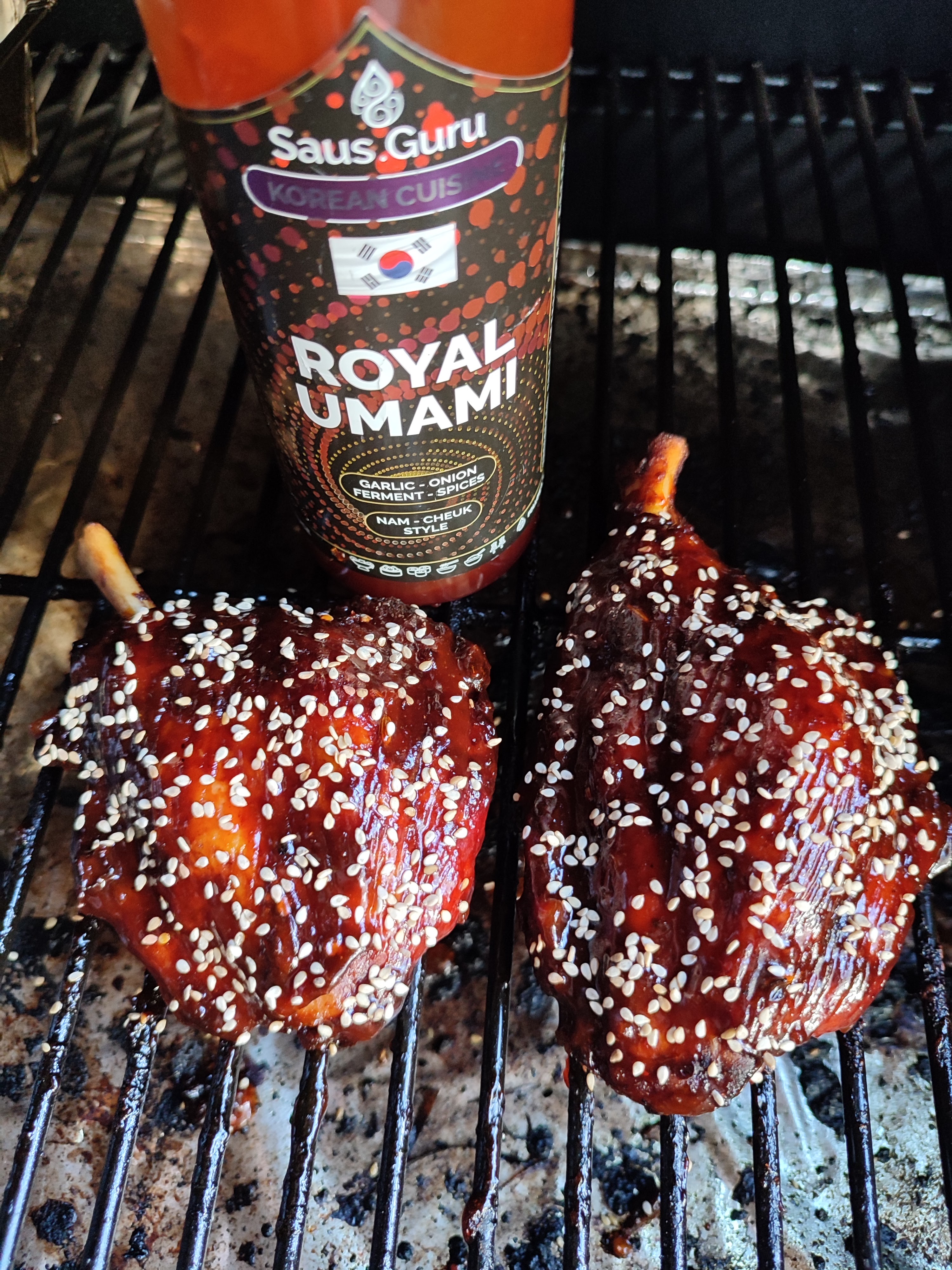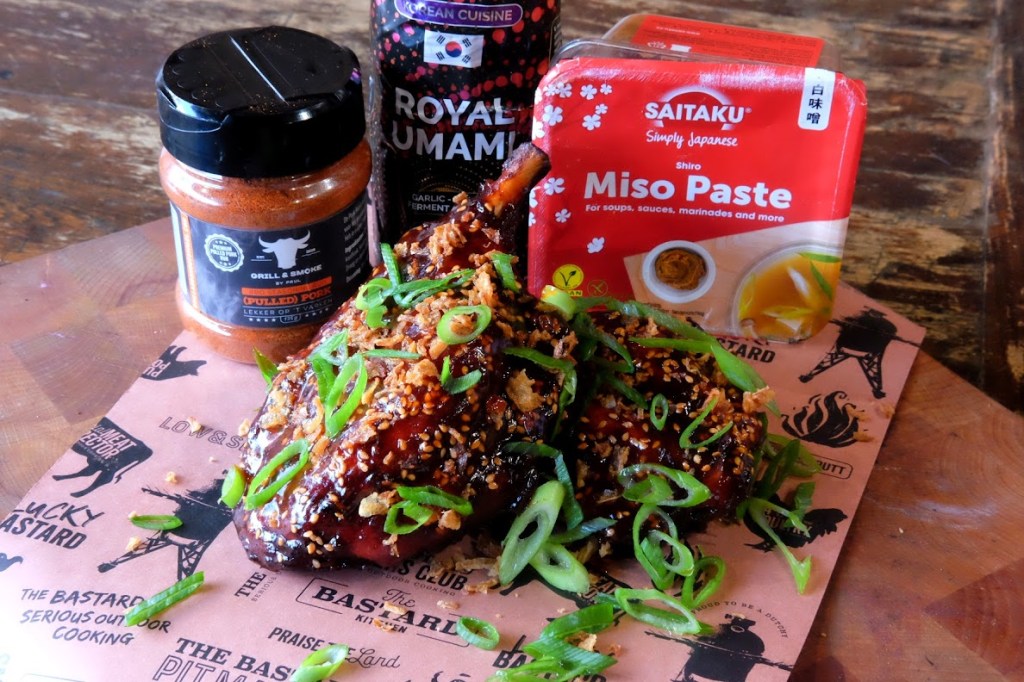 - Haal ze van de bbq smeer nog wat royal umami erover en strooi de bosui in ringen gesneden erover en ook de krokante uitjes.