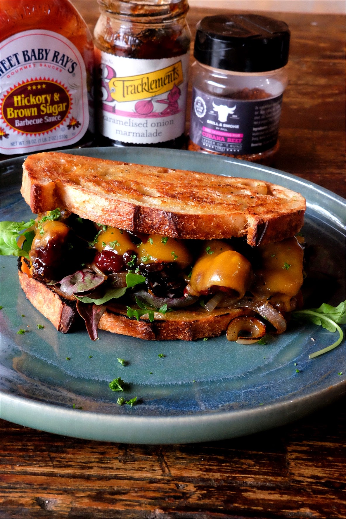 - Leg op de andere vier sneeën sla en de uien, ribfingers en kaas en doe de andere sneeën er bovenop .