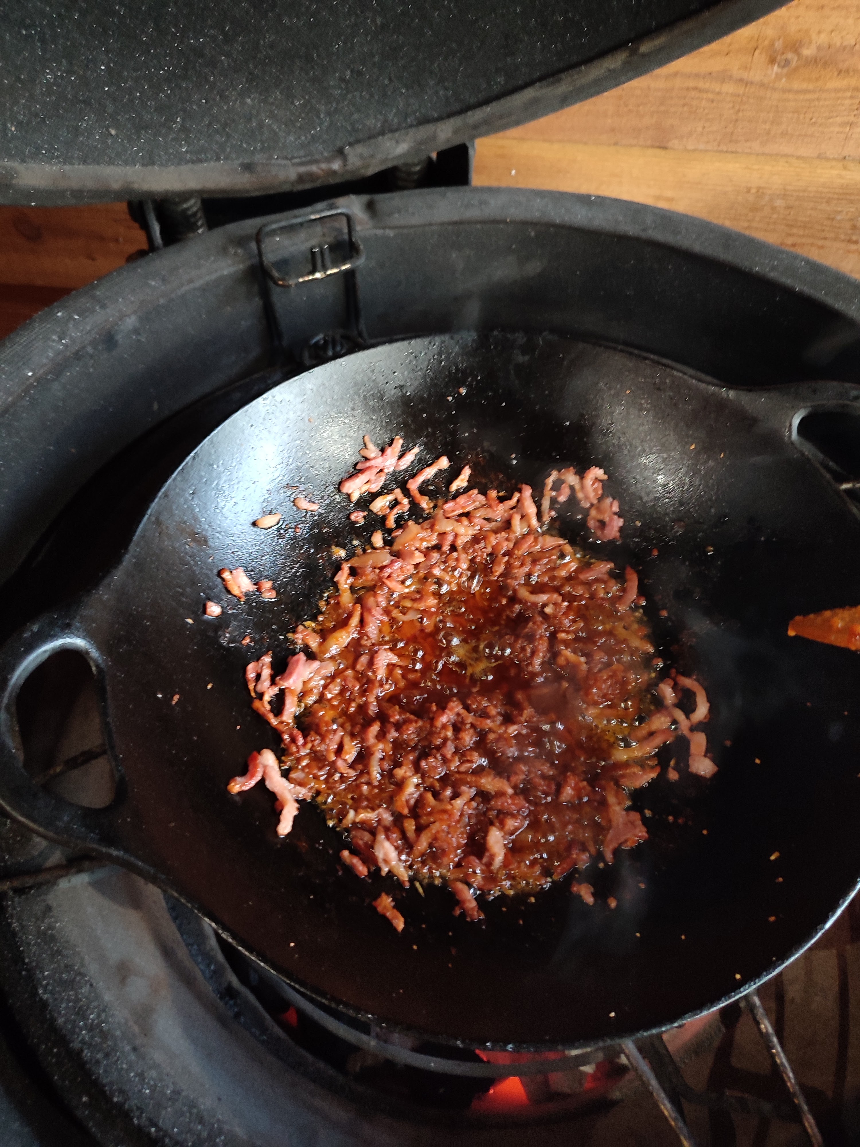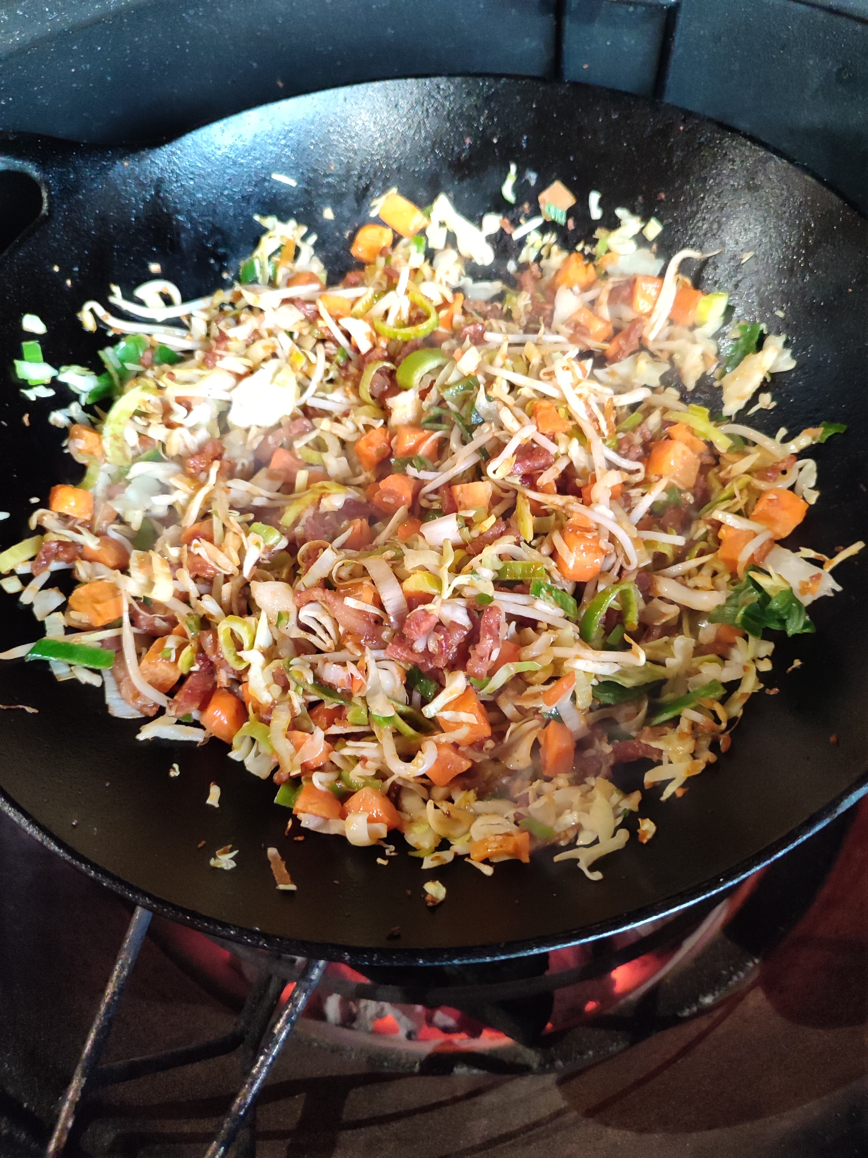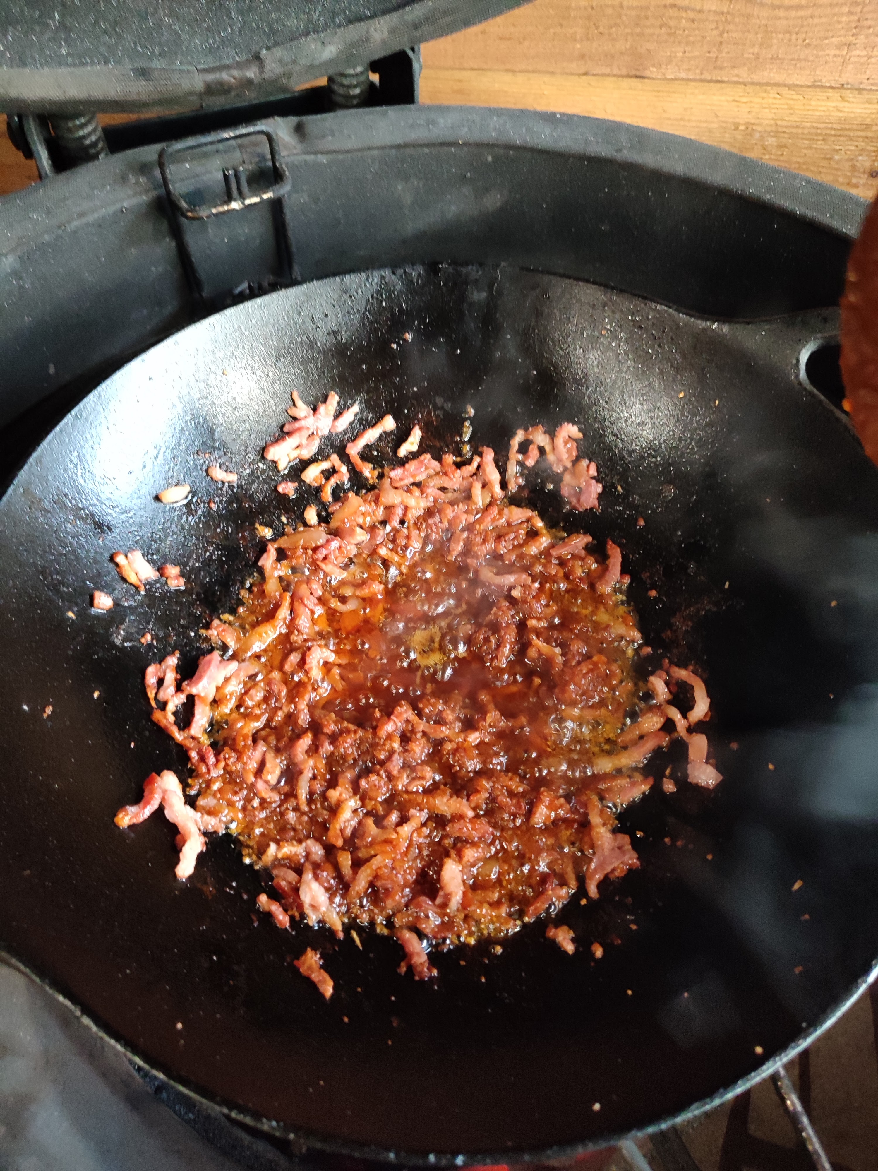 - Doe een beetje olie in de wok en bak nu de spekreepjes aan tot ze krokant zijn.