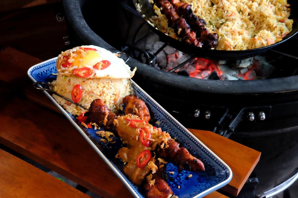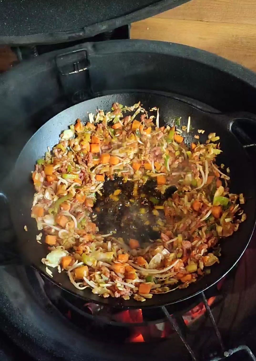 - Steek de bbq aan op directe hitte en zet de wok op de bbq.