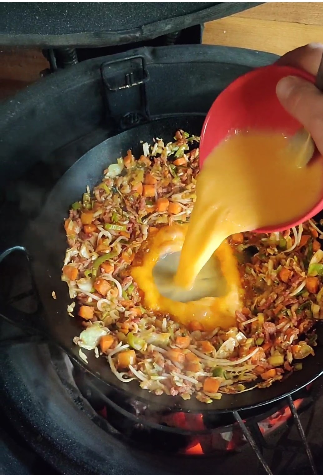 - Doe nog wat olie in het midden van de wok en roerbak nu de eieren in de midden van de wok.