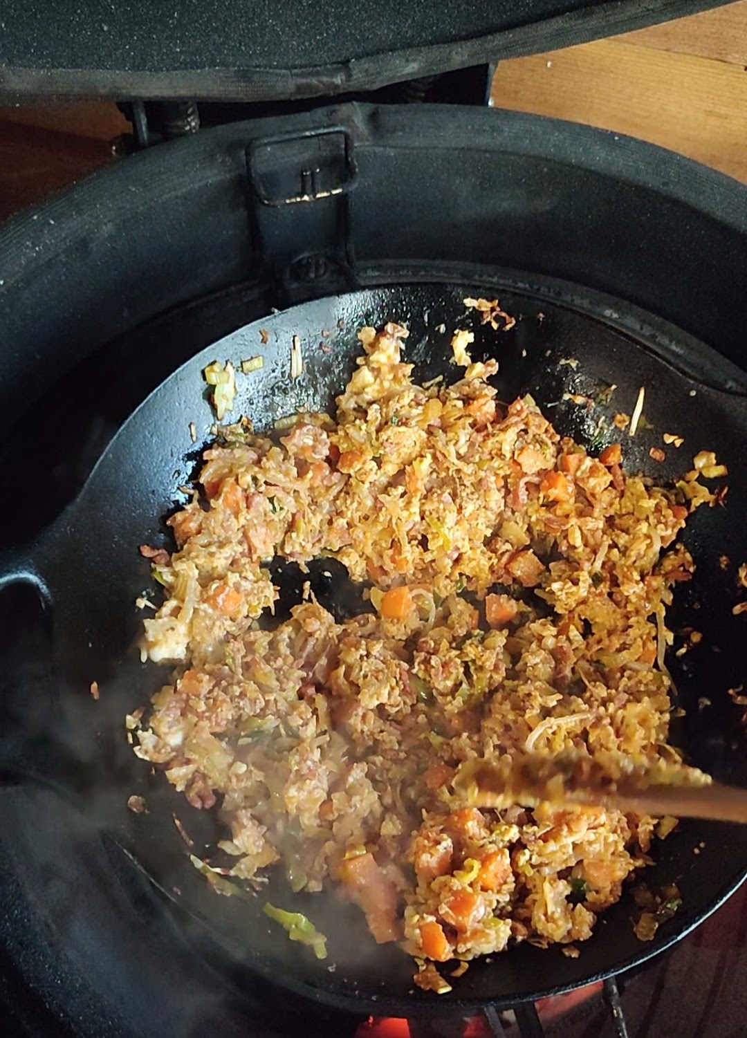 - Maak nu een gat in de midden van de nasi zodat je de bodem van de wok ziet.