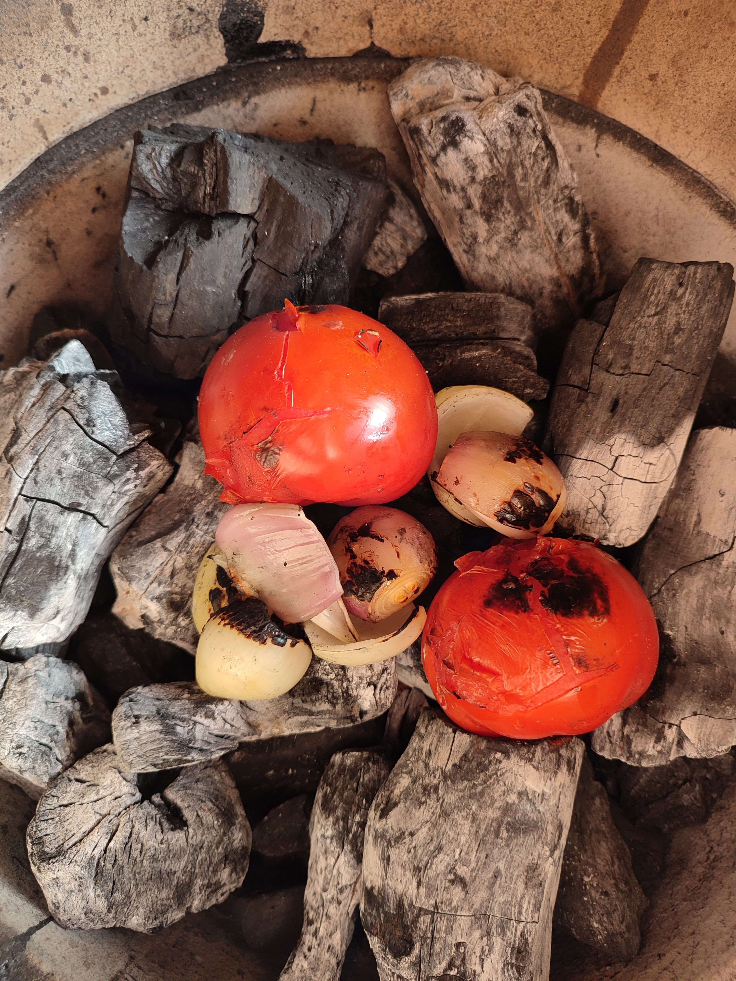 - Rooster de uien en tomaten direct op de kolen tot ze een beetje zwart geblakerd zijn.