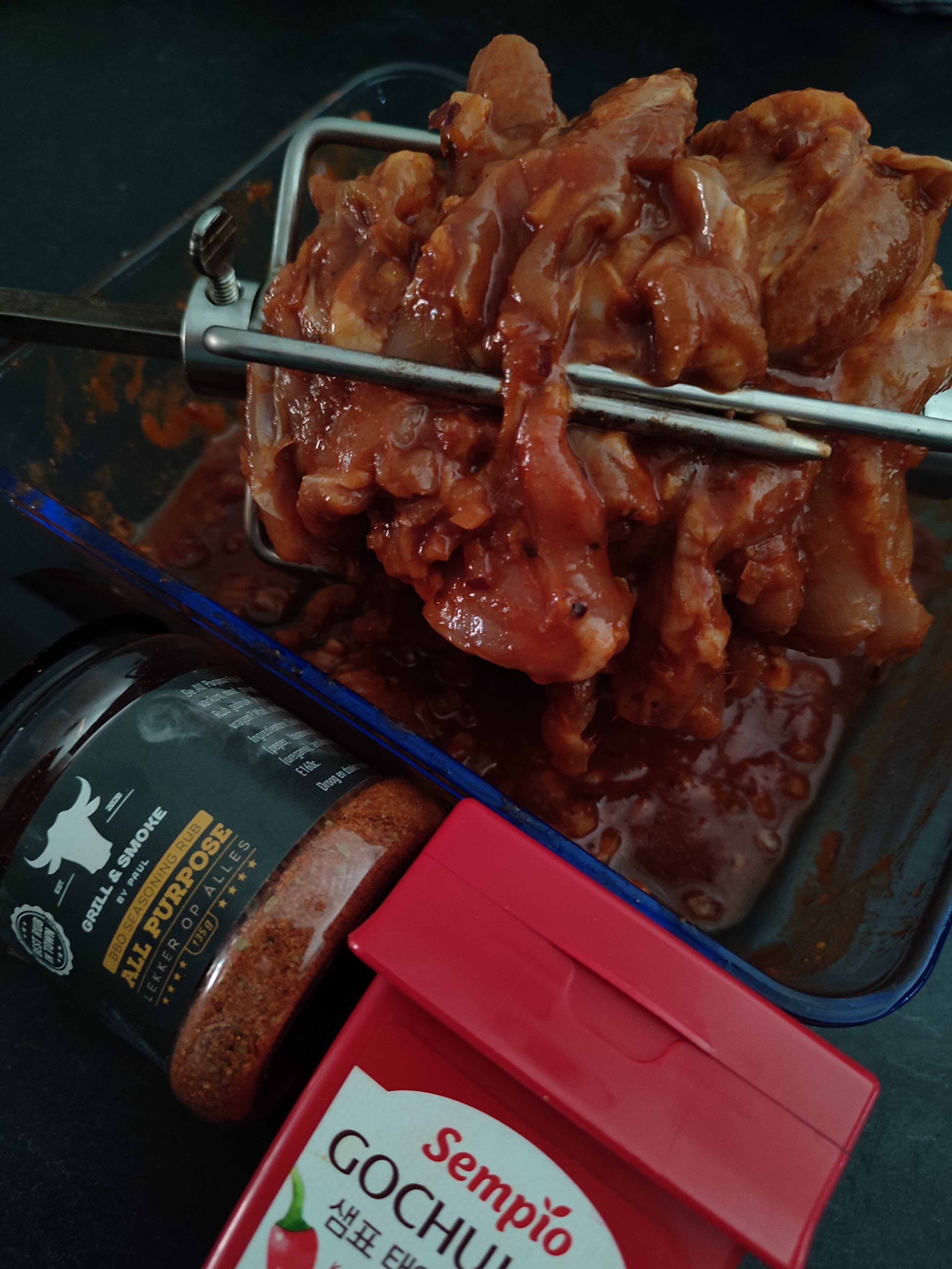 - Maak een marinade met de rest van de ingrediënten en laat dit minimaal 3 uur marineren het liefst een avond van te voren.