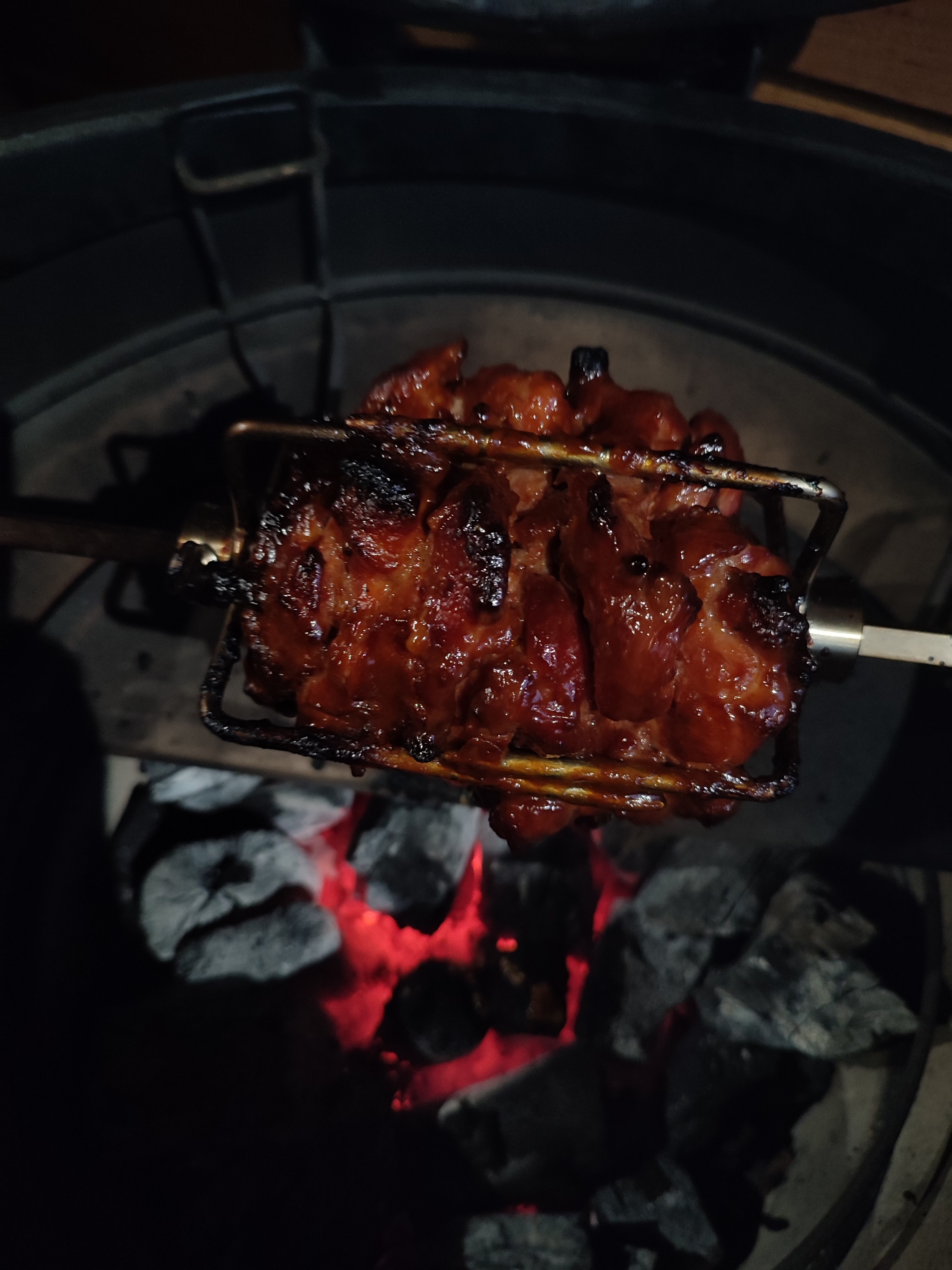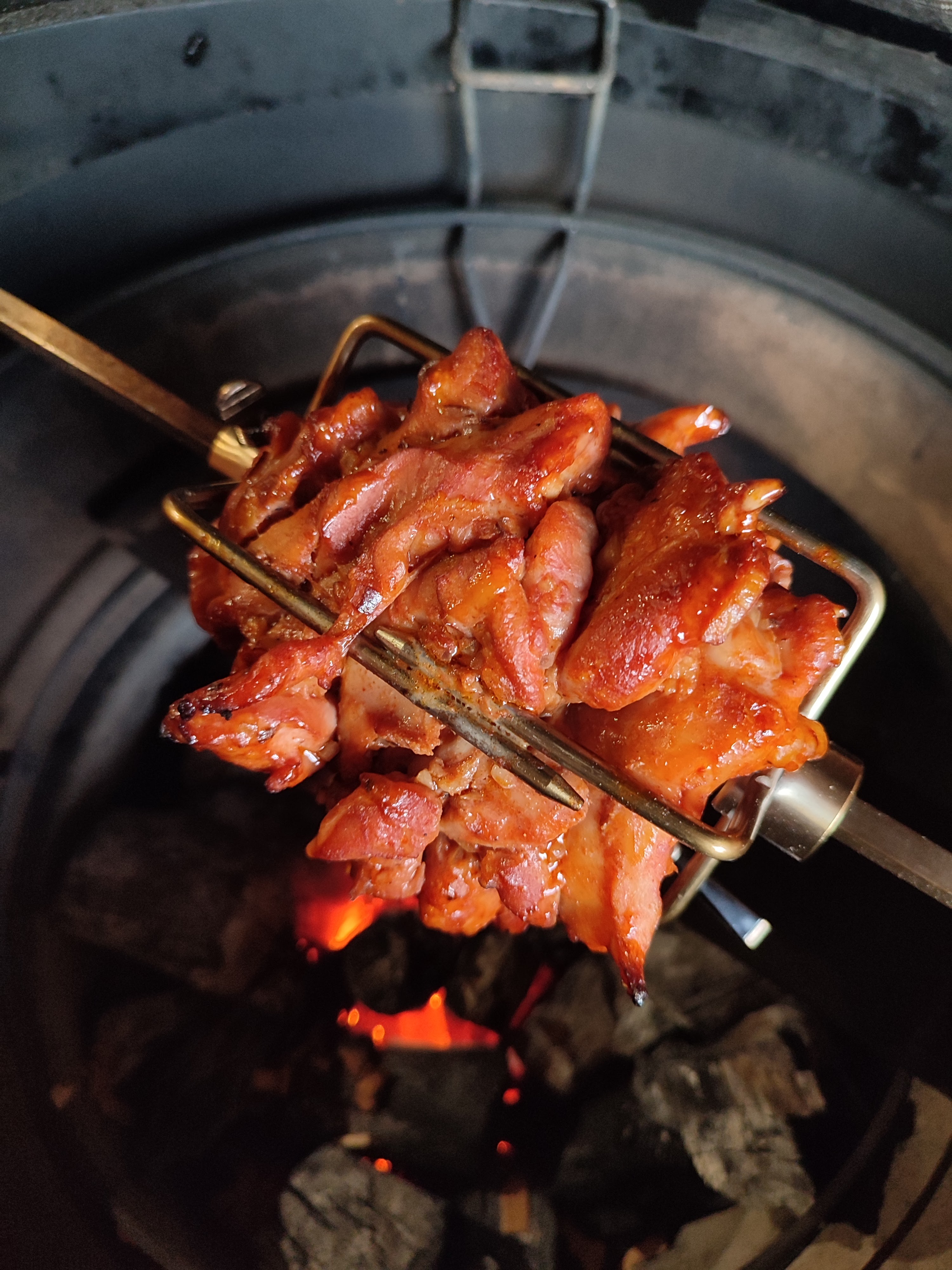 - Gaar nu de kippendij aan spit tot kern van 77 graden.