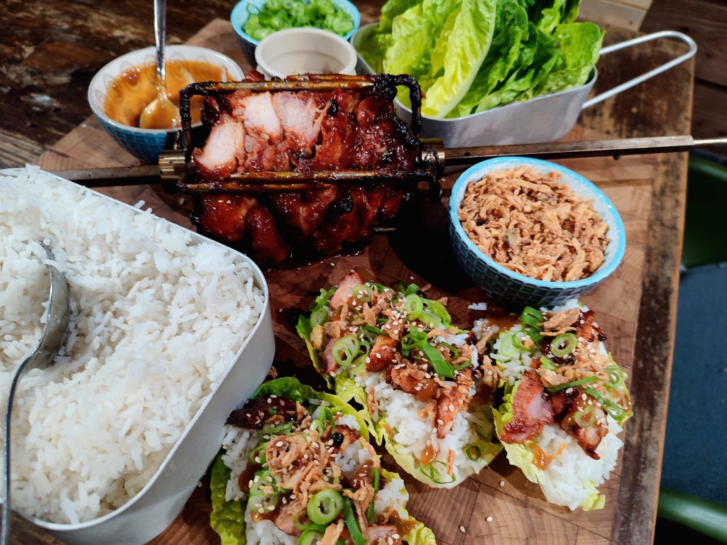 - Serveer nu in de slablaadjes gevuld met wat rijst een beetje van de kip eventueel overgebleven saus, bosui, sesamzaadjes en krokante uitjes.