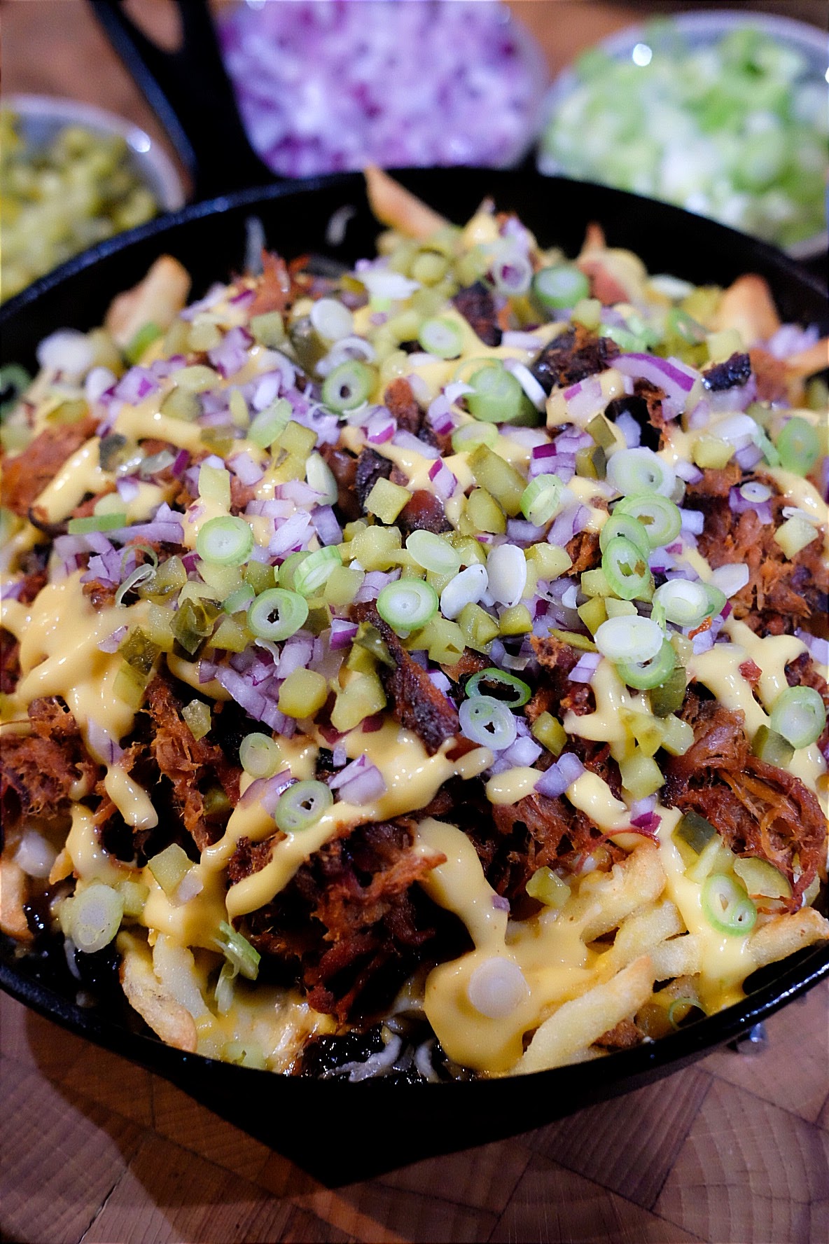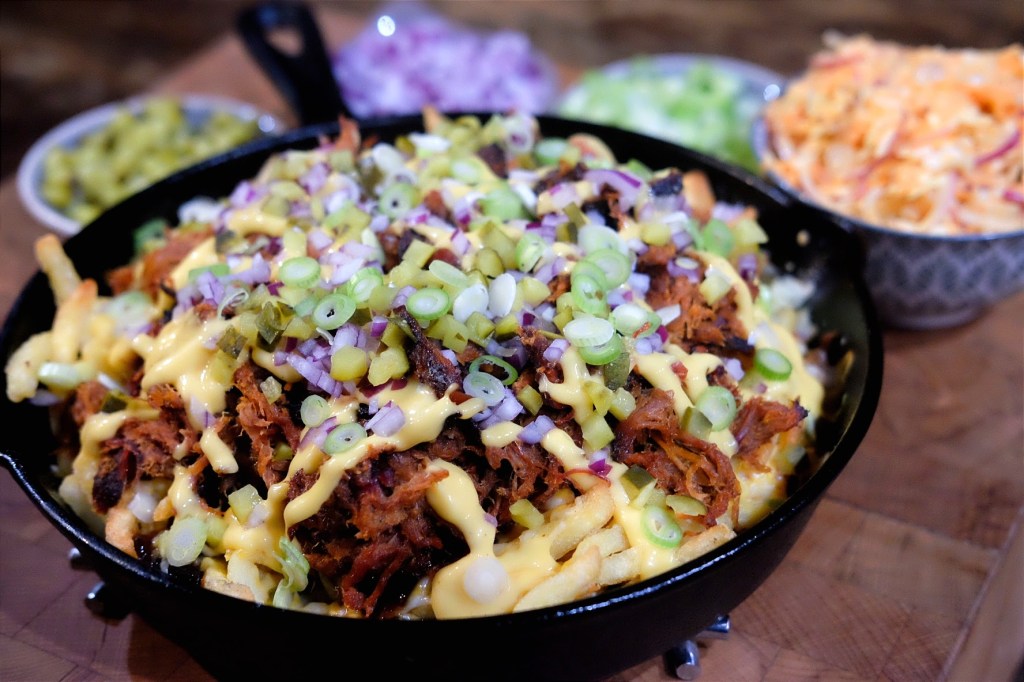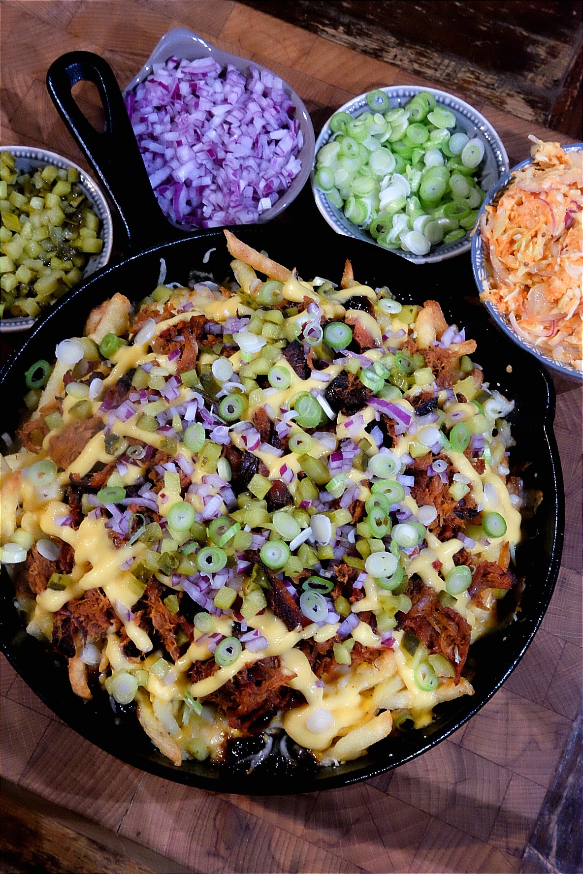 - Na dat de kaas is gesmolten kun je de friet verder aftoppen met de pulled pork, kaassaus, augurkblokjes, rode ui en de bosui of bieslook.