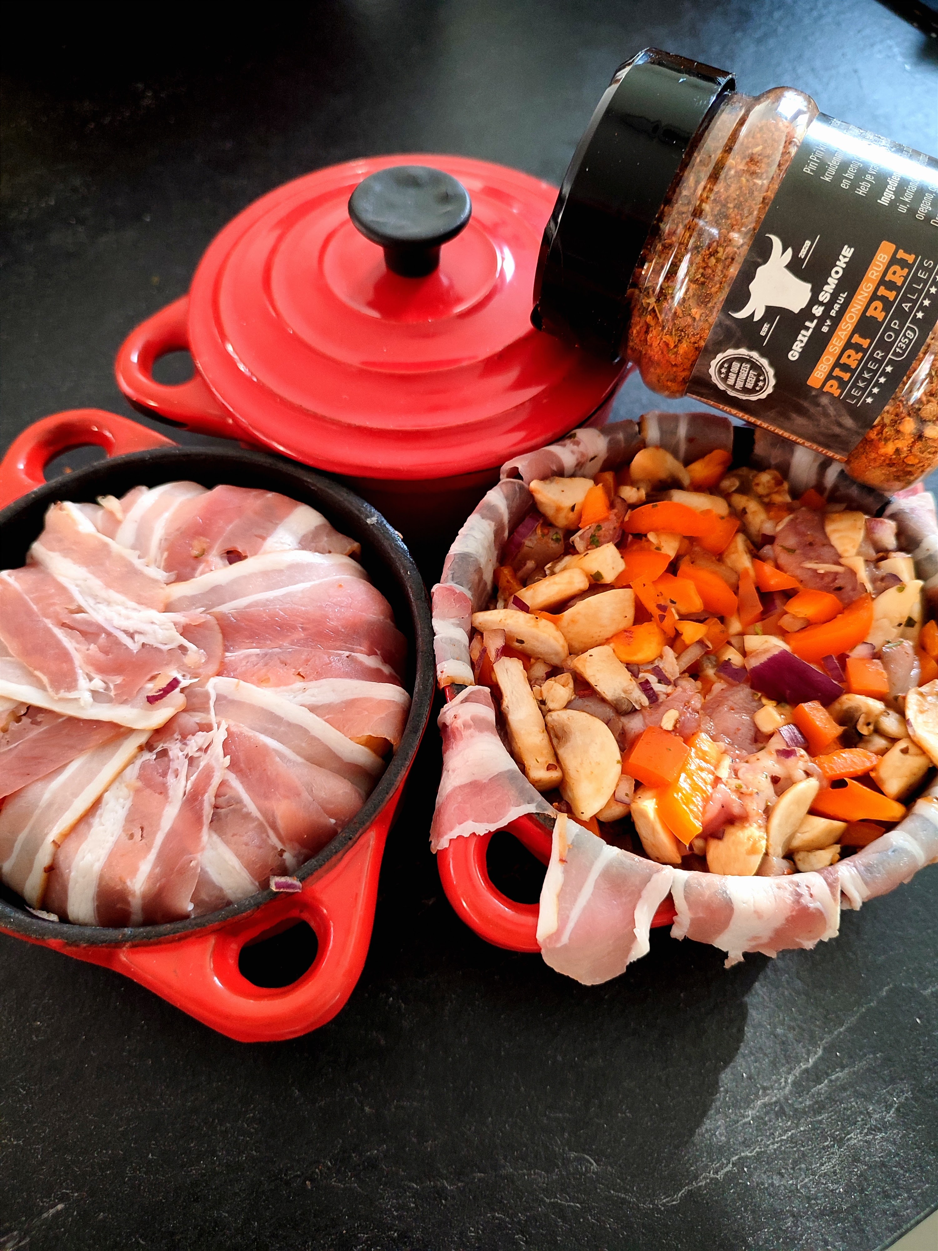 - Meng nu de kippendij, champignon, ui, paprika en de rub door elkaar.