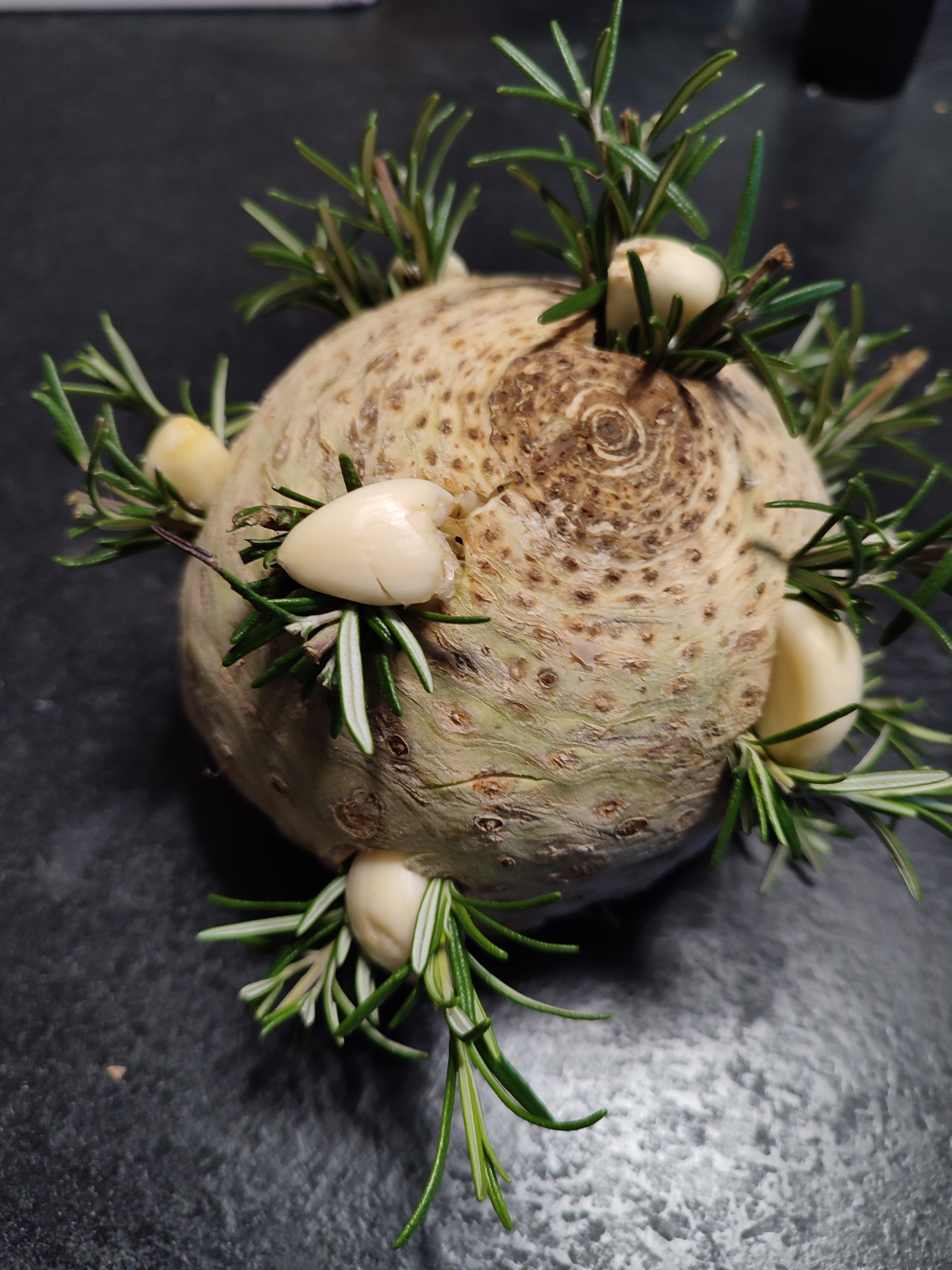 - Maak evenveel gaatjes als teentjes knoflook in de knolselderij.