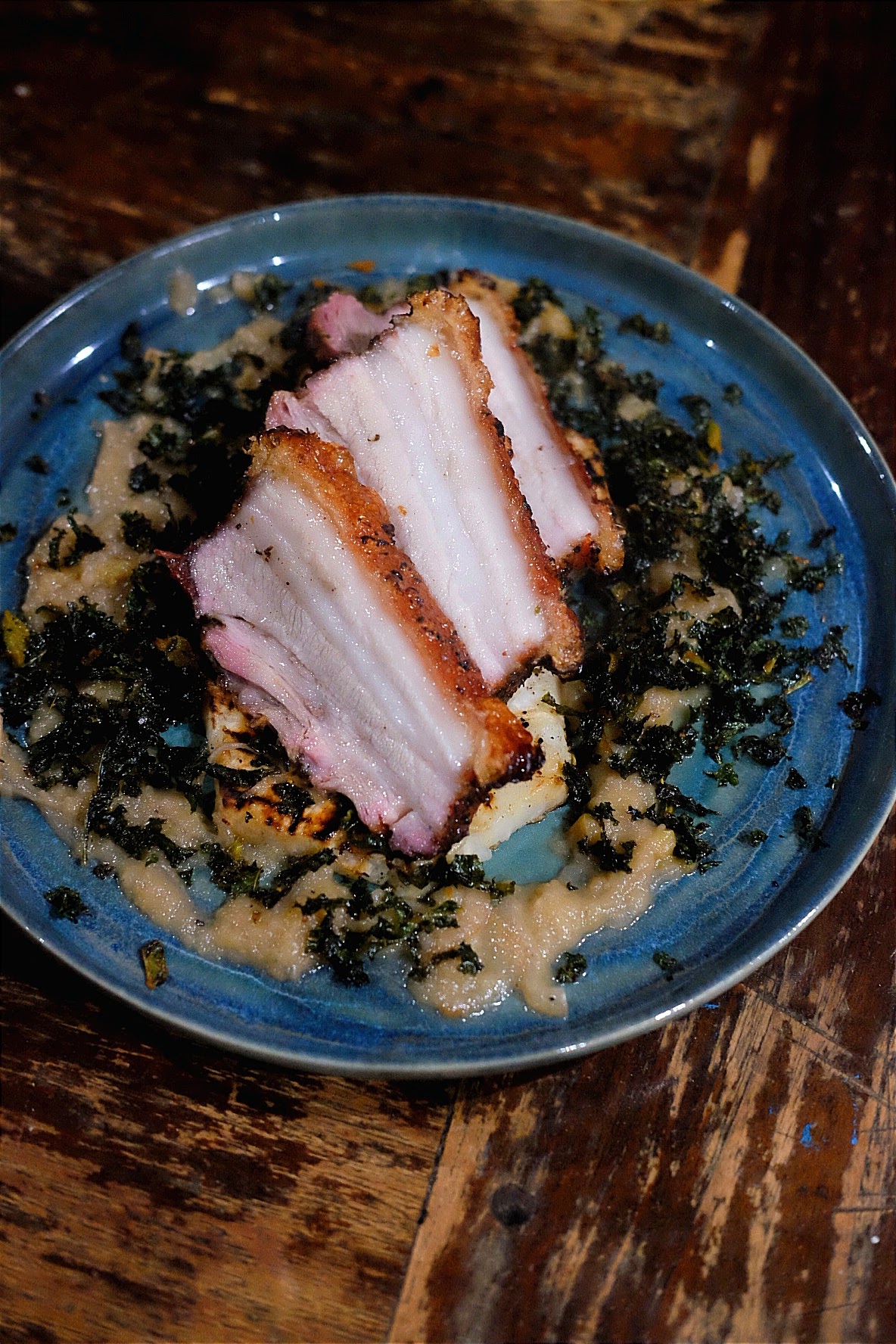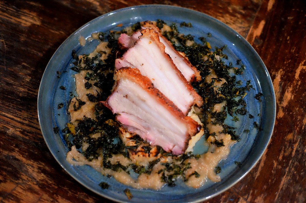 Krokante buikspek met calvados saus, gepofte knolselderij en boerenkoolchips.