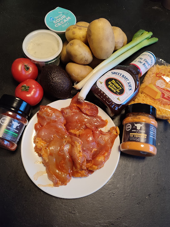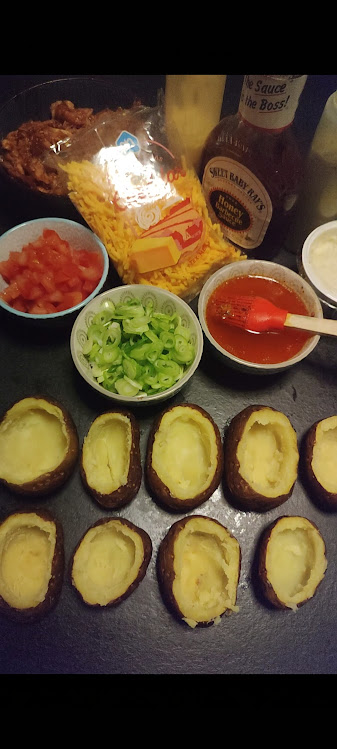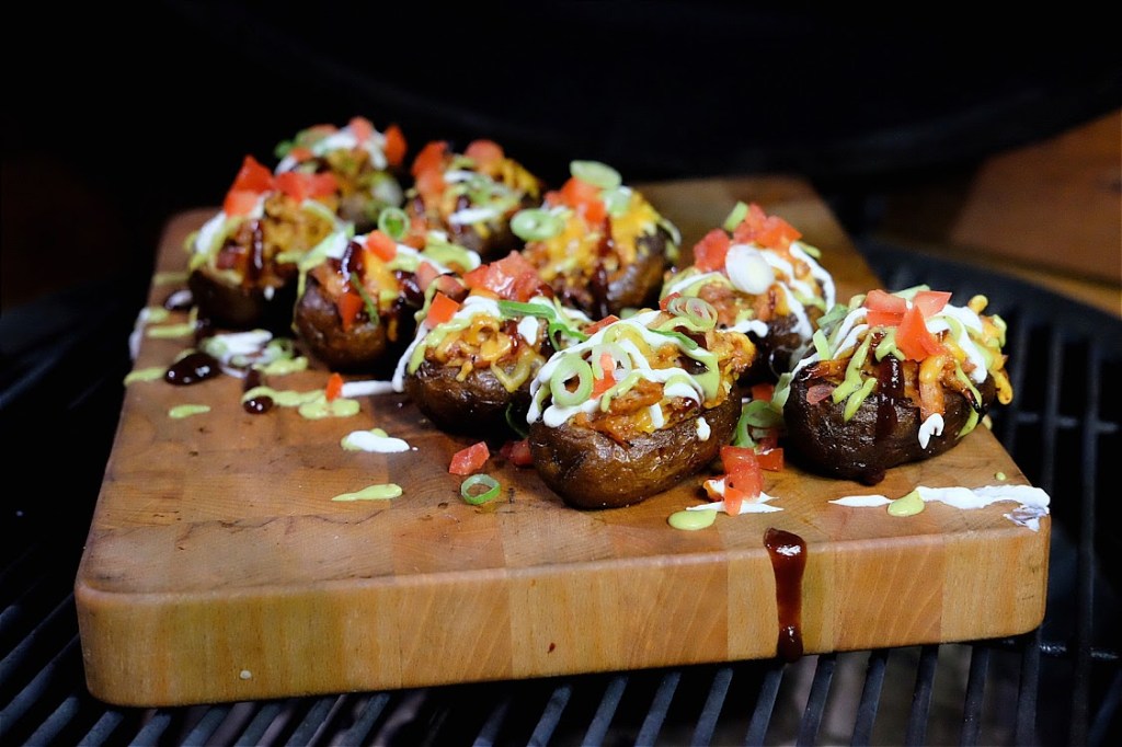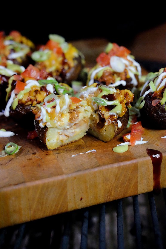 - Haal de aardappelen van de bbq en garneer af met de creme fraiche, avocado saus, bbq saus, bosui en de tomaatjes.