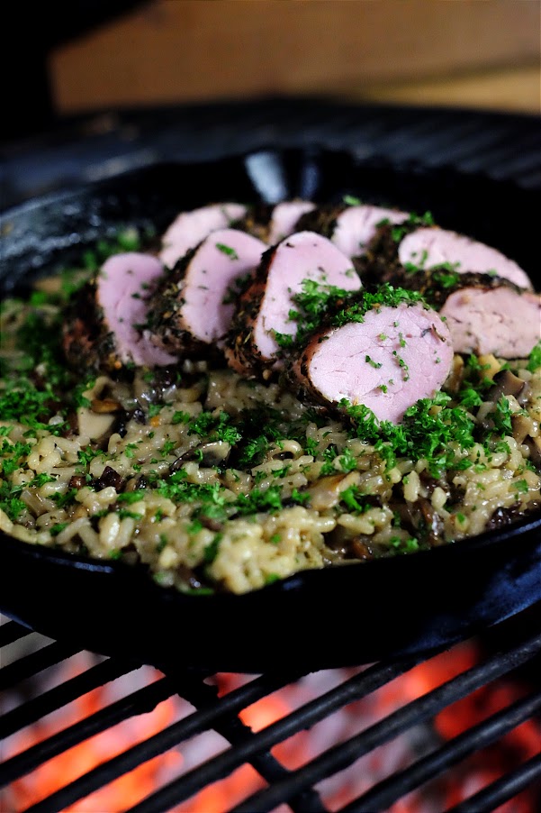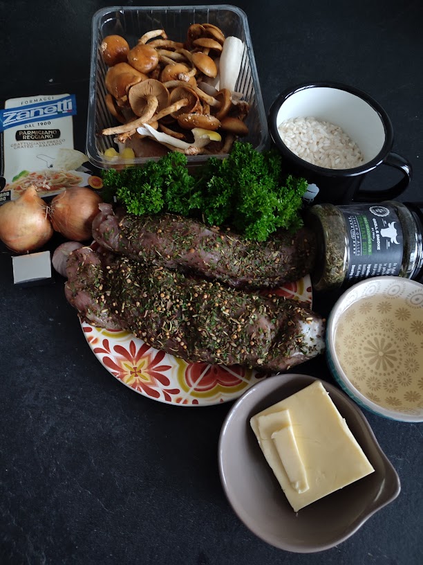 - Als de varkenshaasjes ook gerust hebben kun je deze aansnijden en bovenop de risotto leggen en strooi er dan de rest van de peterselie eroverheen.