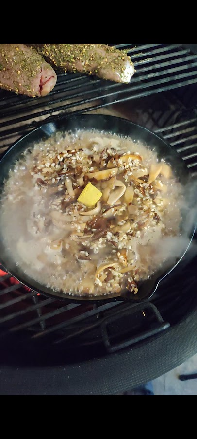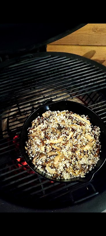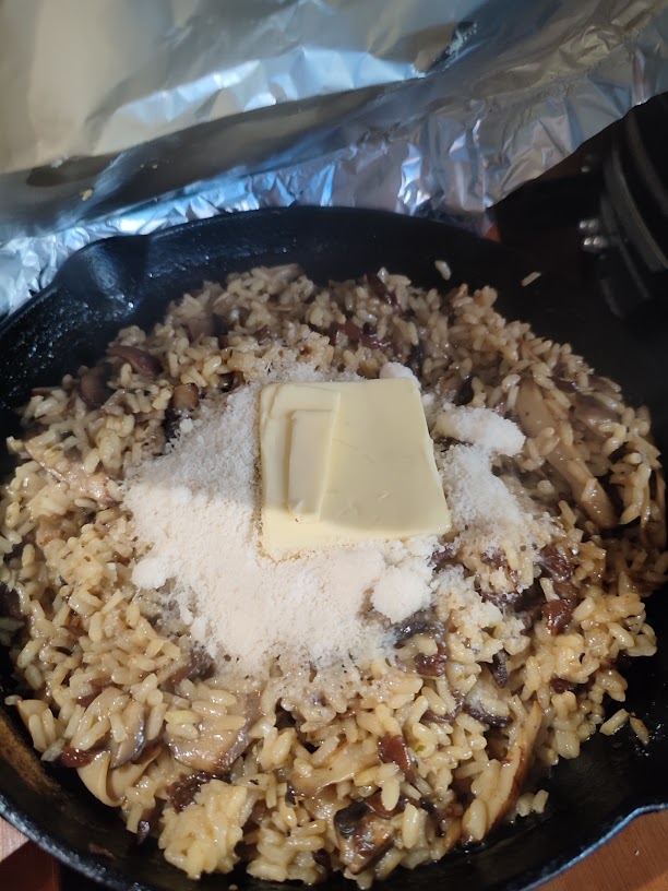 - Zodra de rijst de juiste gaarheid heeft en nog wat vochtig haal je deze van de bbq en doe je de boter en de kaas er bovenop zonder te roeren en dek af met aluminiumfolie.