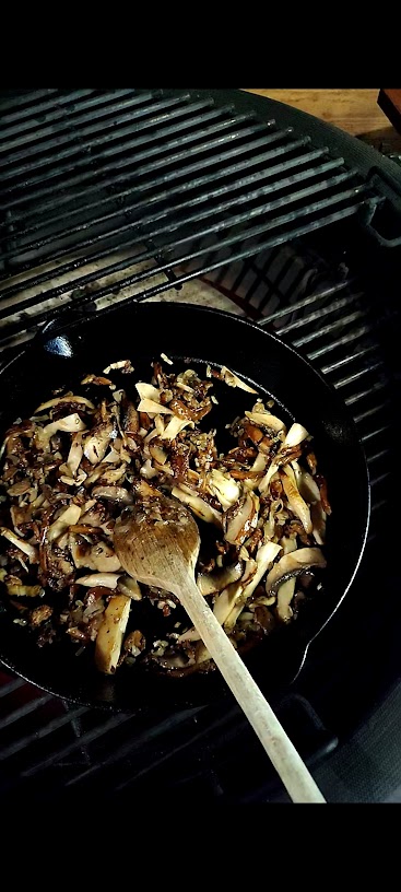 - Bak nu de ui en de paddenstoelen aan tot de paddenstoelen een mooie kleur hebben.