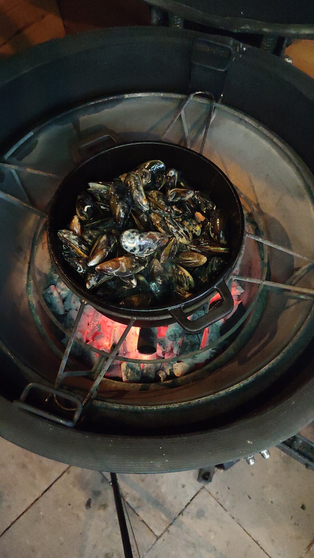 - Doe de deksel op de pan en laat de mosselen op 150 graden verder garen.