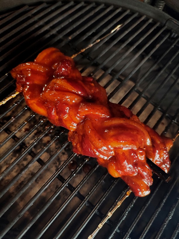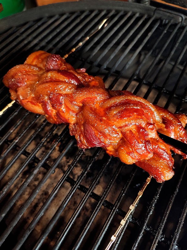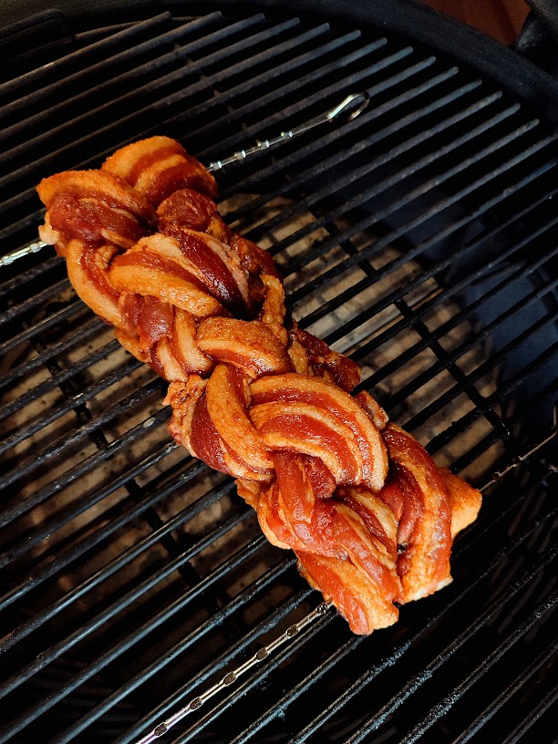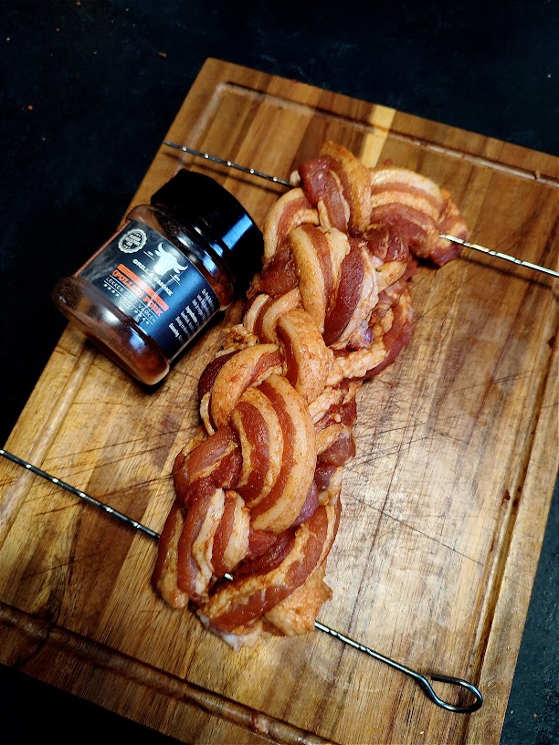 - Voeg nu de rookhout toe en leg de gevlochten buikspek op de bbq.