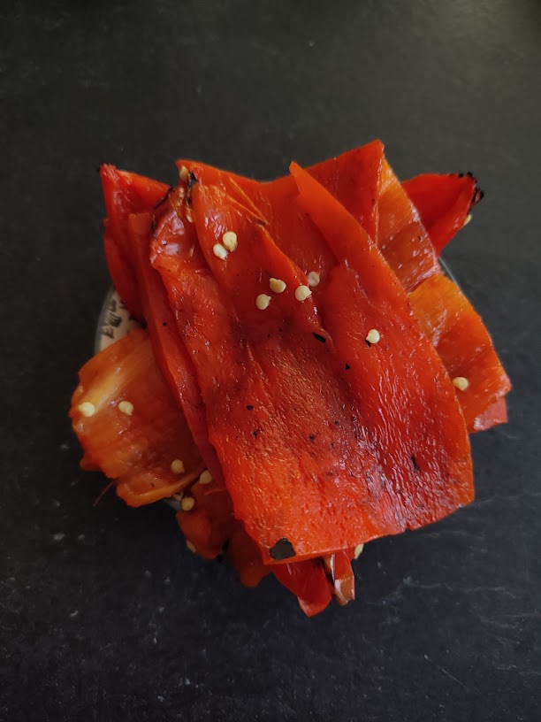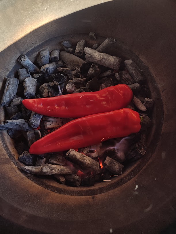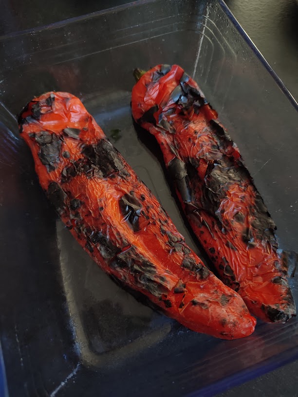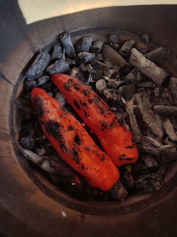 - Leg de paprika in zijn geheel direct op de kolen tot ze volledig zwart zijn en doe ze in een bak en dek deze af.
