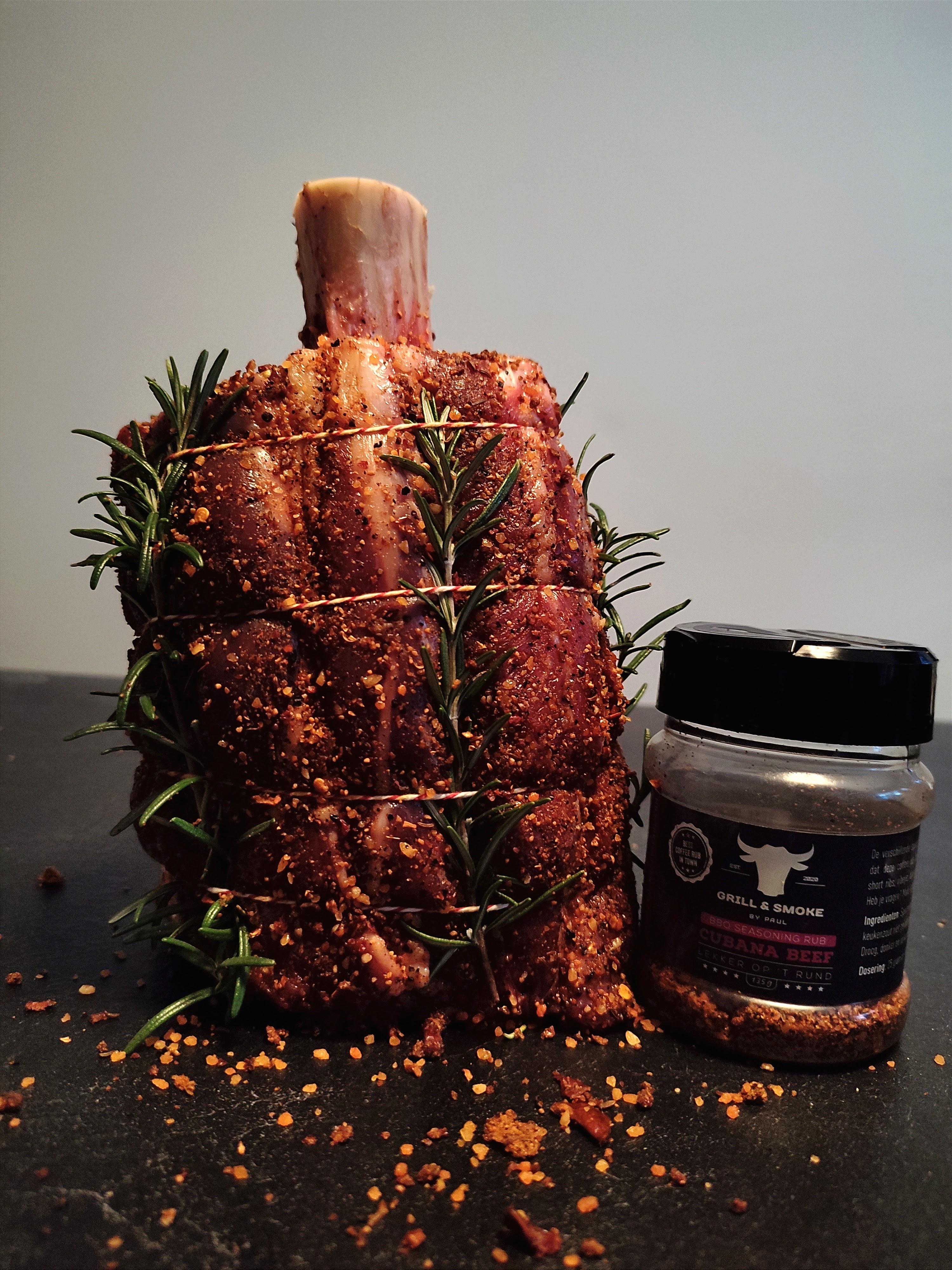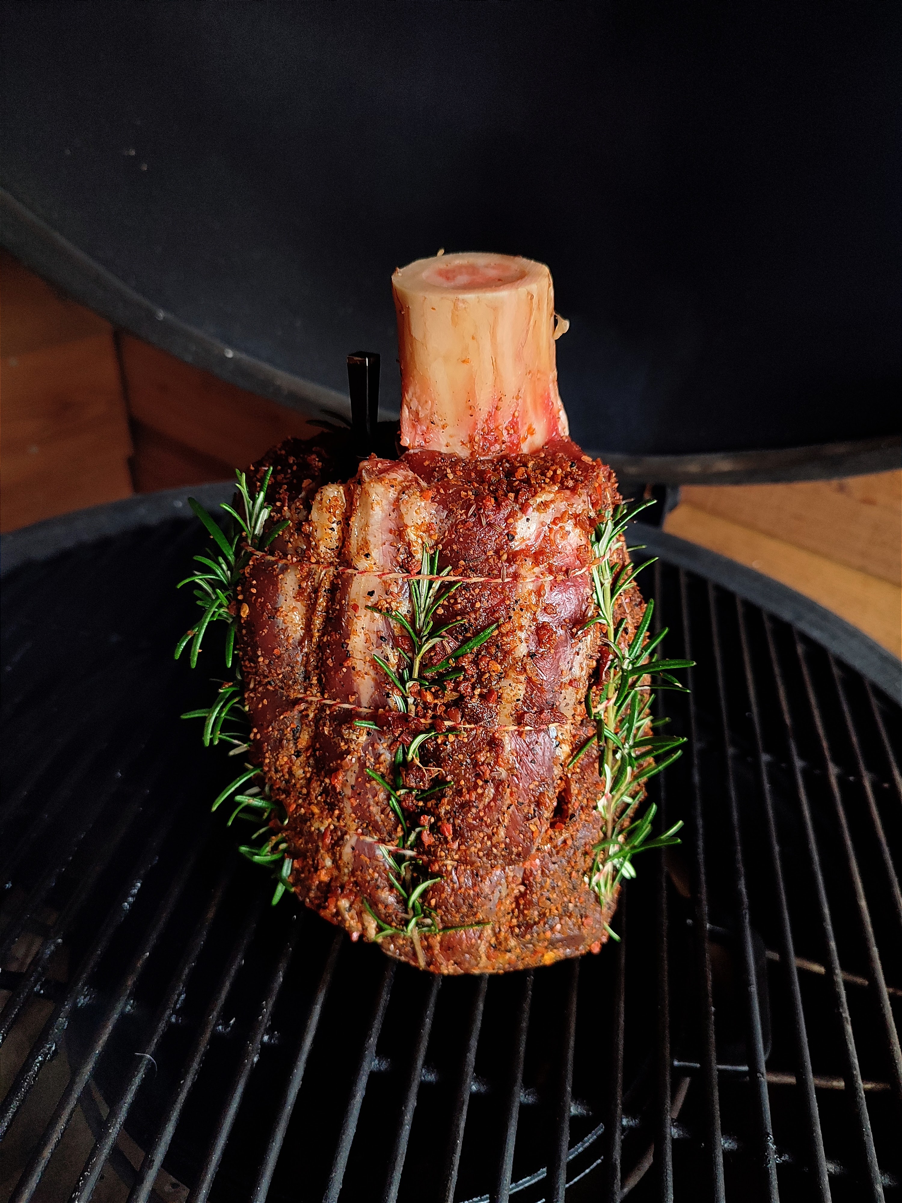 - Verdeel de rozemarijn takjes over de beefhammer en bind deze nog op met slagerstouw.