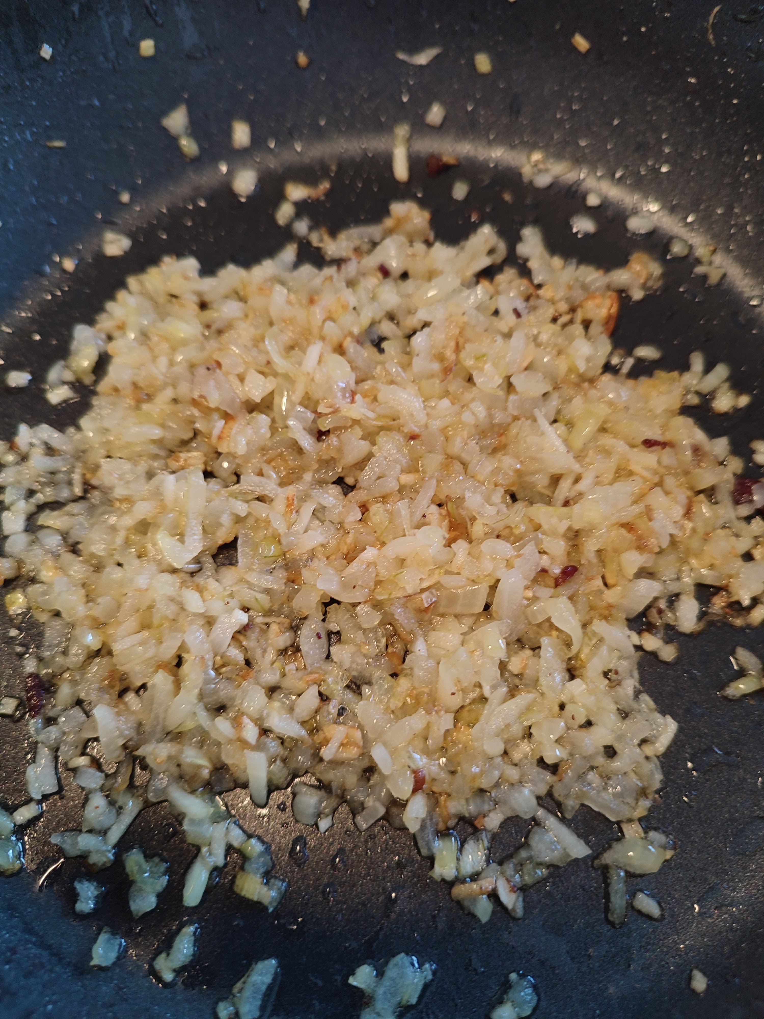 - Bak nu in die zelfde pan op laag vuur heel rustig de ui en knoflook tot een geel bruinige kleur.