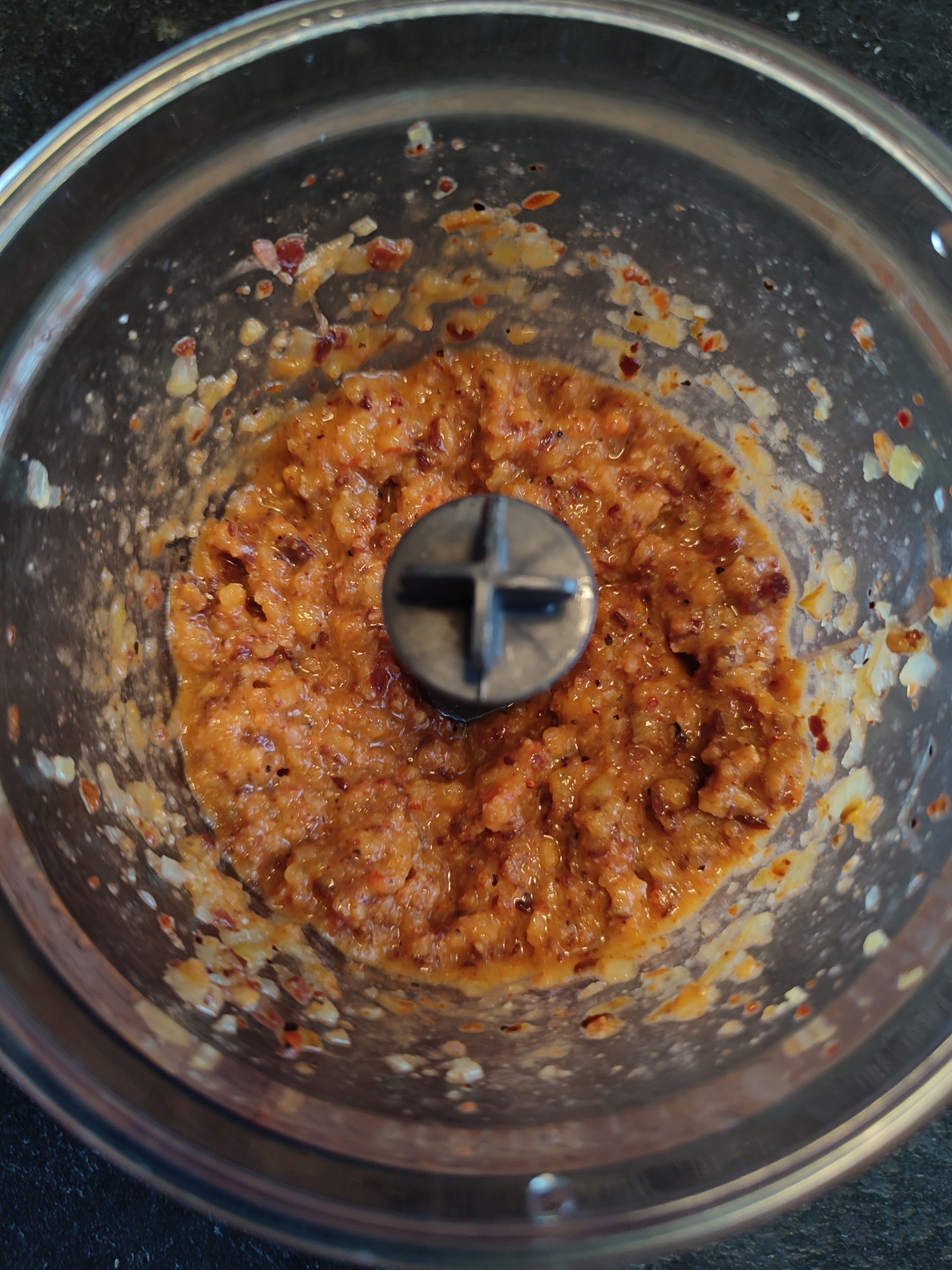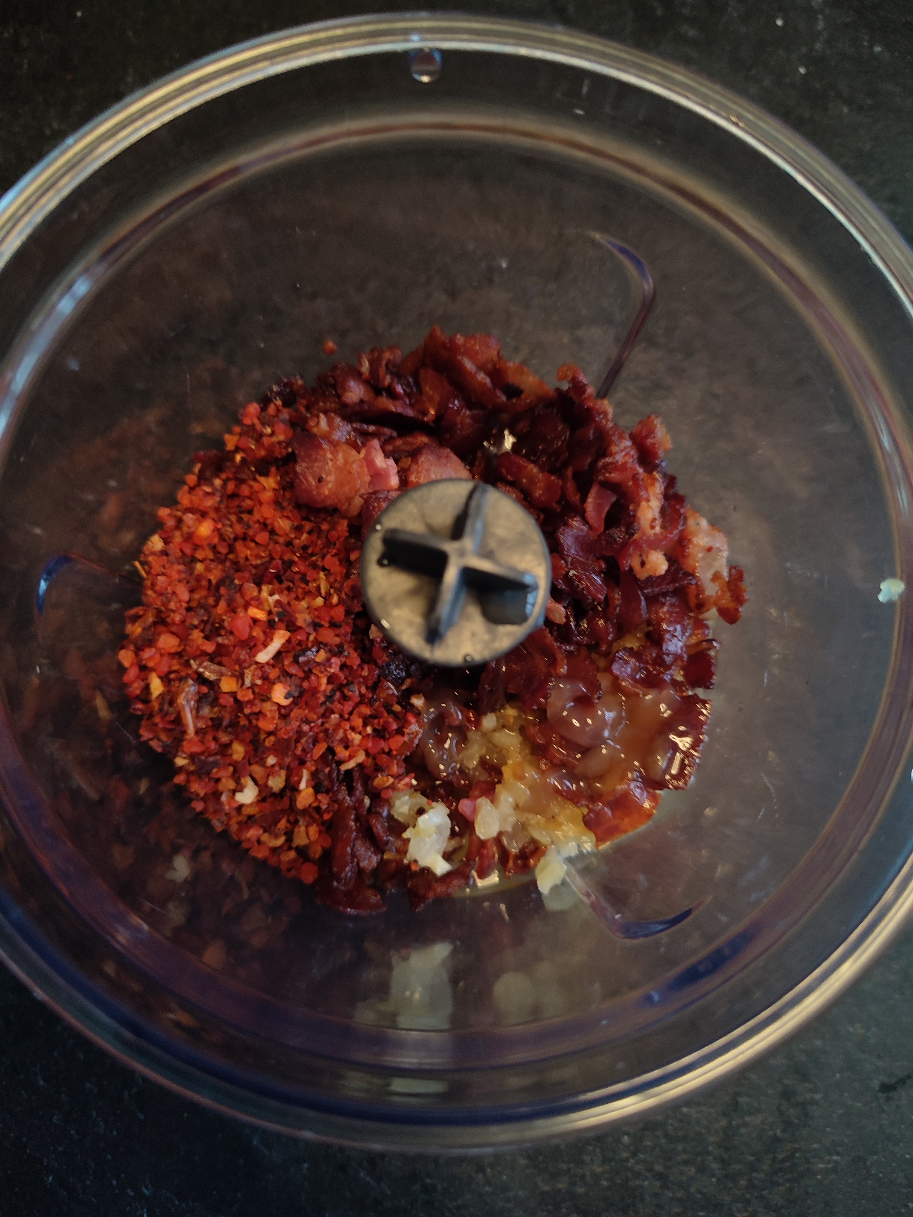 - Doe nu in een keuken machine de krokante spek, ui knoflook mengsel, rub, paprika poeder, mosterd poeder en de azijn.