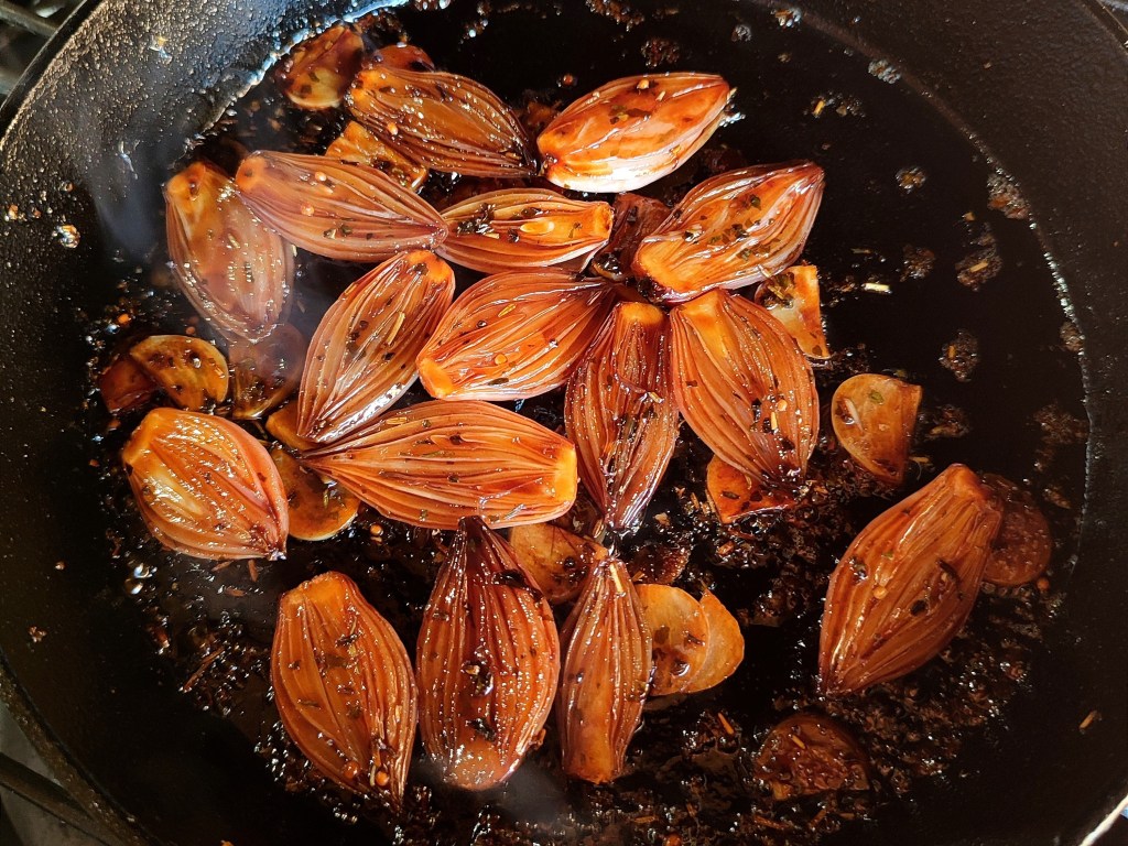 - Bak nu de sjalotten op de door gesneden kant een beetje aan en laat de glaze wat inkoken.