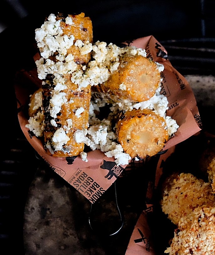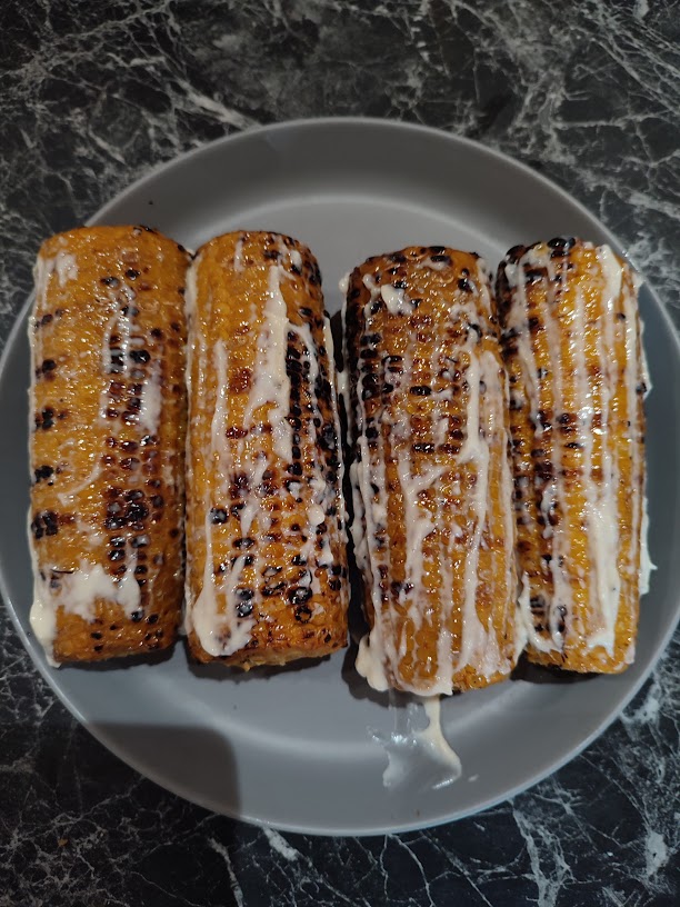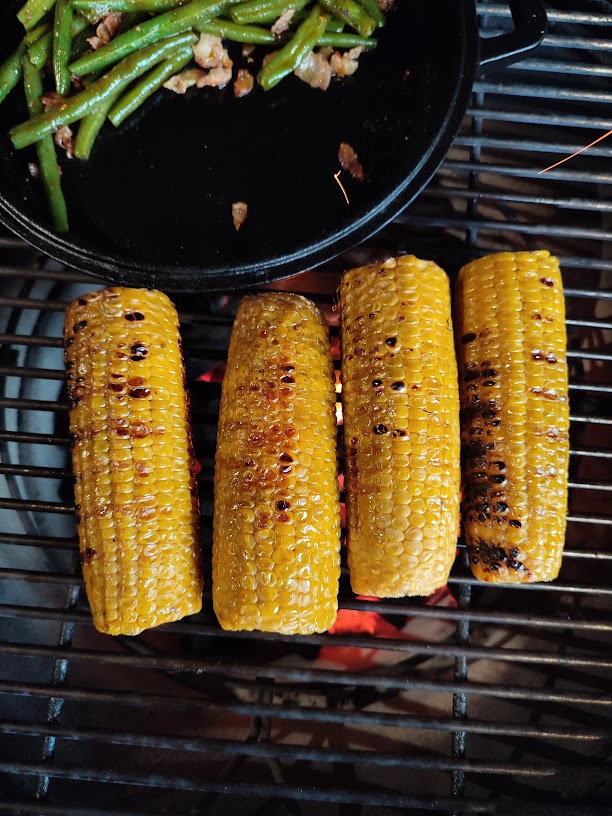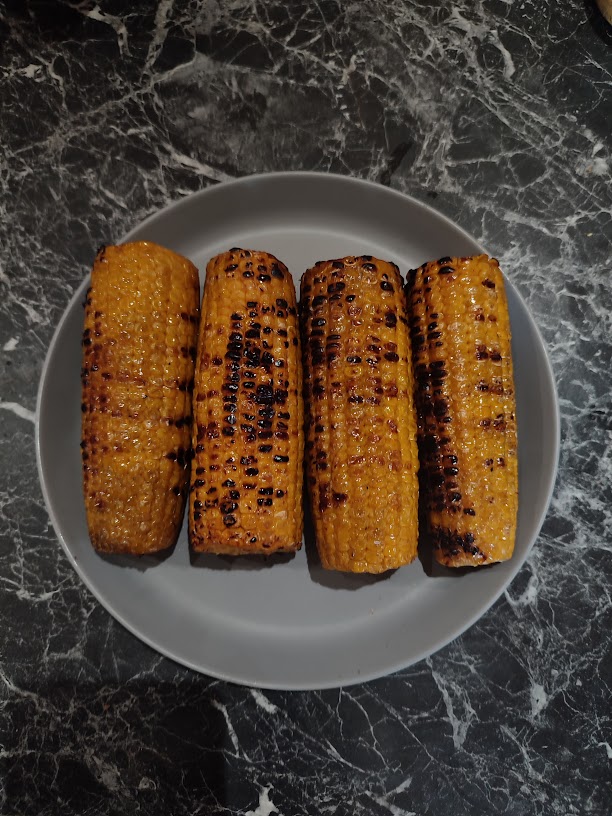 - Grill de maiskolven 10 min met regelmatig draaien direct op de bbq.