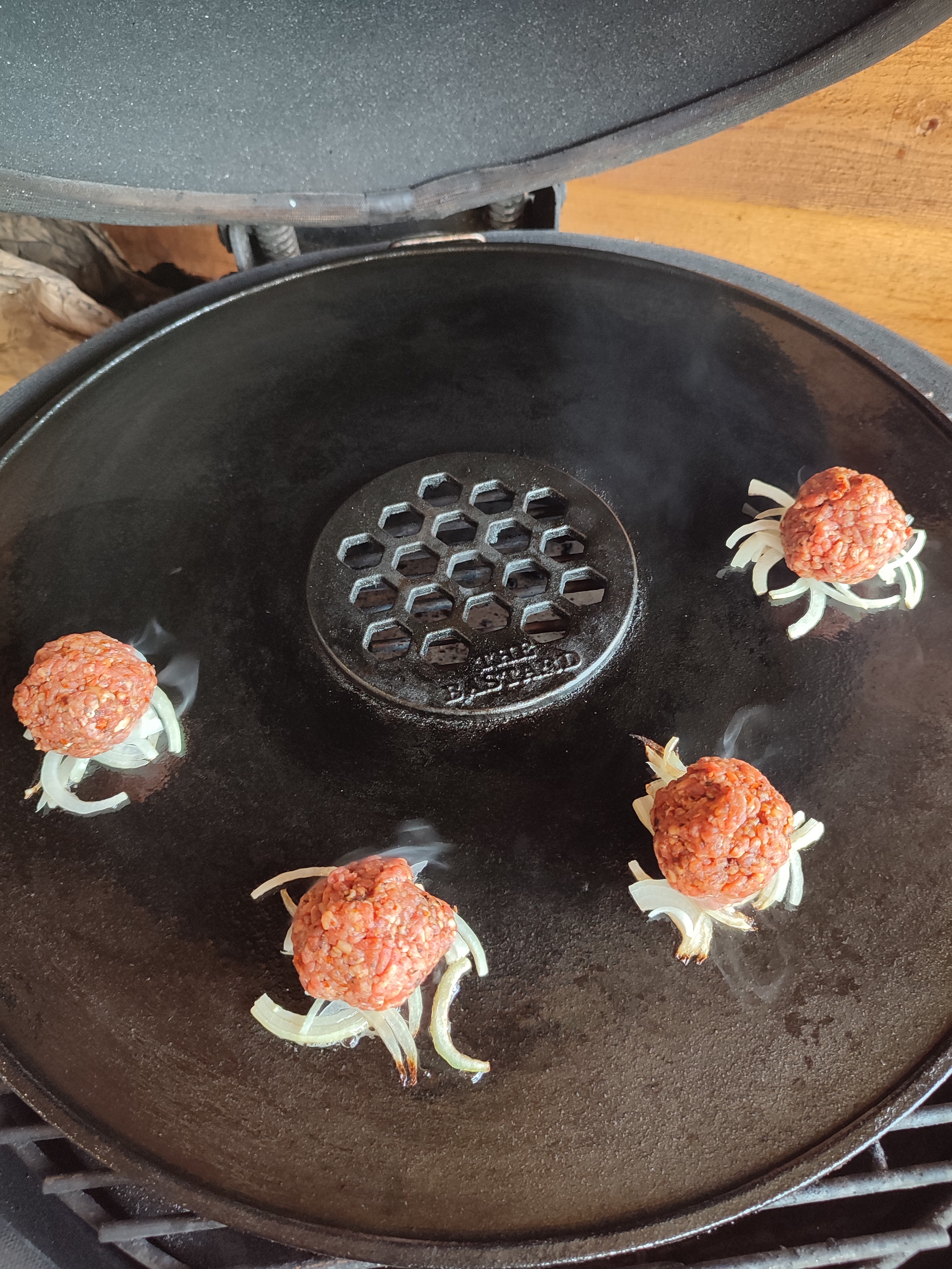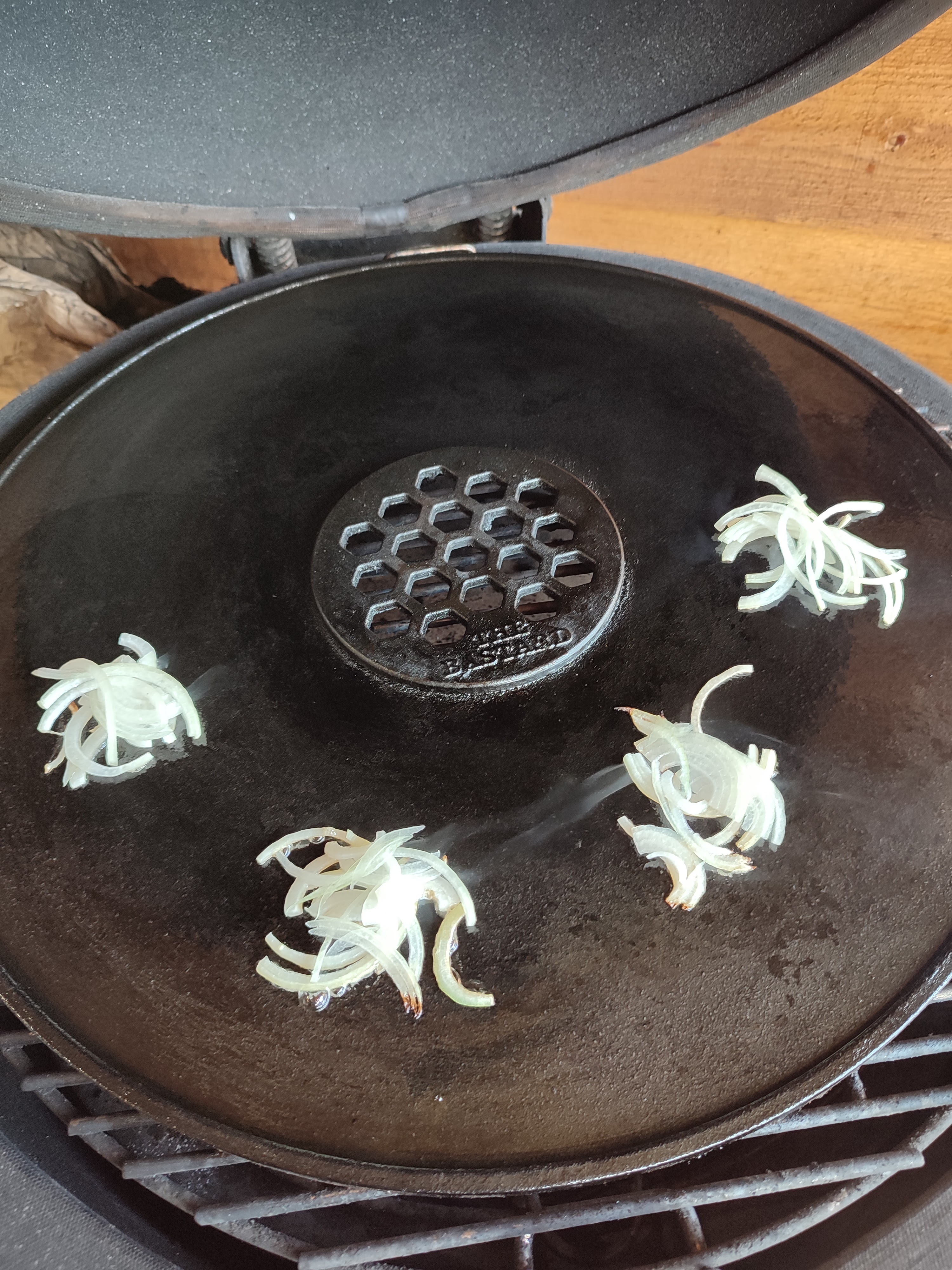 - Als de plaat of skillet op directe gedeelte goed warm is leg dan op een paar plekjes een beetje ui.