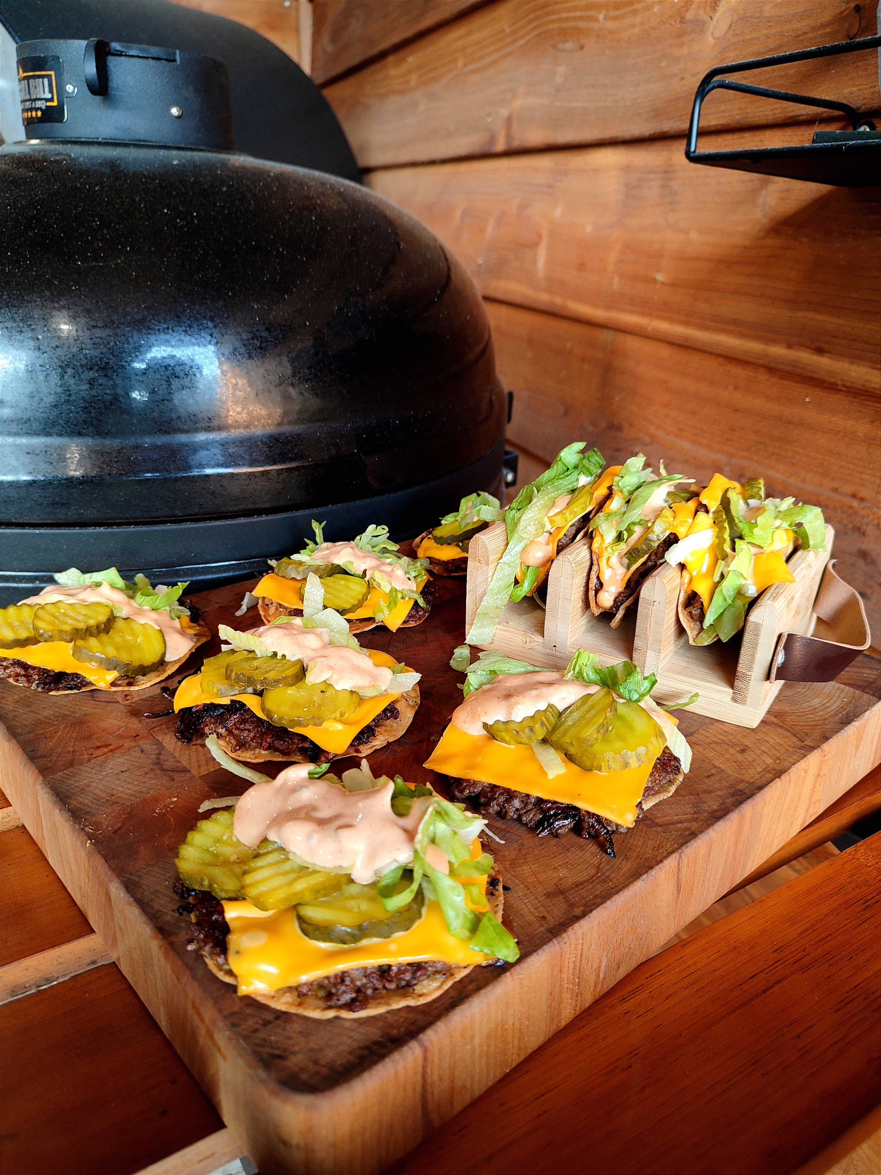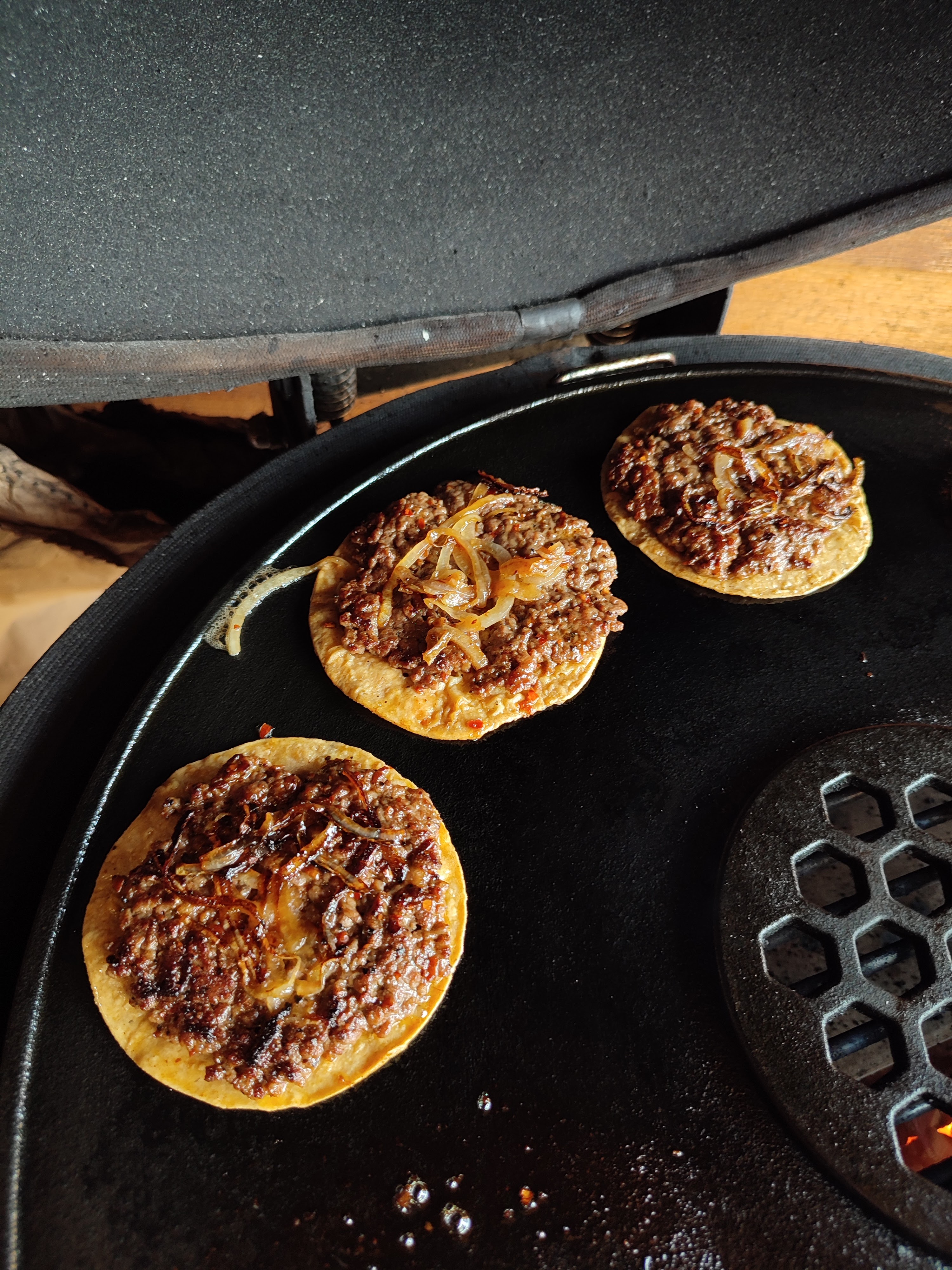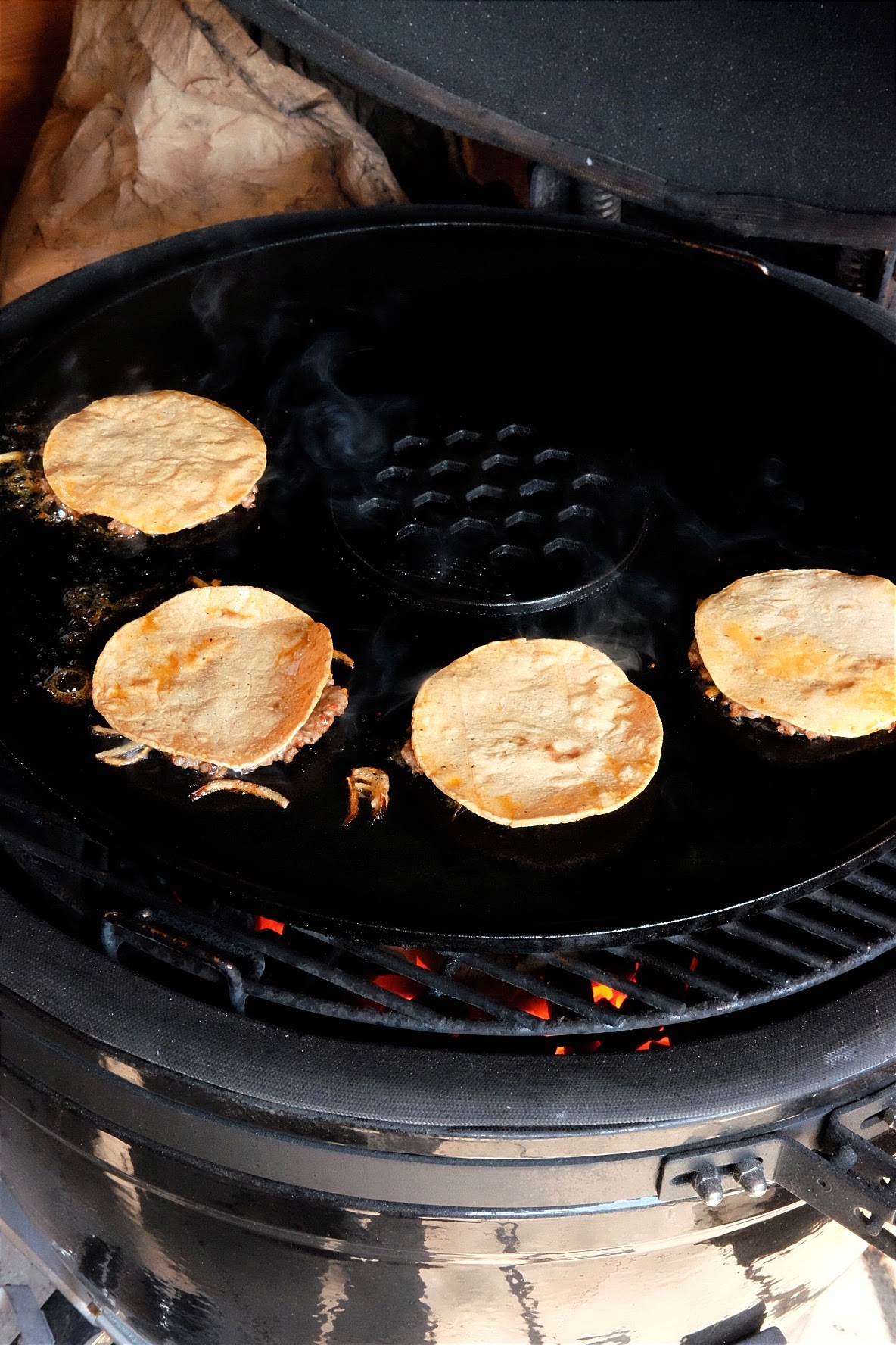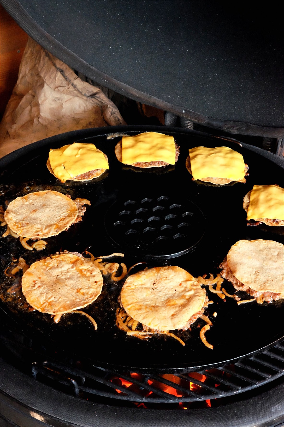 - Steek er nu een spatel onder en draai ze om samen met de taco en leg ze nu in de skillet of gedeelte waar de indirecte hitte is.