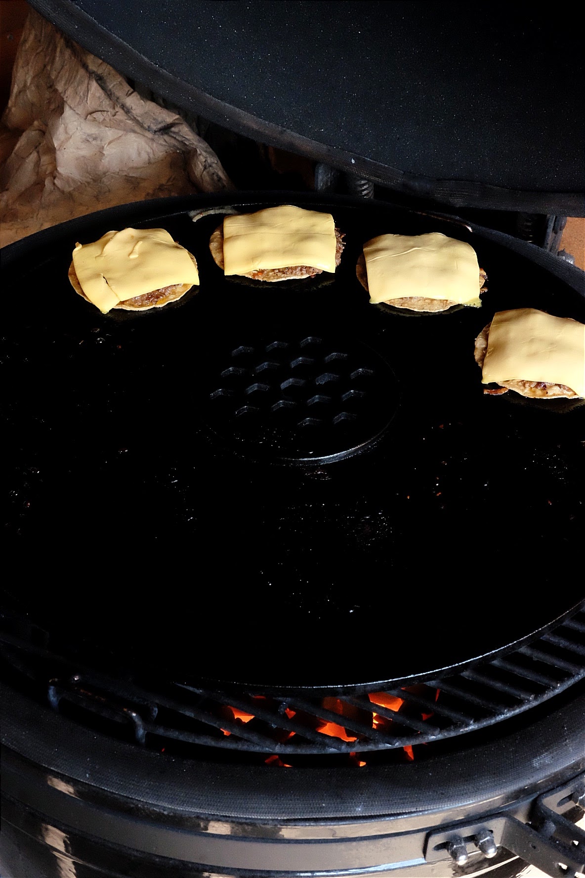 - Leg per hamburger nu een plak cheddarkaas op en laat deze smelten.
