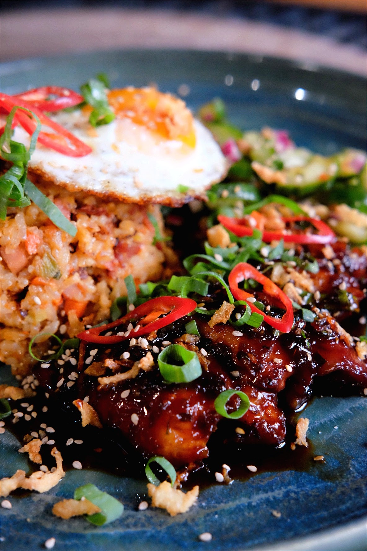 - Garneer de dijen af met de bosui, chilipeper en sesam.