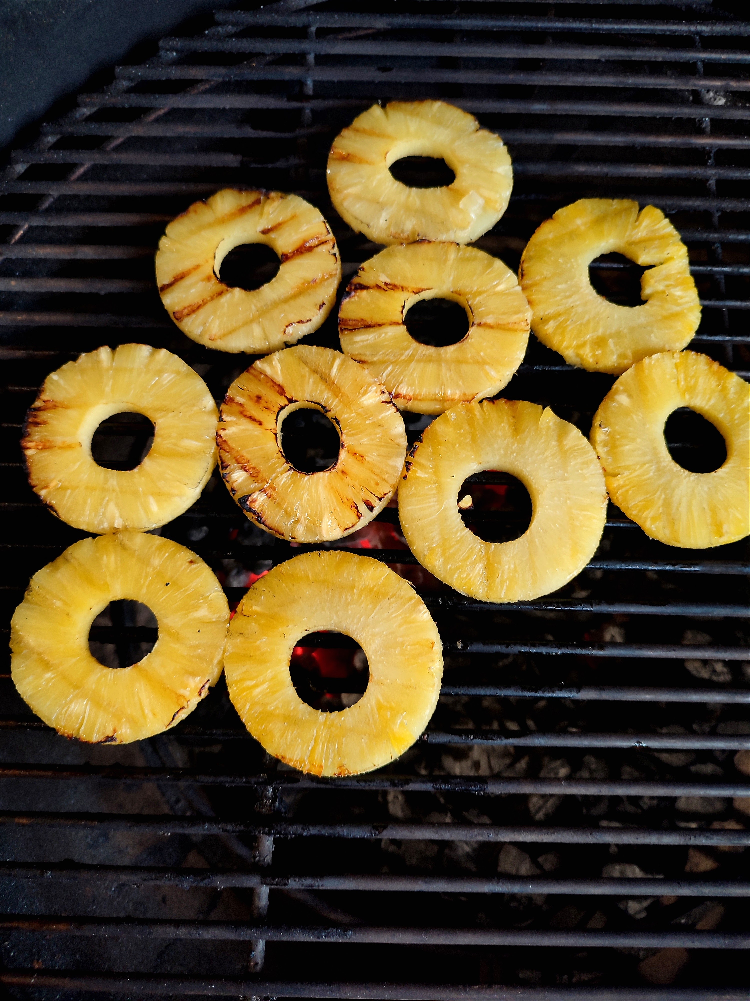 - Als de kolen warm zijn bbq de ananas direct boven de kolen tot ze een mooi kleurtje hebben.