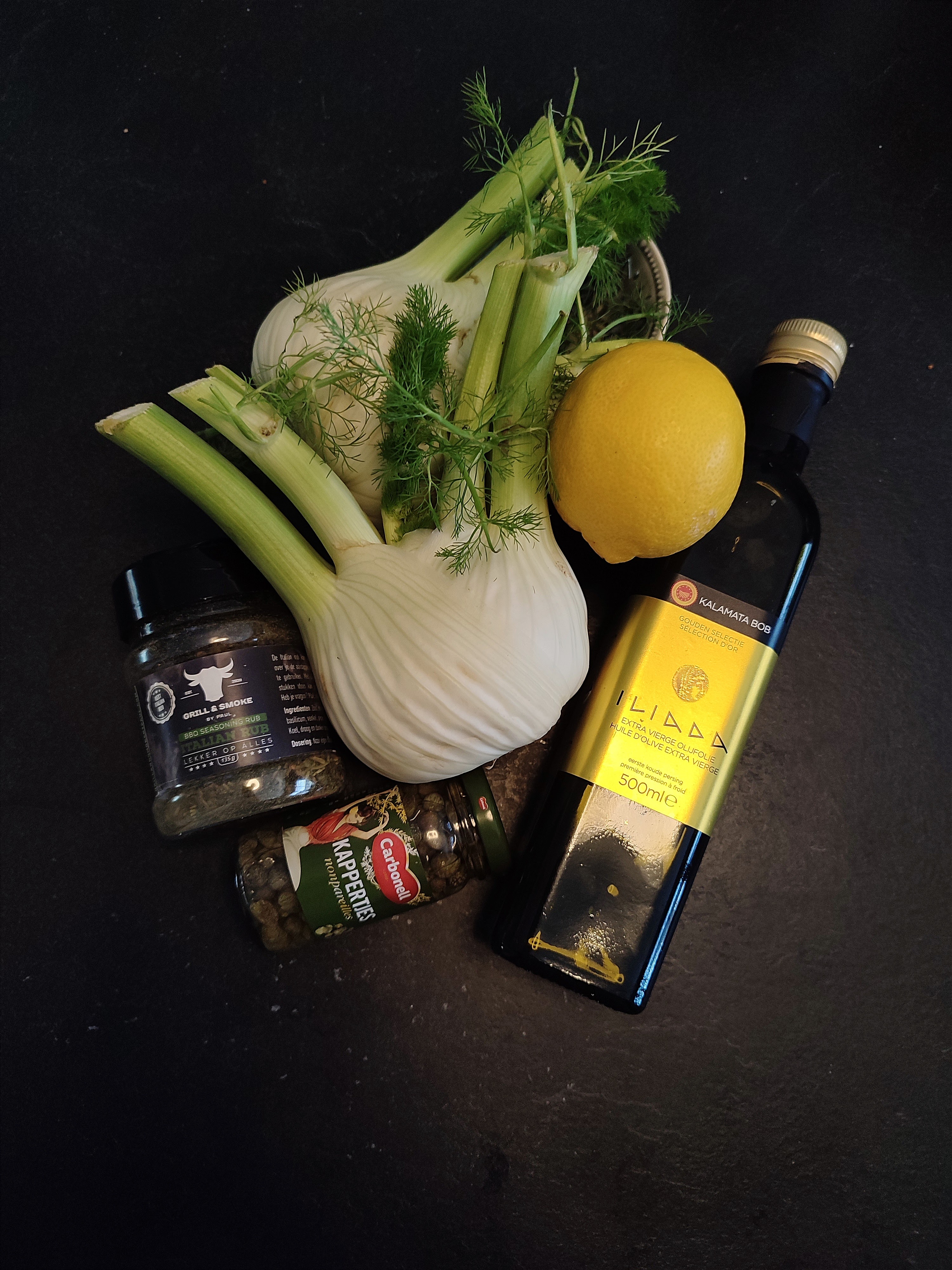 - Meng nu de rub, kappertjes, citroenrasp en sap en 3 el. van de olijfolie.