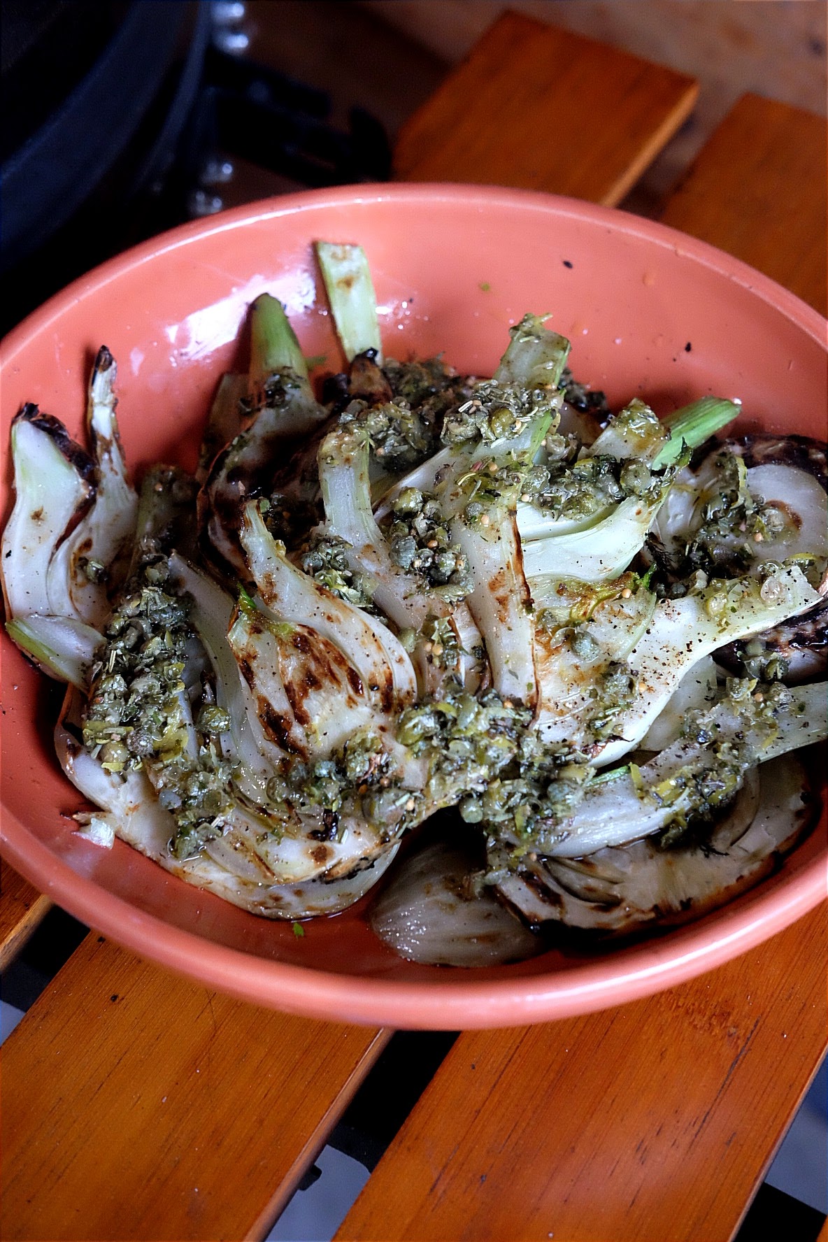 - Haal de venkel van de bbq en leg op een bord of schaal en verdeel de dressing eroverheen.
