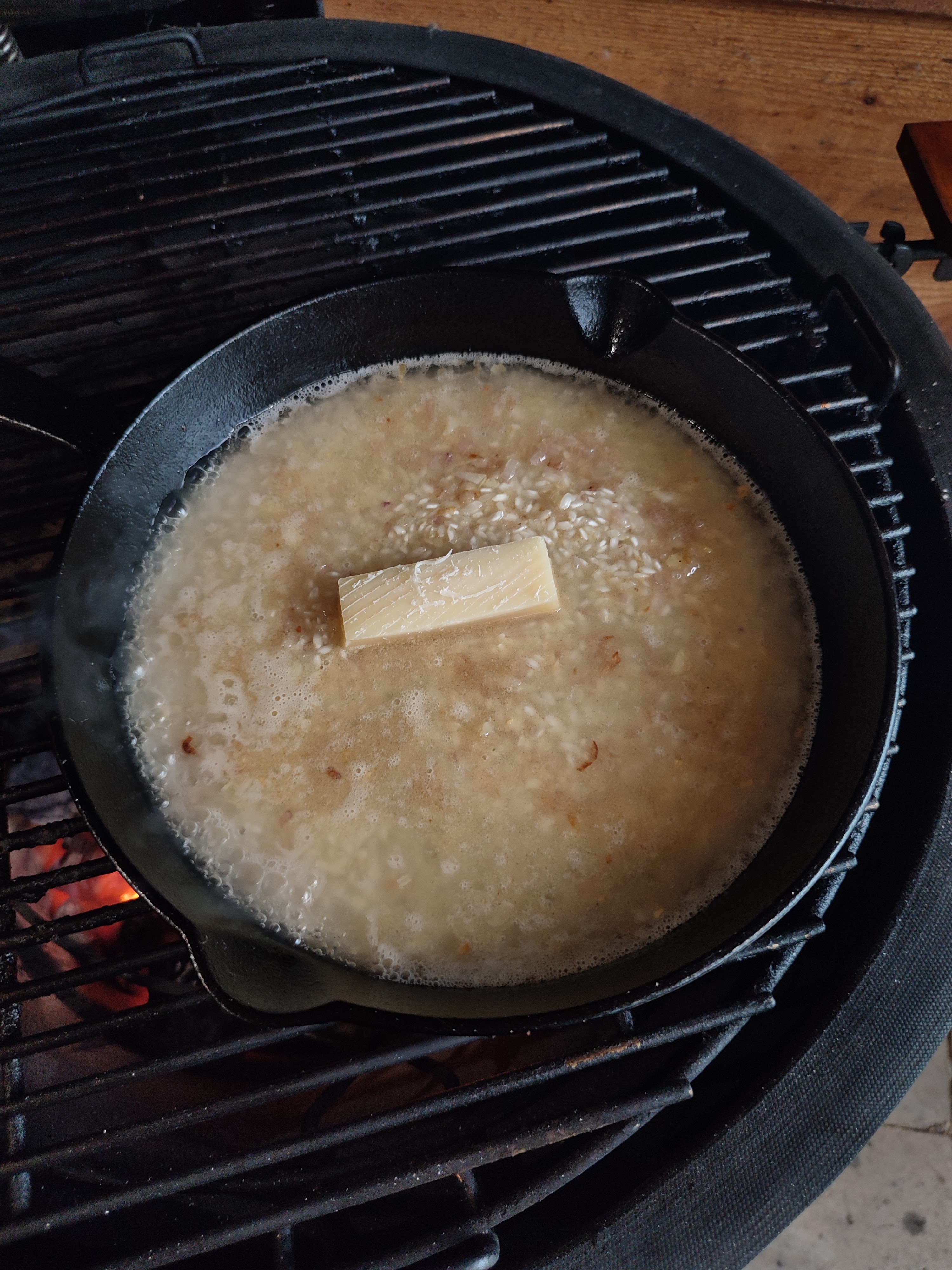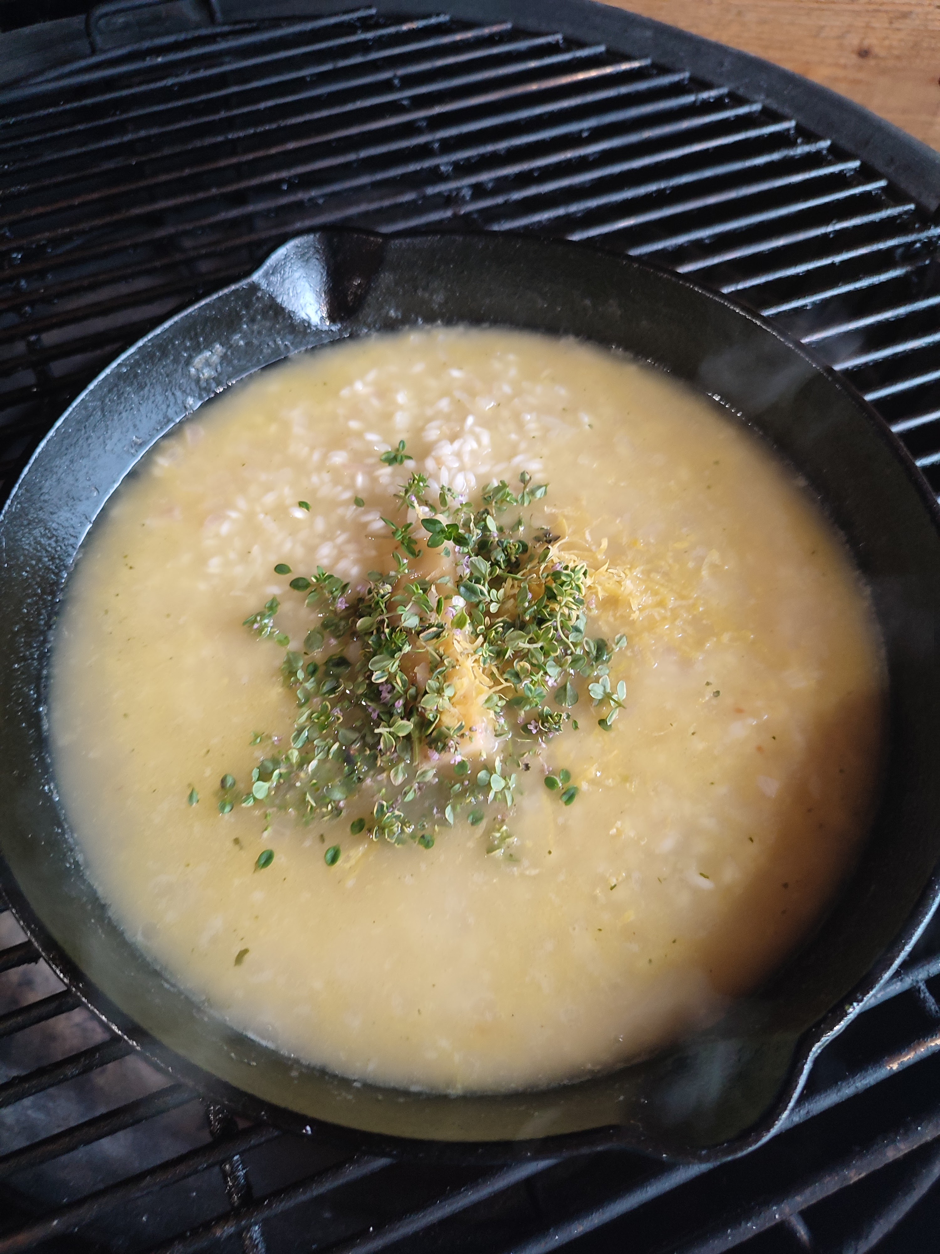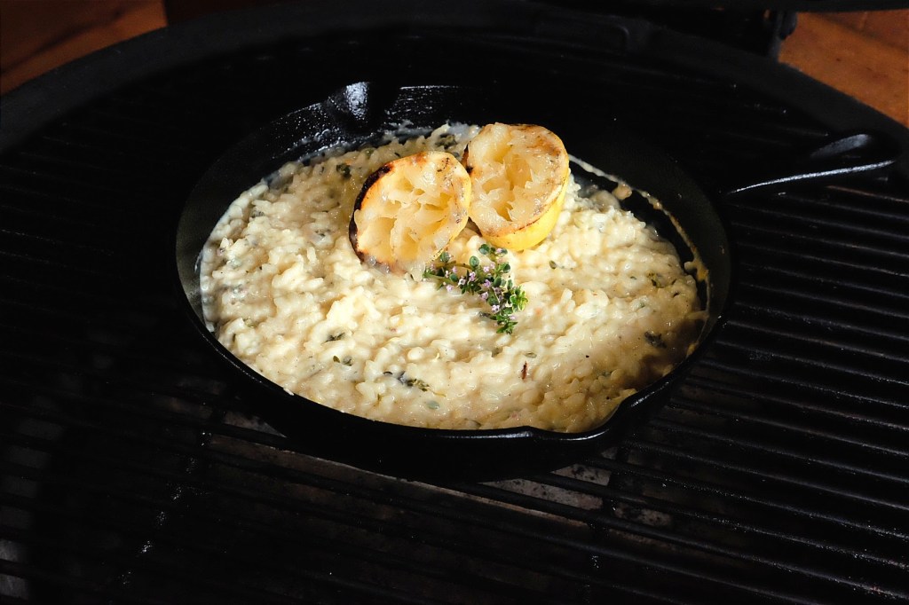 - Haal nu van de bbq en doe de creme fraiche, kaas en de rest van de tijm bovenop de risotto en dek af.