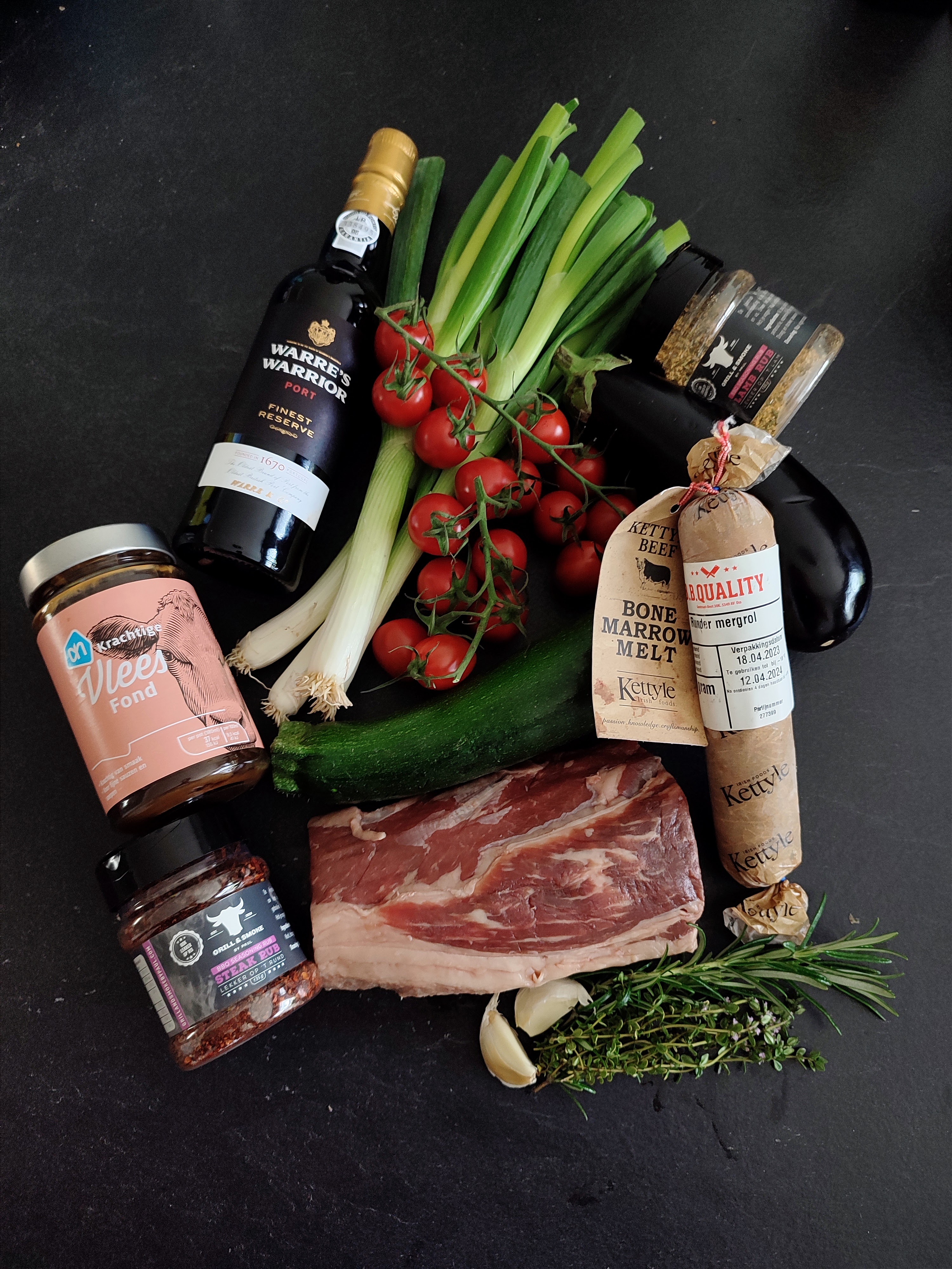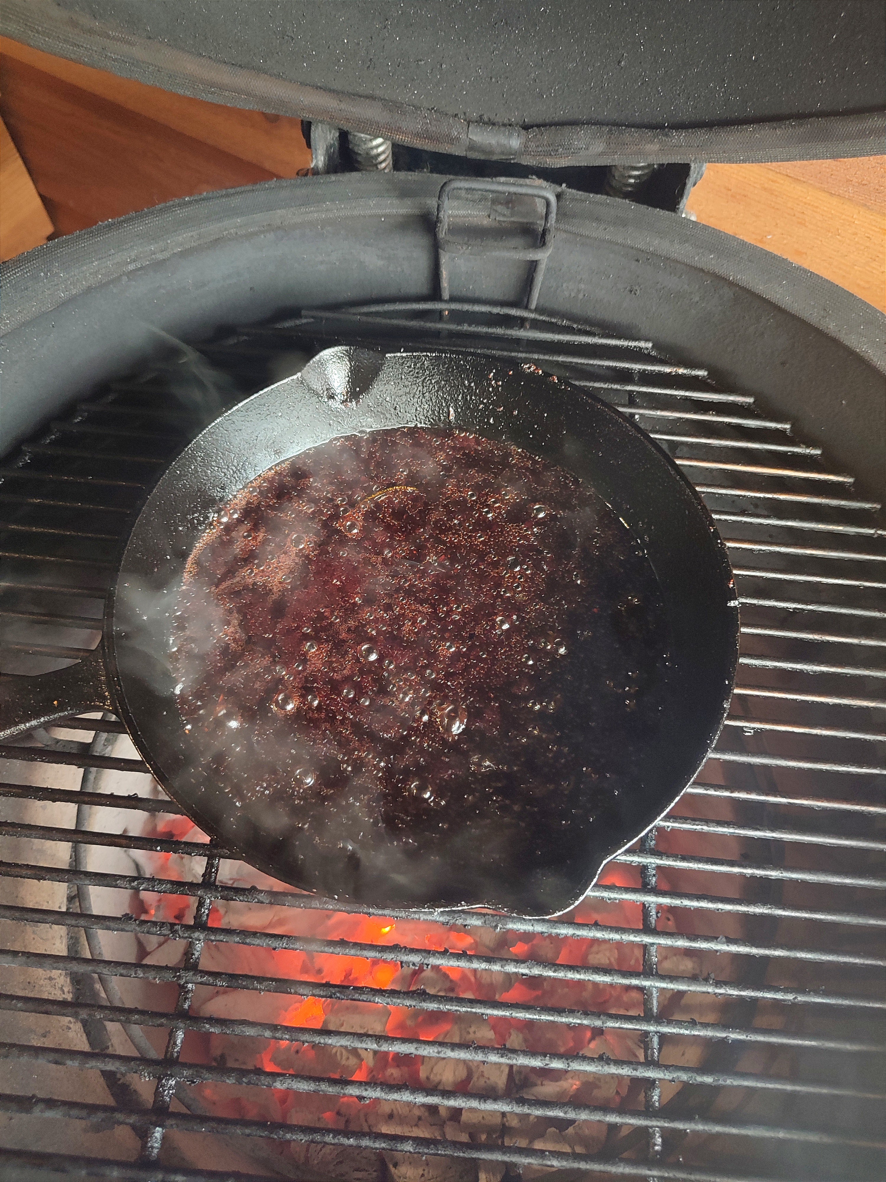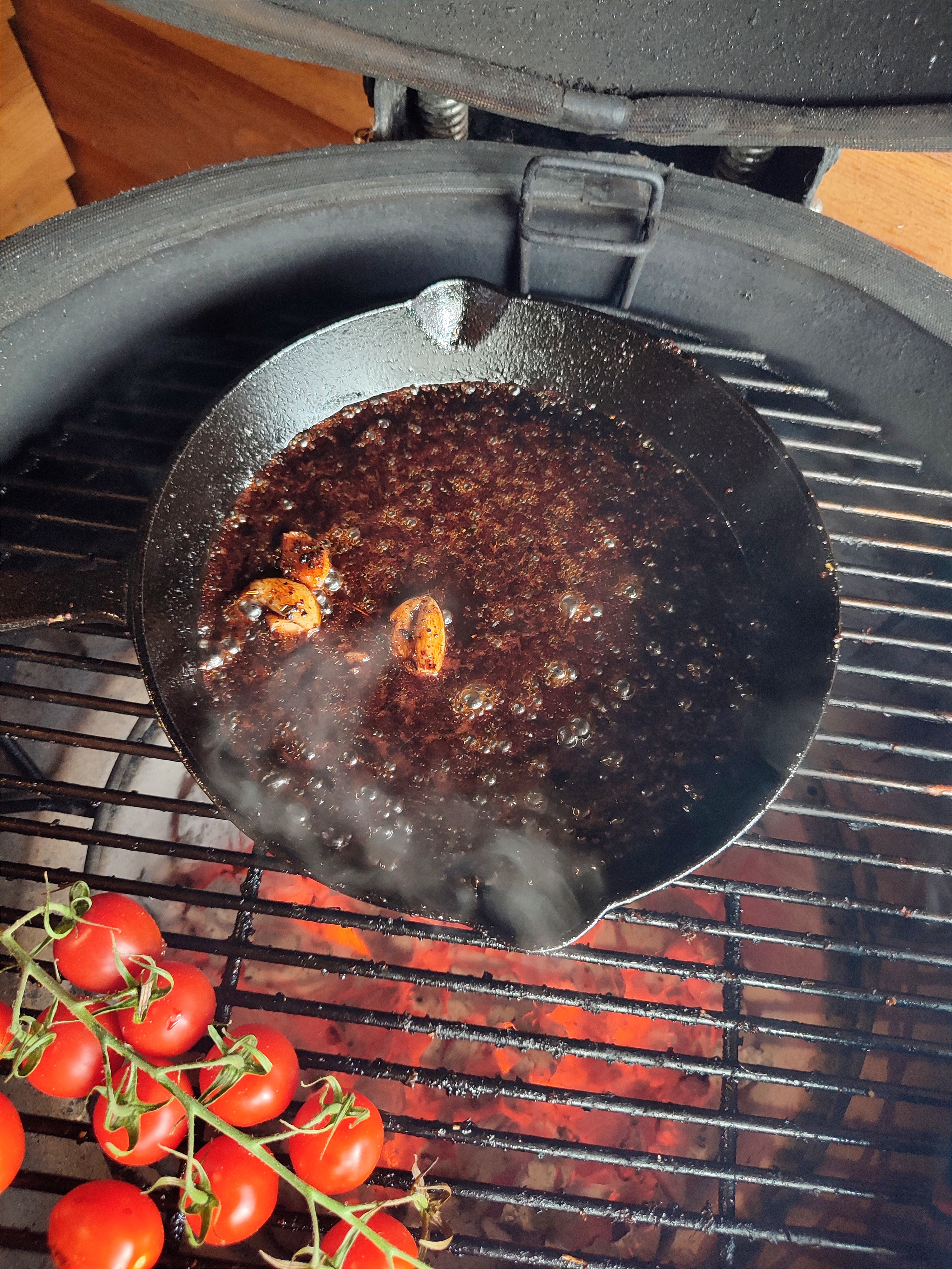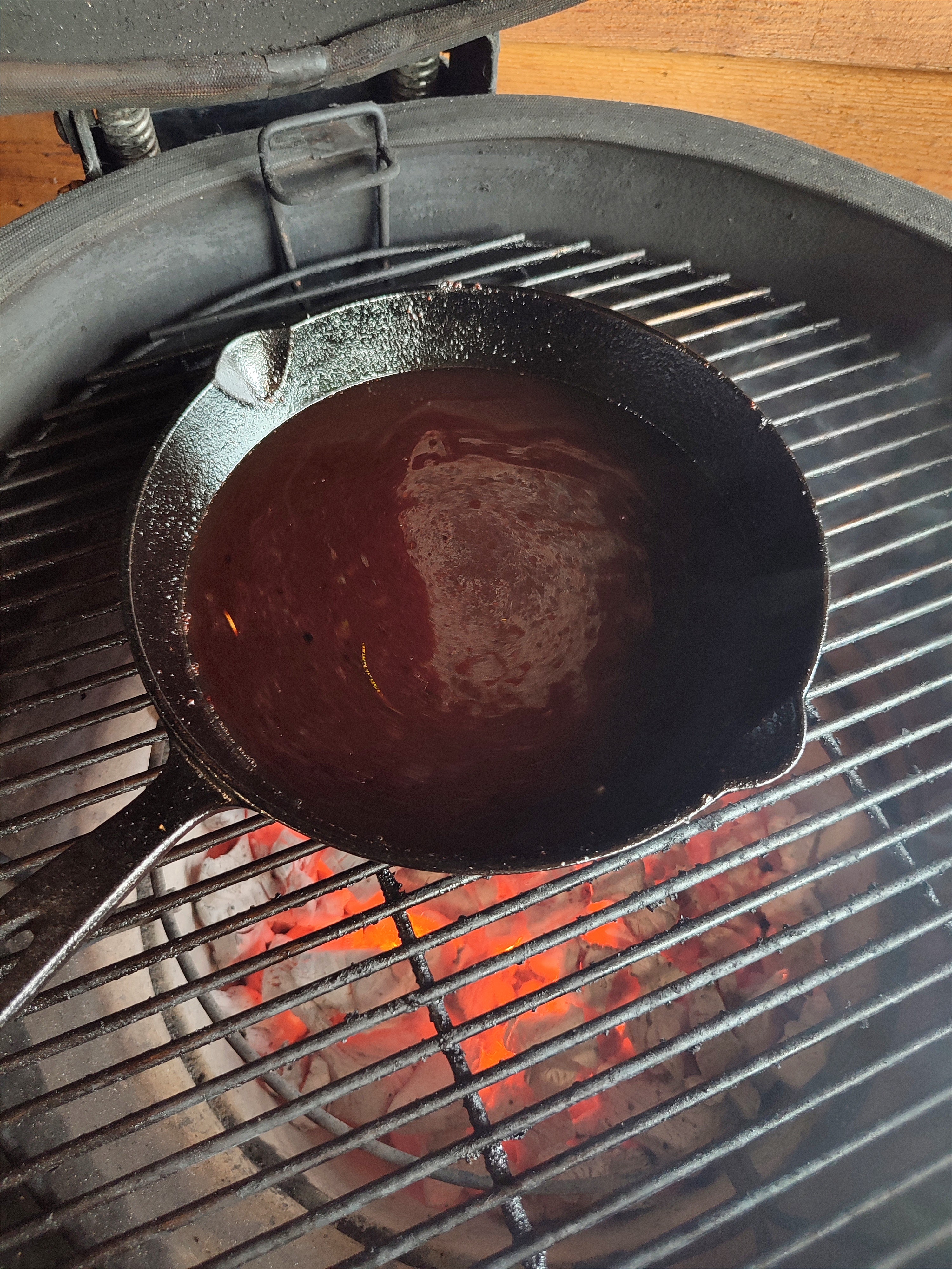Nu kun je de platesetter van de indirecte helft uit de bbq halen. Zet de skillet nu direct boven de hete kolen met de knoflook en de jus van de beenmerg en vlees er nog in. Giet nu voorzichtig de rode port erbij. Breng dit aan de kook en laat tot 1/3de inkoken. Als je nog een 1/3de over hebt en de port is mooi stroperig voeg dan de fond doe. Breng dit weer terug aan de kook en laat dit dan weer inkoken tot de helft. Breng de saus nu op smaak met peper en zout indien nodig.