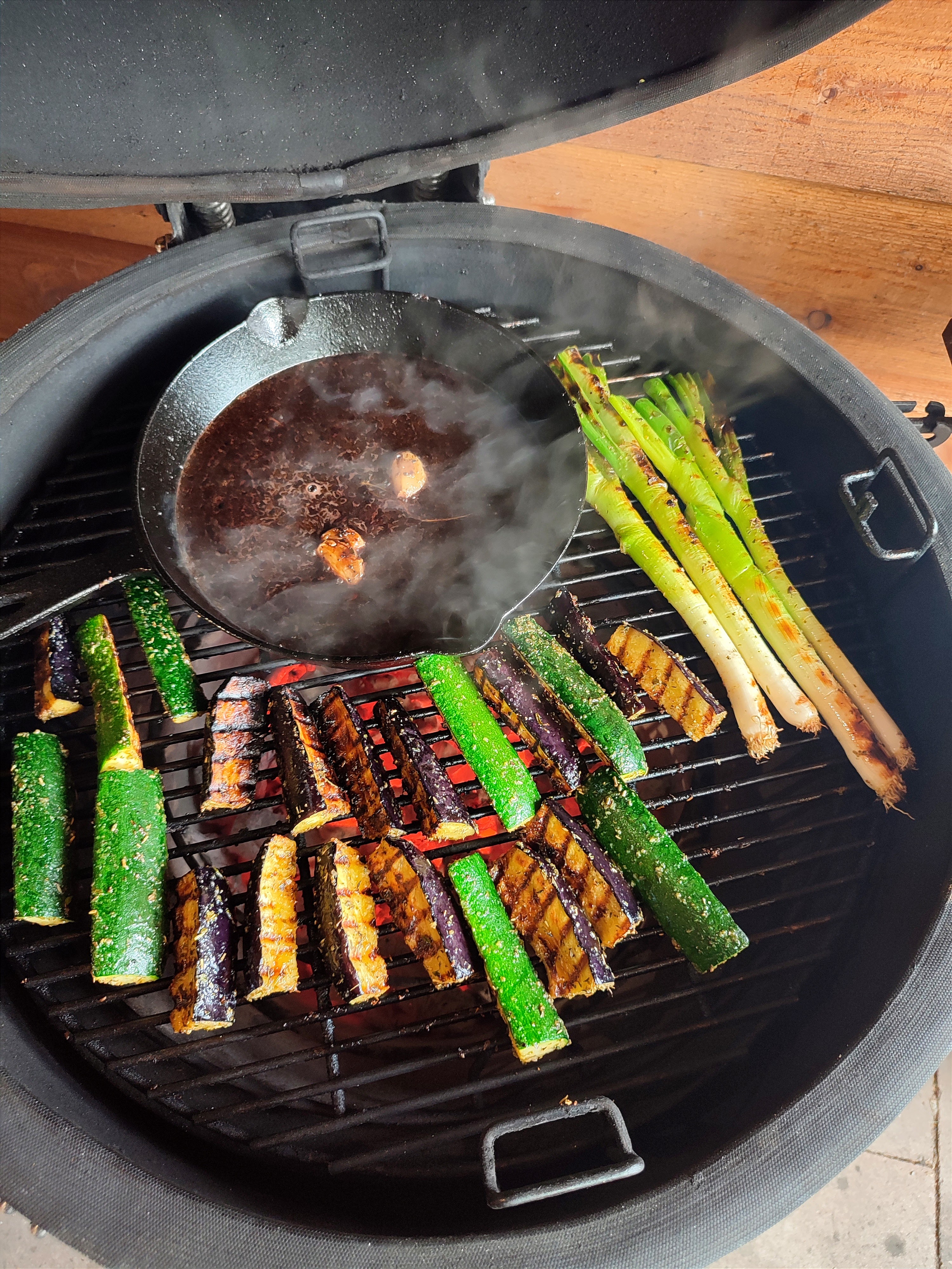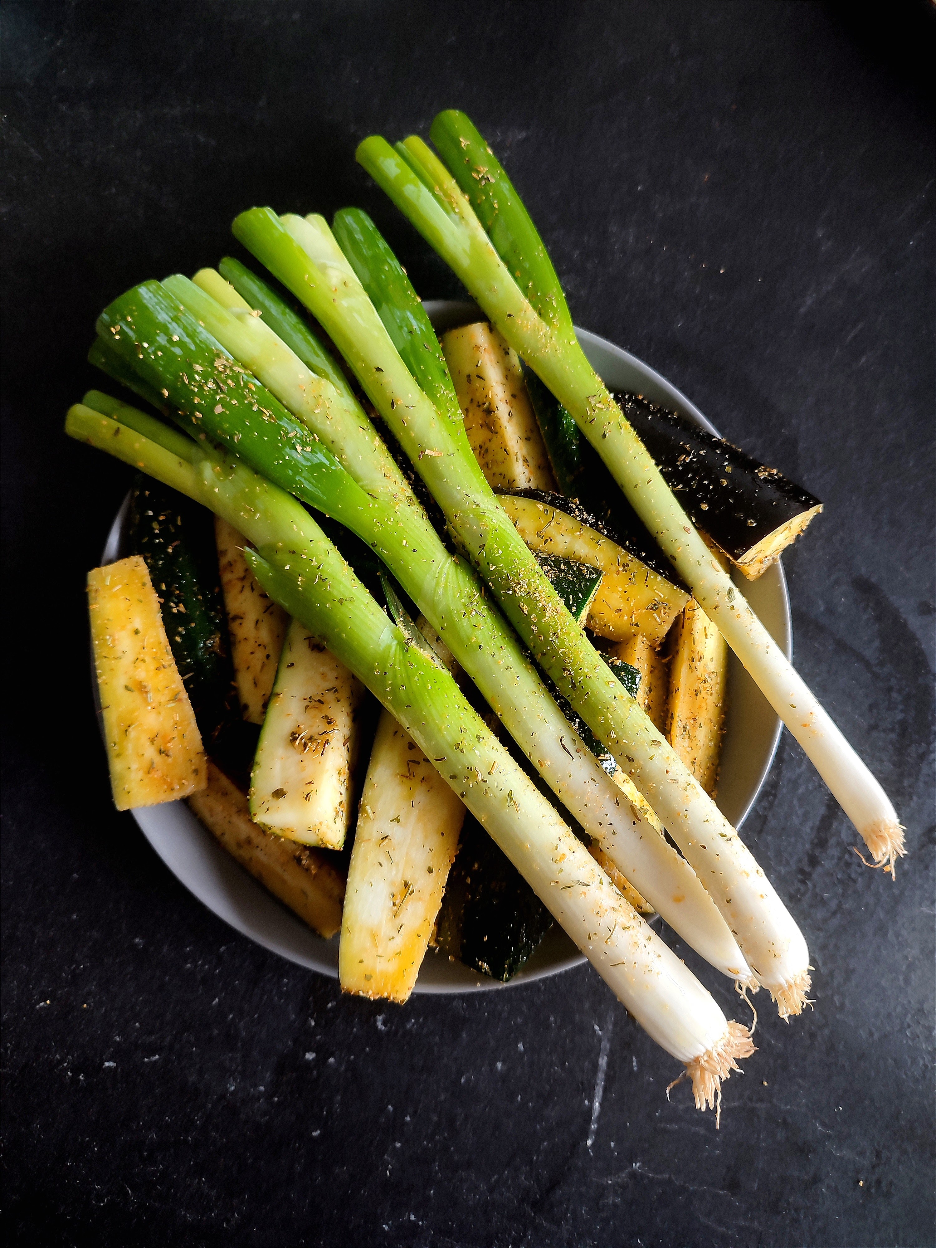Haal bij de bosui een gedeelte van het groen eraf bewaar dit en gebruik dit een in ander gerecht en haal eventueel de droge buitenste blad eraf. Voor de courgette en de aubergine snij eerst de uiterste beide einde eraf snij daarna in de breedte door de midden zodat iets kortere stukken hebt. Snijdt ze nu in ongeveer gelijke parten. Doe de bosui, aubergine en courgette in een kom en giet er een goed grote scheut olijfolie erbij en doe de rub erbij meng dit goed door elkaar. Grill nu alle groenten direct boven de kolen ook de tomaten mogen direct gegrild worden. Draai ze regelmatig om tot ze overal mooie grill strepen hebben en de tomaatjes goed gepoft zijn.