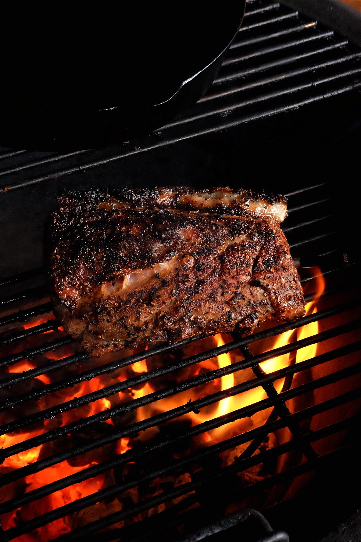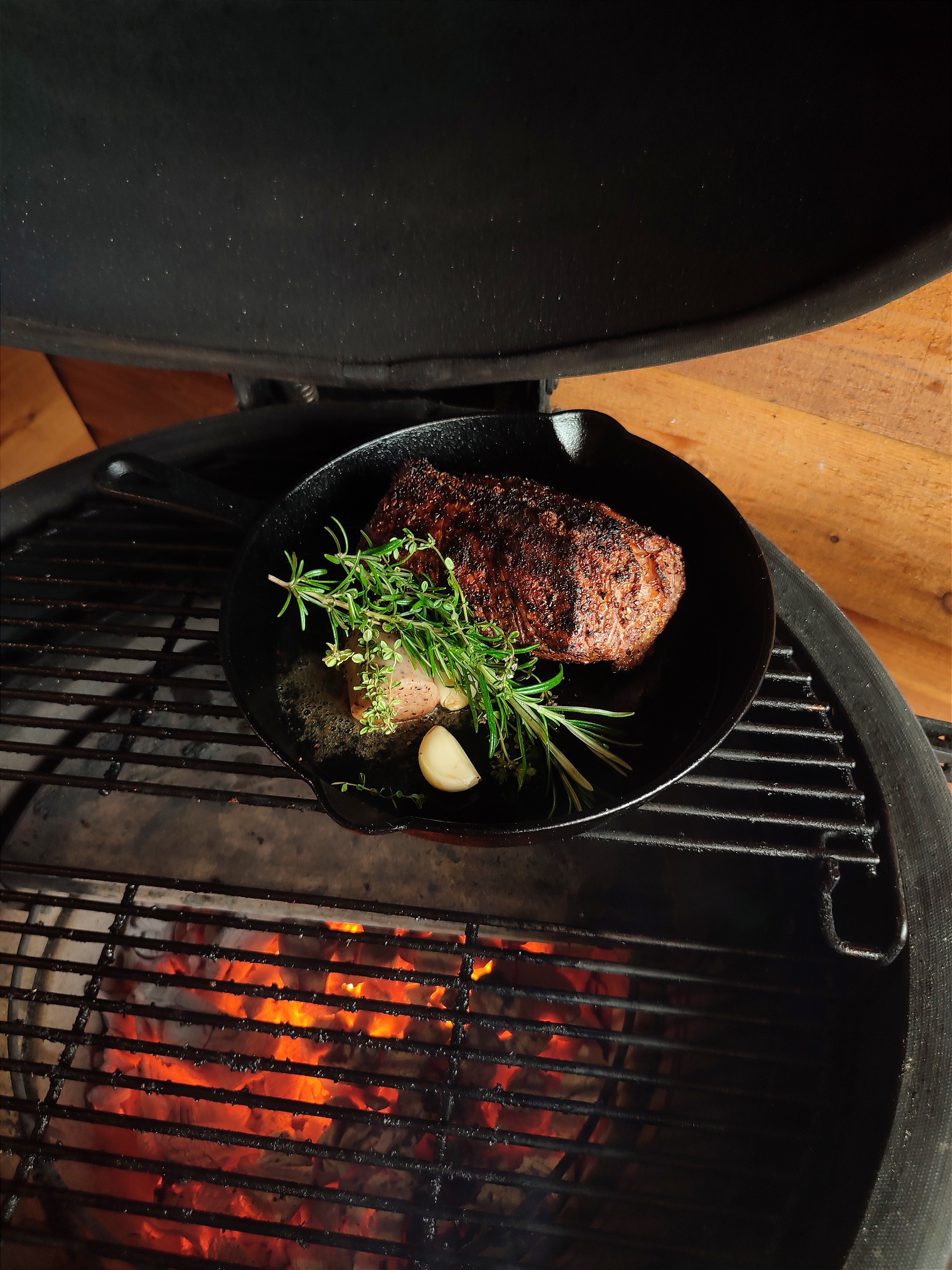 Haal de bife de tira ruim voor dat je hem gaat gebruiken uit de koelkast zodat deze al iets op temperatuur kan komen. Smeer het stuk vlees goed in met de steakrub zodat hij aan alle kanten goed gekruid is. Nu gaan we de bife de tira goed aan grillen boven de heten kolen begin eerst met het vet naar beneden. Als het vet mooi gekleurd is draai hem dan op een andere kant. Doe dit tot alle kanten mooi gekleurd zijn en een krokante korst aan de buitenkant zit. Plet nu de knoflook iets met een mes. Leg nu het stuk vlees in de skillet en doe er de beenmerg, knoflook, tijm en rozemarijn erbij. Als de been merg gesmolten is kun je om de paar minuten de sappen steeds met een lepel over het vlees gieten. Sluit tussendoor wel de deksel van de bbq. Gaar de bife de tira nu tot een kern van 48 graden. Haal het vlees uit de skillet en leg op een bord haal ook de tijm, rozemarijn uit de skillet en leg dit bovenop het vlees. Dek het vlees losjes af met wat aluminiumfolie en laat ongeveer 10 minuten rusten of tot alles klaar is.