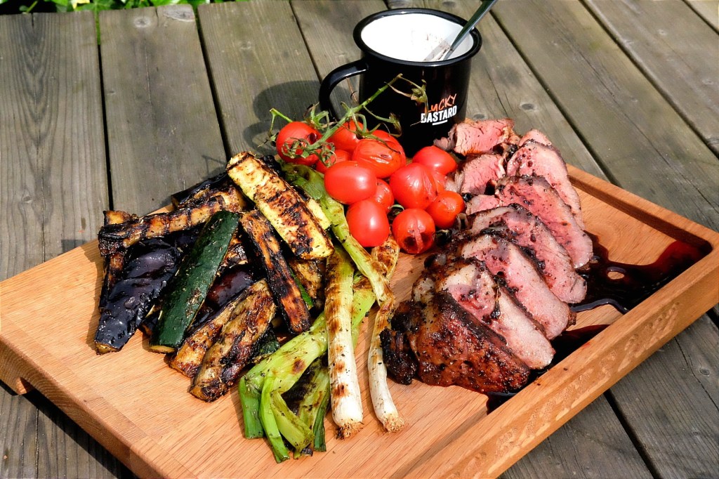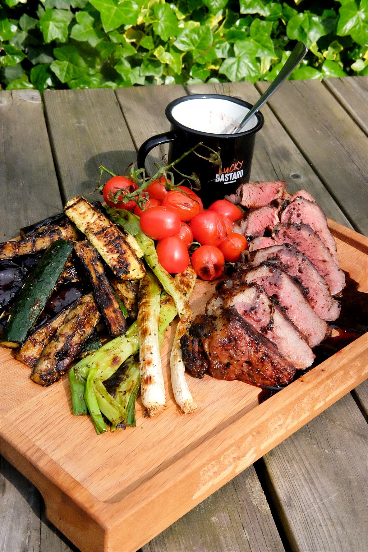 Leg alle groenten mooi verdeelt over een grote snijplank of bord. Na het rusten van het vlees kun je deze mooi snijden in plakken en bij de groenten erbij leggen. Giet een gedeelte van de saus over het vlees en serveer de rest er nog extra bij.
