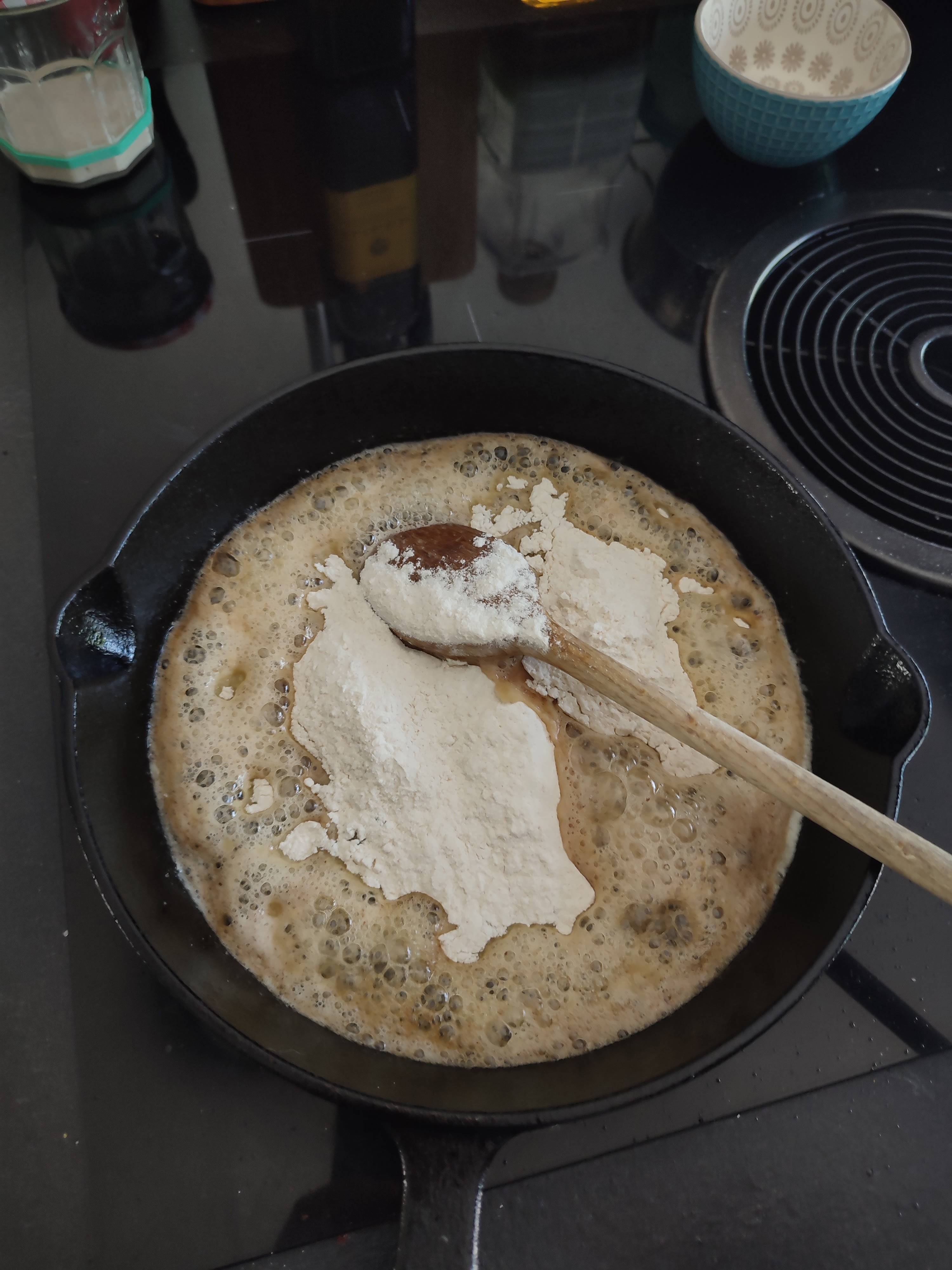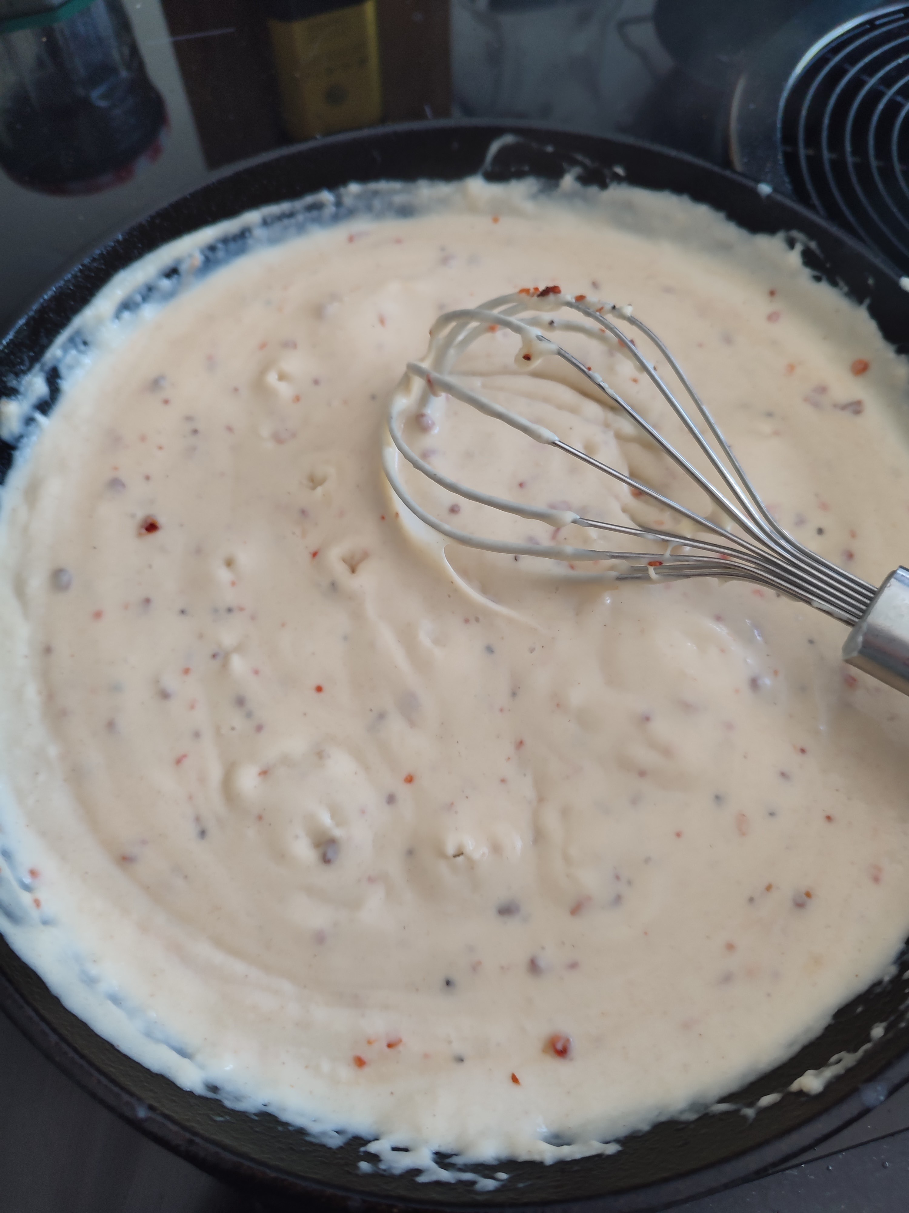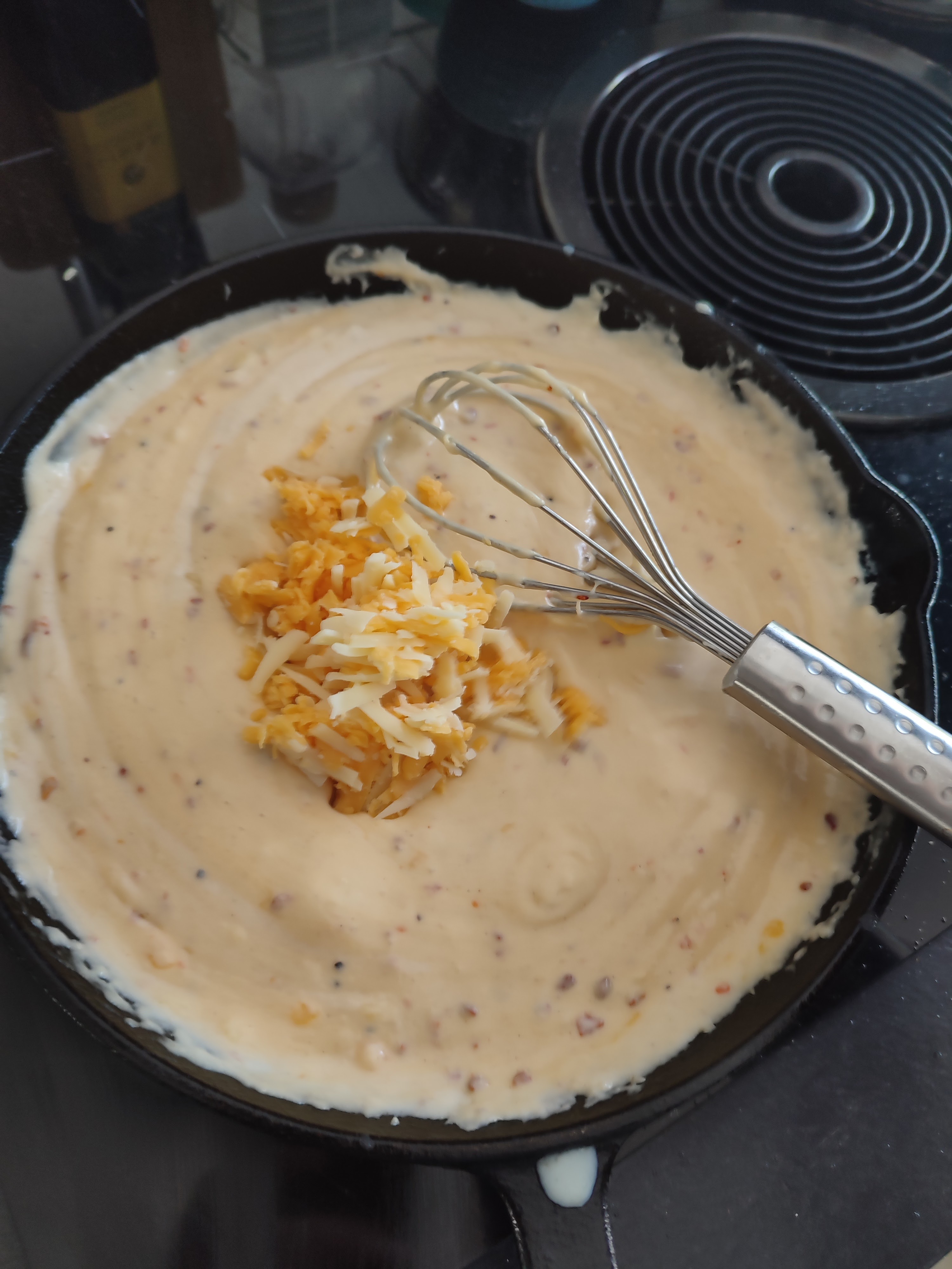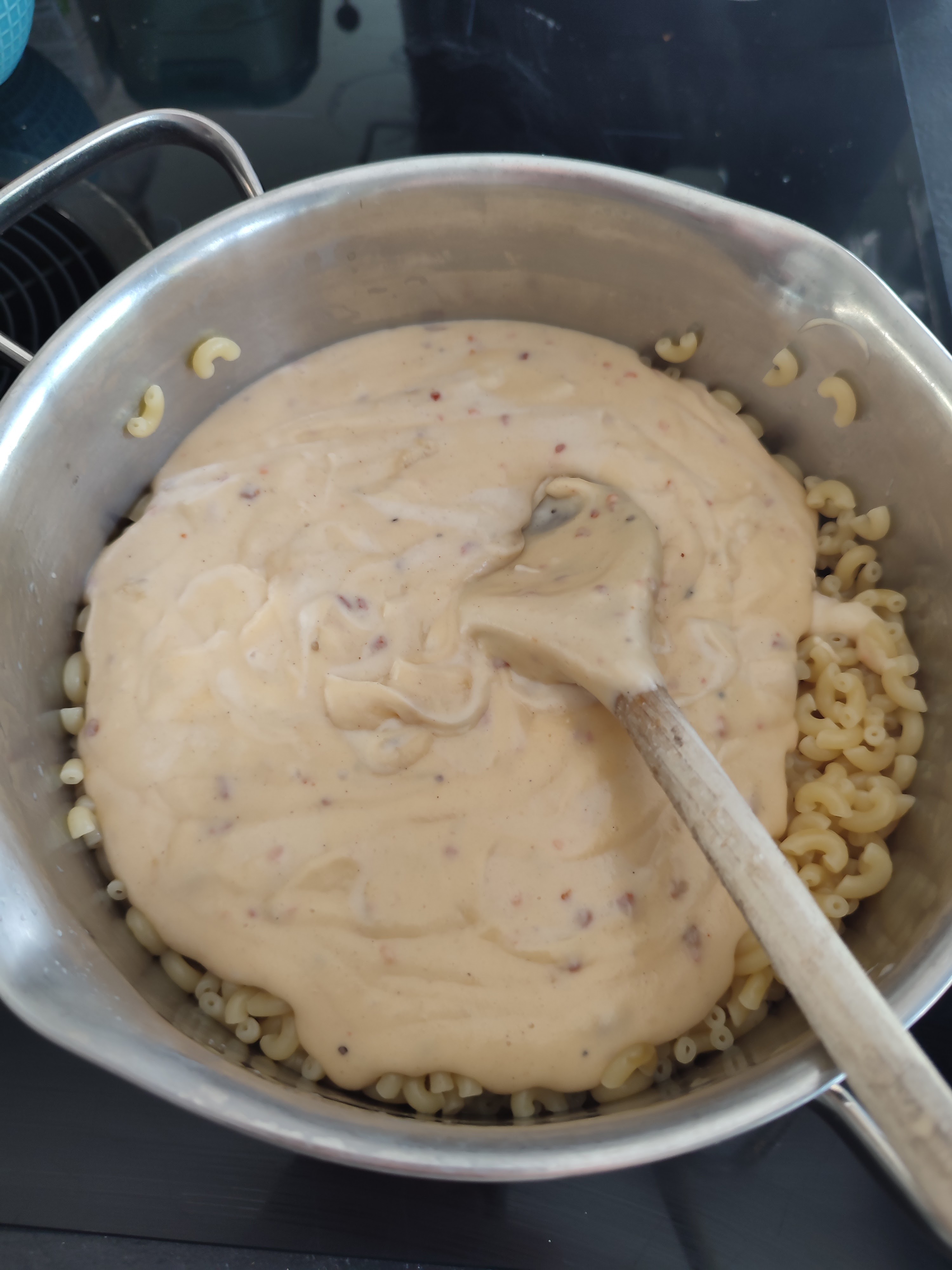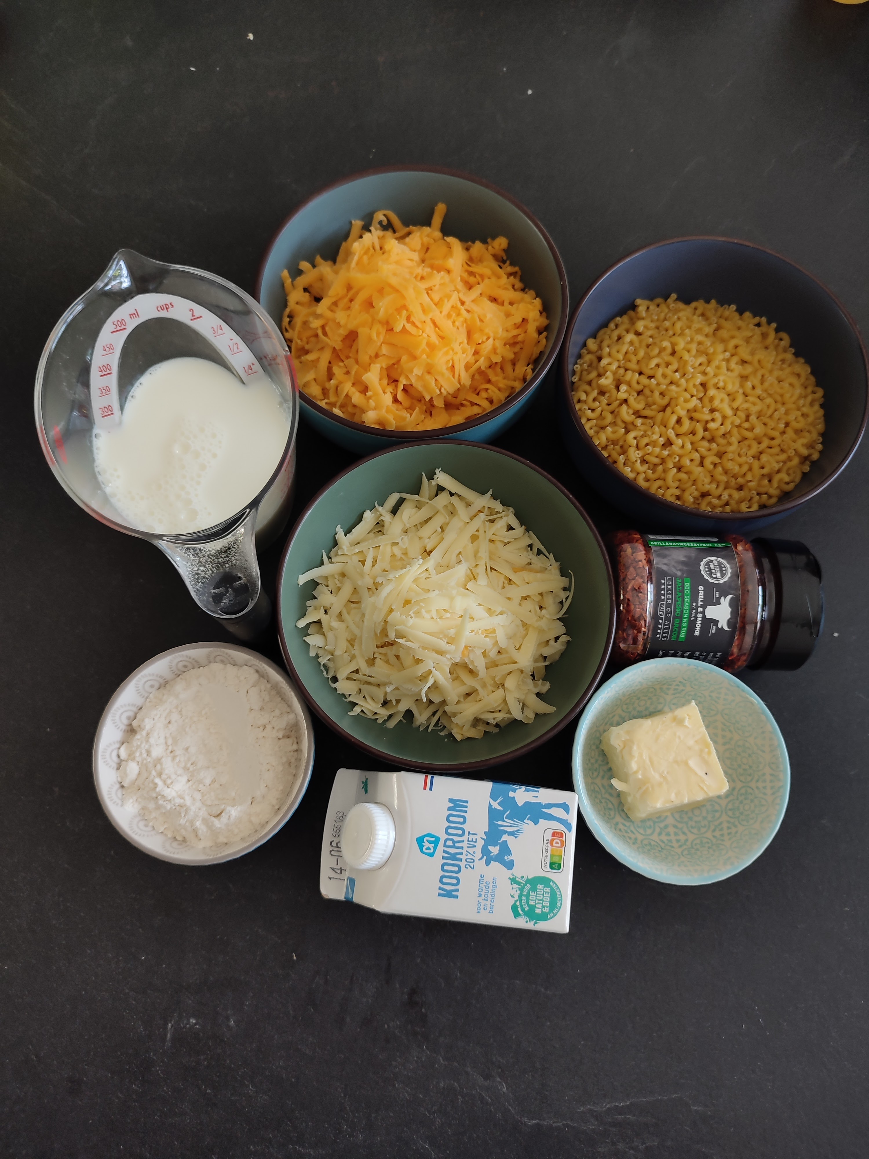 Kook de macaroni volgens verpakking maar 1 minuut korter zodat de macaroni nog niet helemaal gaar is. Zet nu de skillet op het vuur en smelt de boter rustig hier in. Als de boter niet meer bruist voeg de bloem dan toe en blijf roeren met de houten lepel tot de bloem een beetje nootachtige geur heeft. Giet nu steeds beetje bij beetje de melk toe en blijf goed roeren tot steeds de melk goed opgenomen is. Als alle melk erbij zit doe dan nu het zelfde met de room maar gebruik nu een garde nadat alles erbij zit en is de bechamel nog te dik voeg dan nog wat extra melk toe. Zet nu het vuur uit en voeg nu de rub toen en roer door. Nu mag de helft van de cheddar en gruyère toe en roer dit ook goed door en breng op smaak met peper en zout. Giet nu de kaassaus bij de macaroni en roer dit goed door en doe de mengsel nu weer terug in de skillet. Zet de skillet nu in de oven en bak deze tot de kaas mooi gekleurd is.