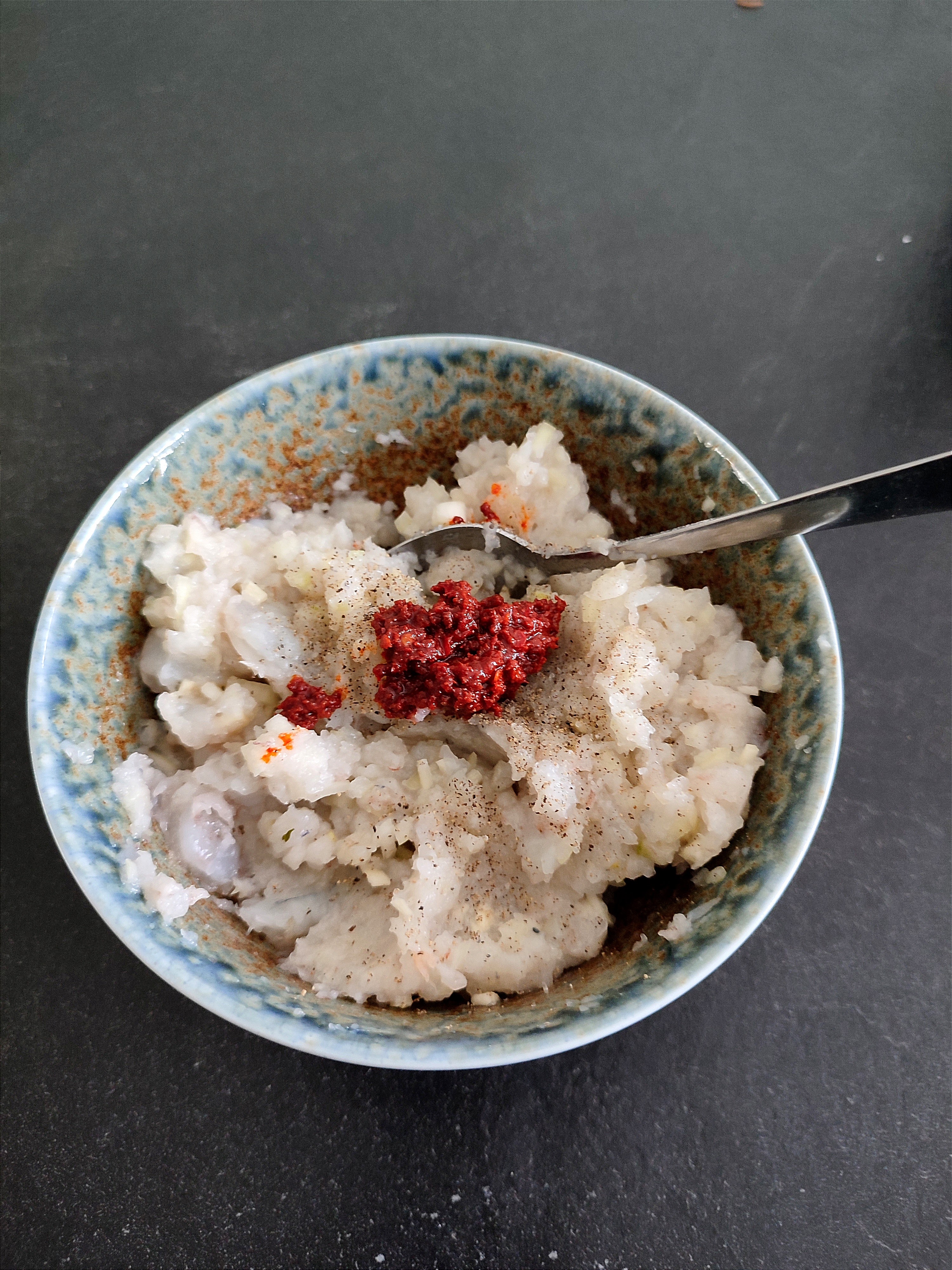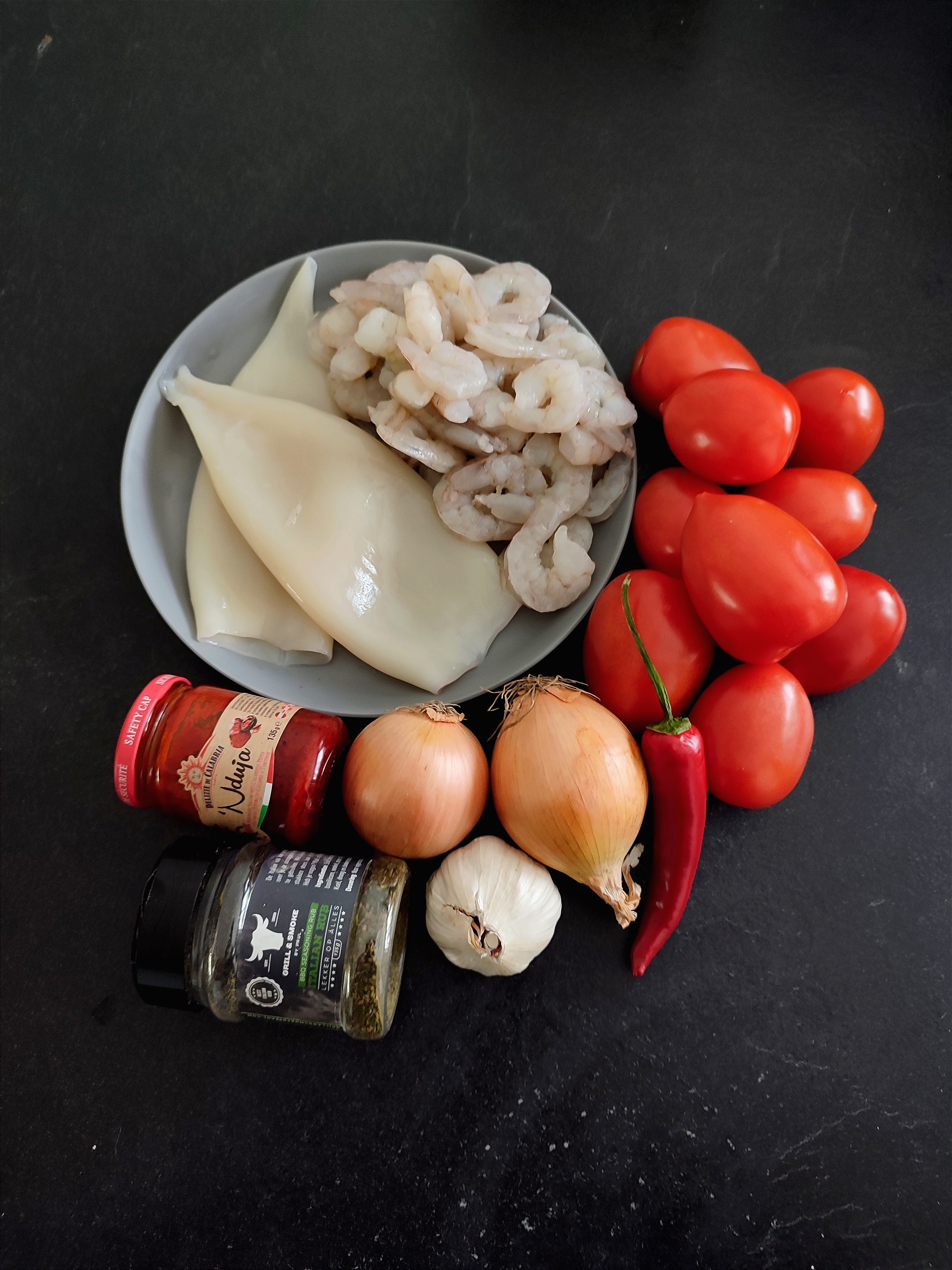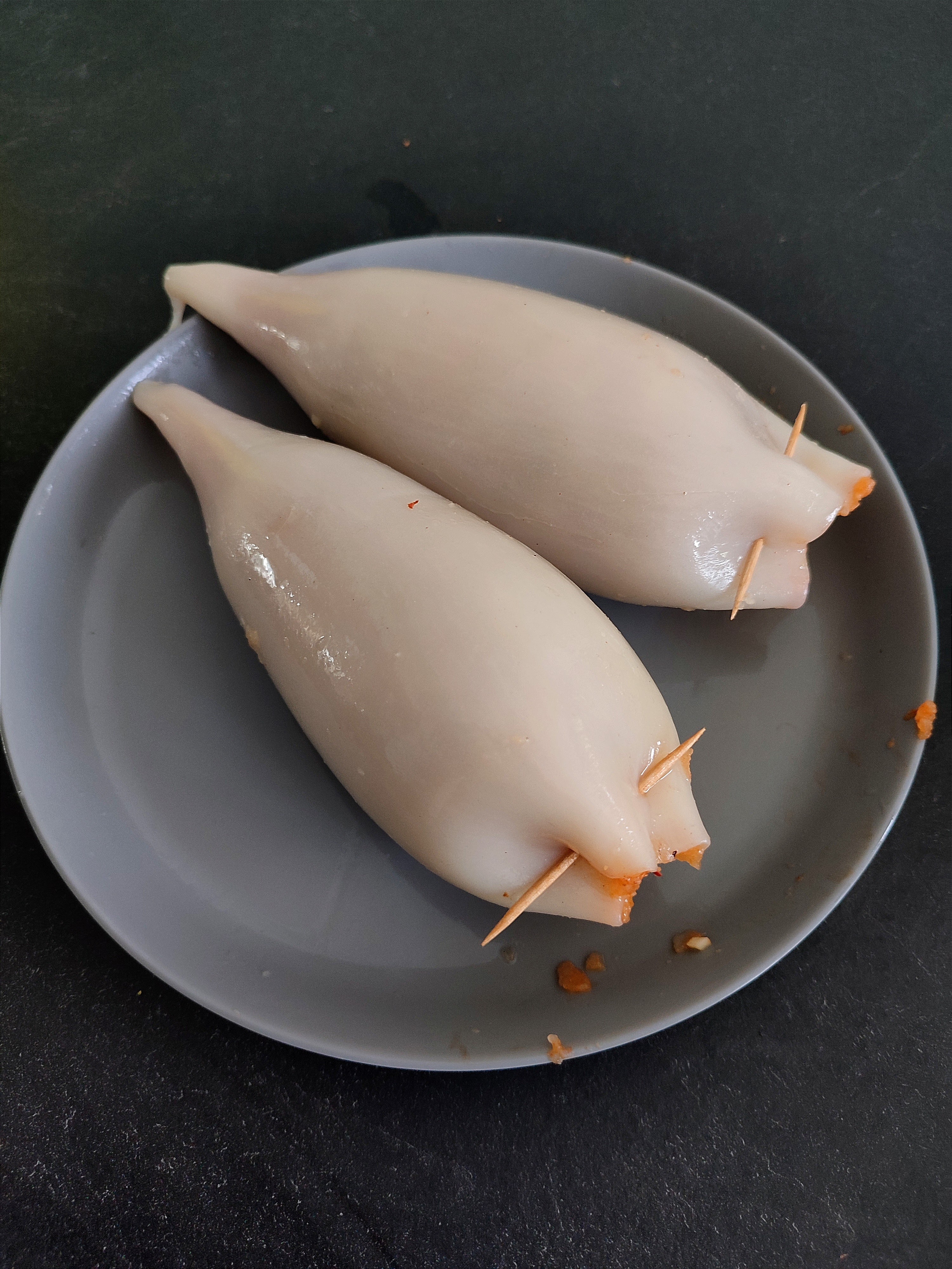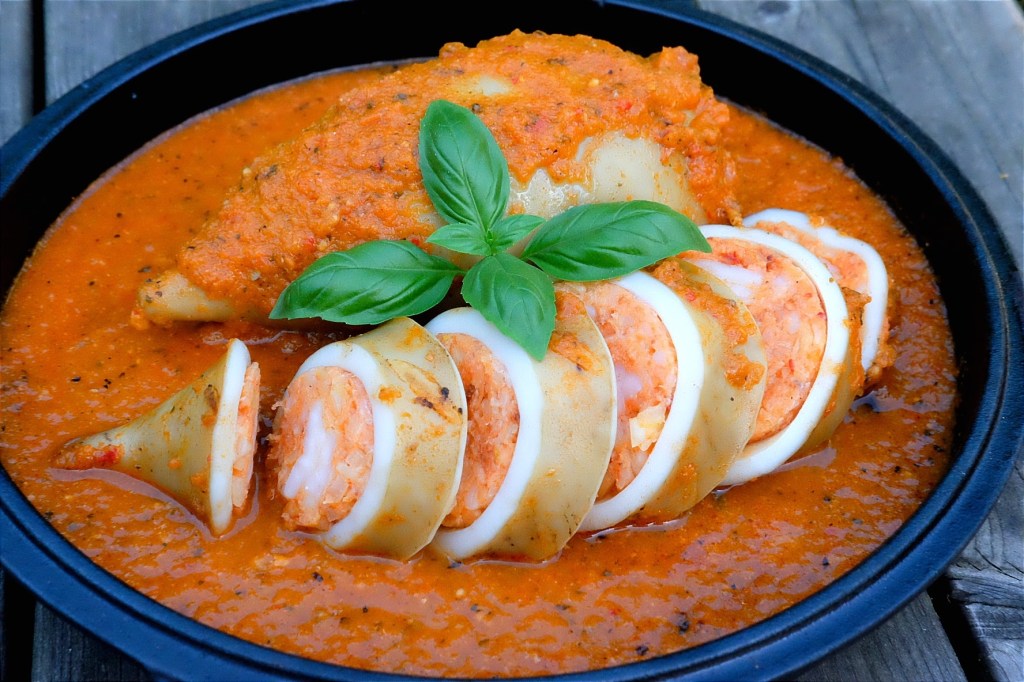 Deze inktvis gevuld met garnalen en nduja is lekker pittig en samen met de licht pittige tomatensaus een heerlijk gerecht.