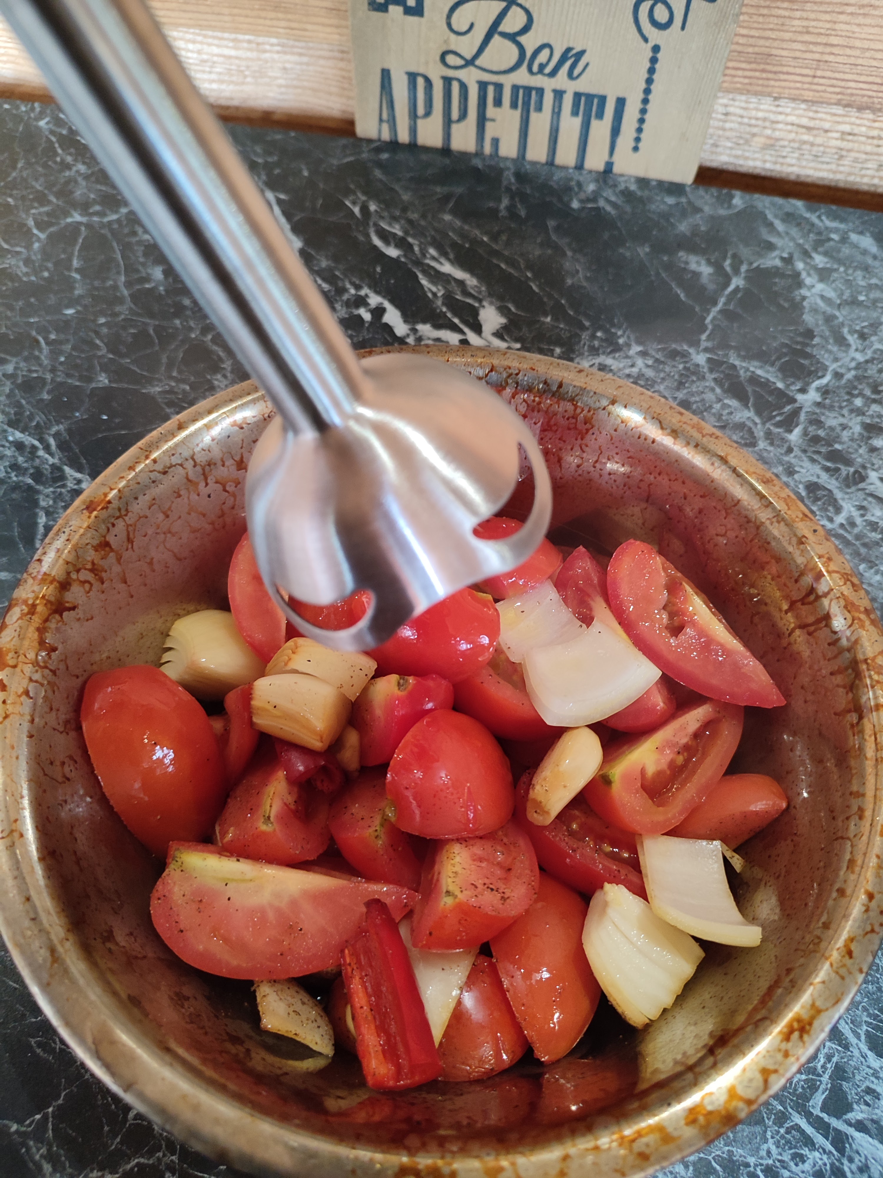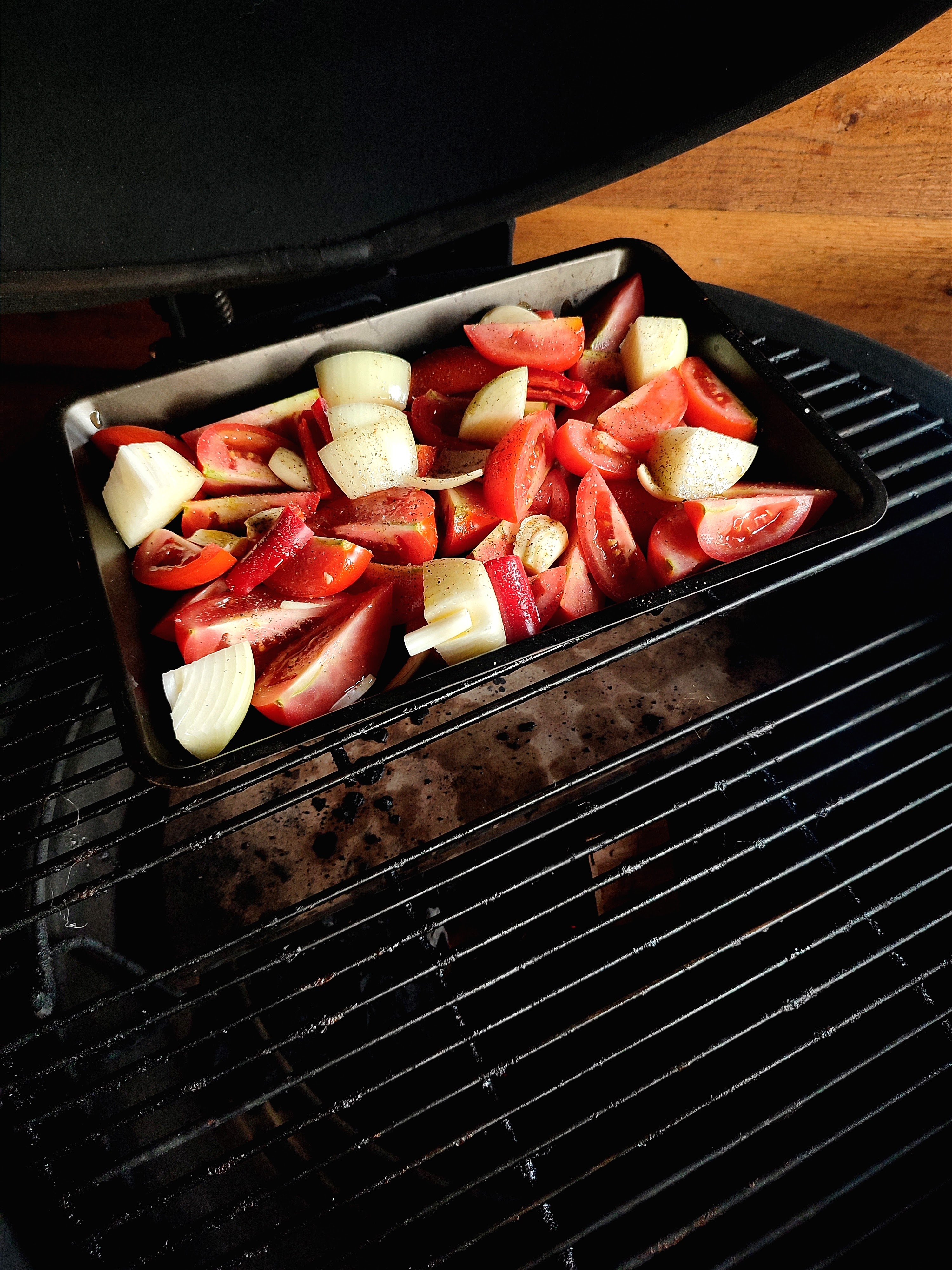 Snij alle groenten grof in stukken en haal eventueel de zaadjes en zaadlijst uit de rode peper als je de saus iets minder pittig wilt hebben. Doe die alles in een skillet of ovenschaal en giet er wat olijfolie over heen en wat peper en zout. Leg het rook blokje op de bbq en zet de groente in de skillet of schaal op de indirecte zijde . Laat dit nu 30 minuten roken. Haal de groenten van de bbq en puree nu de saus met de staafmixer