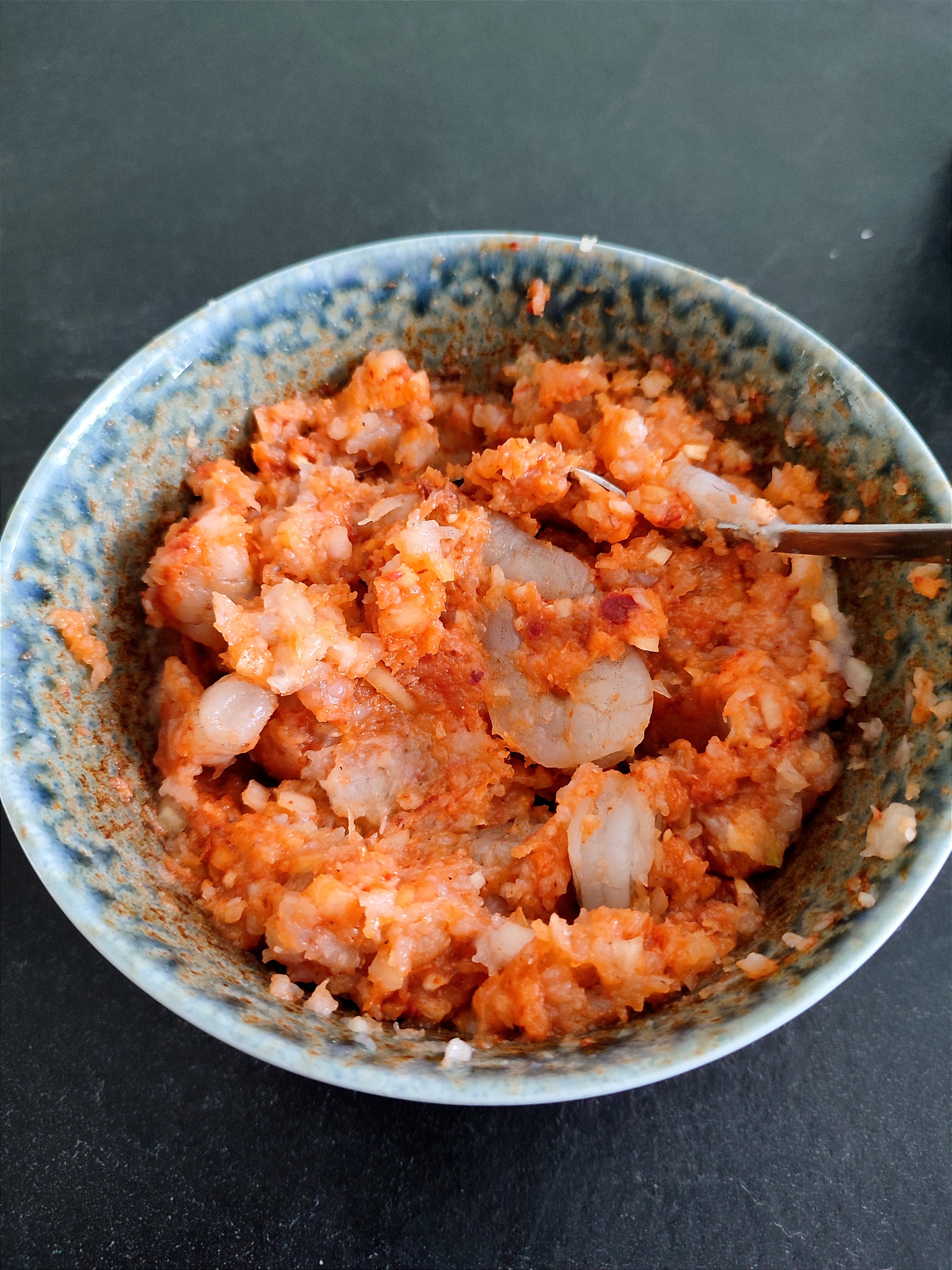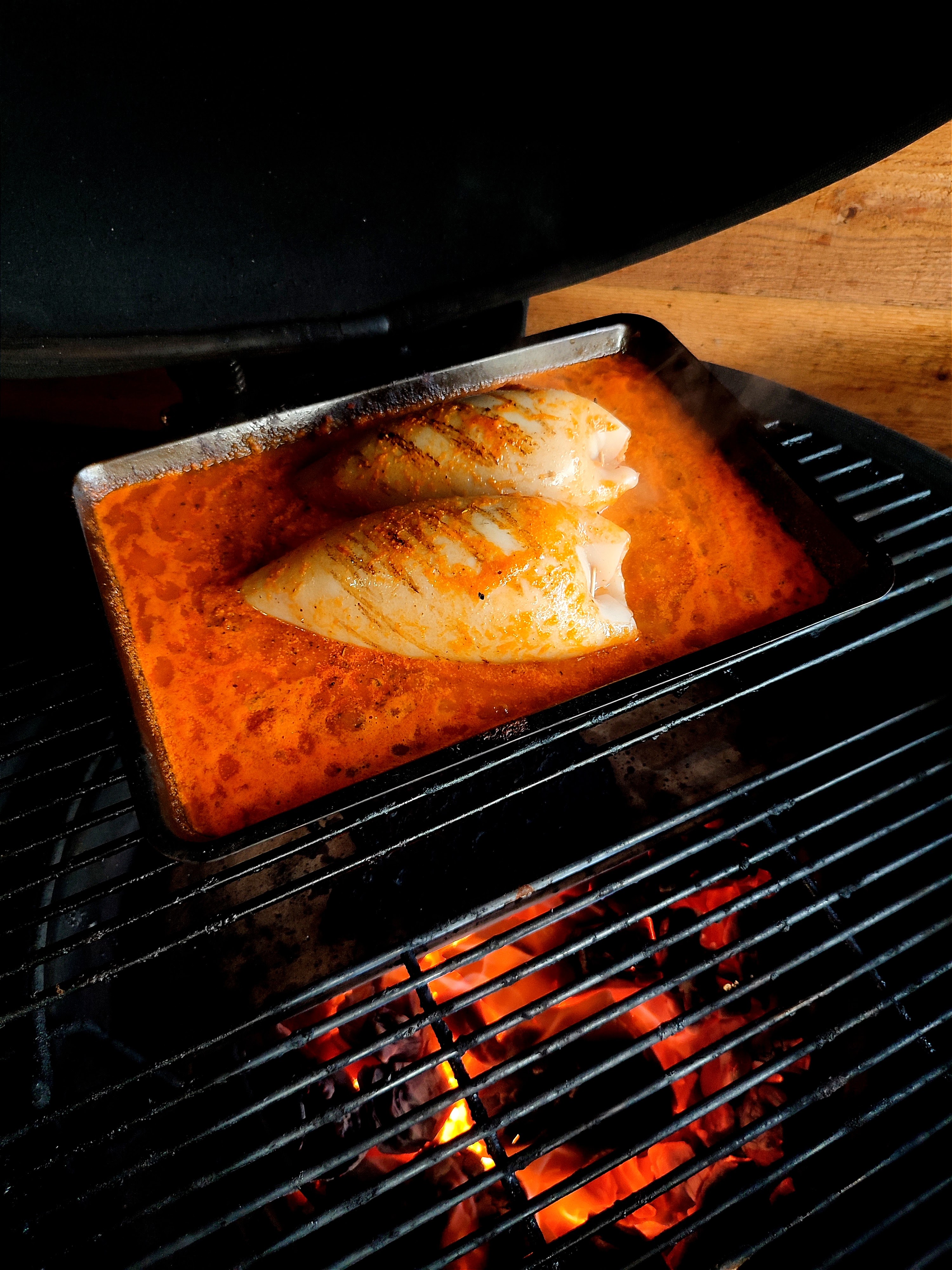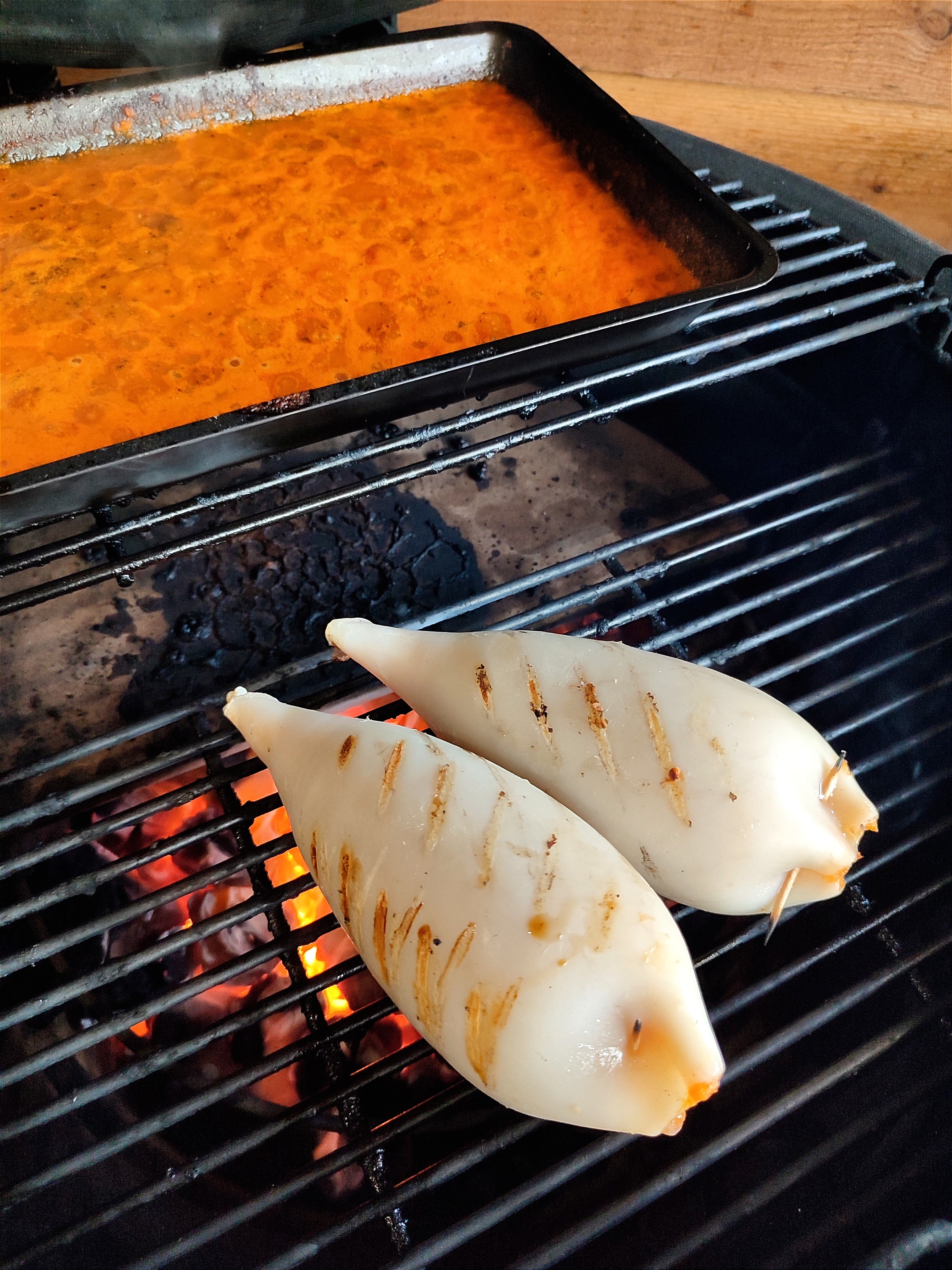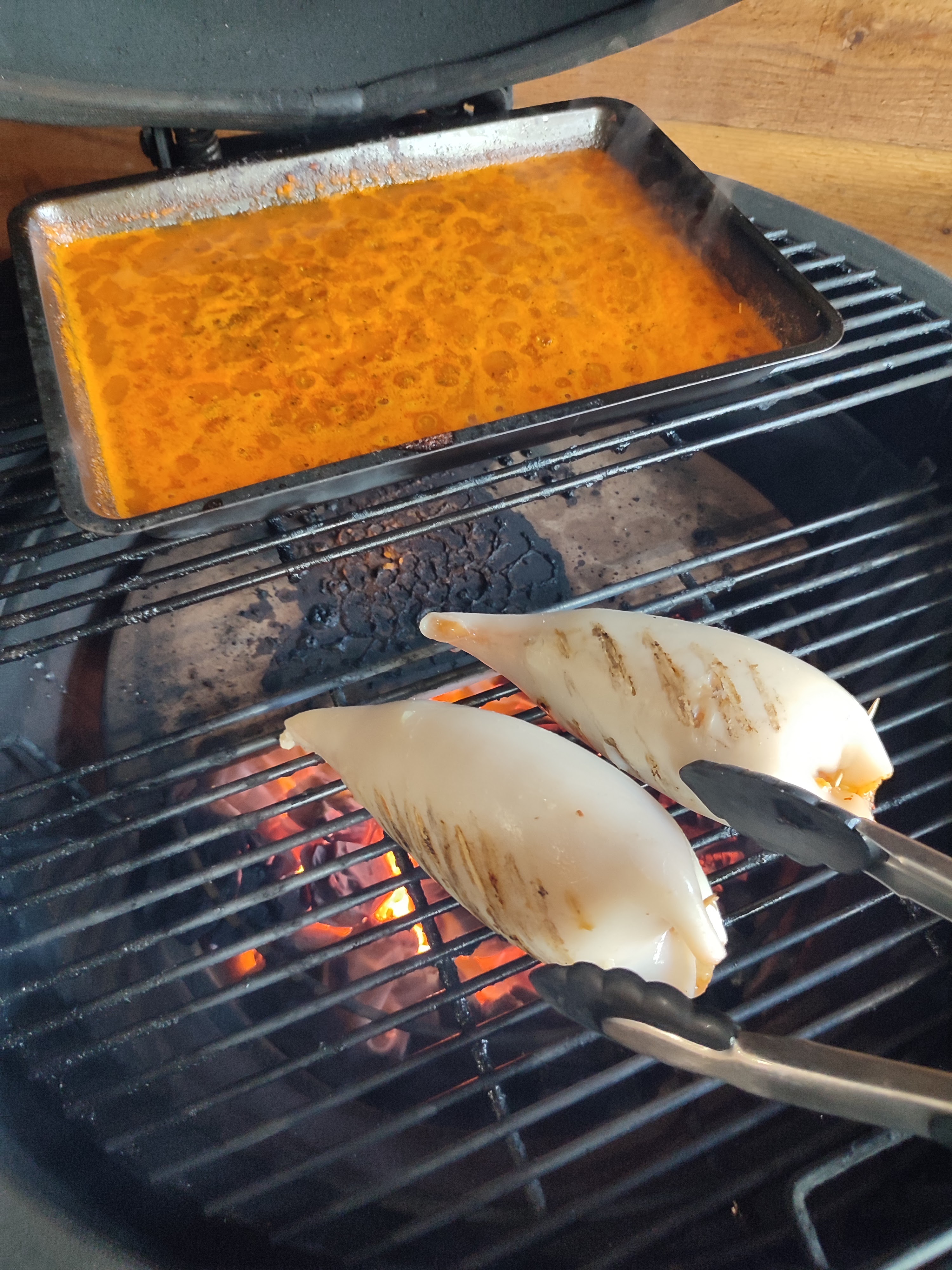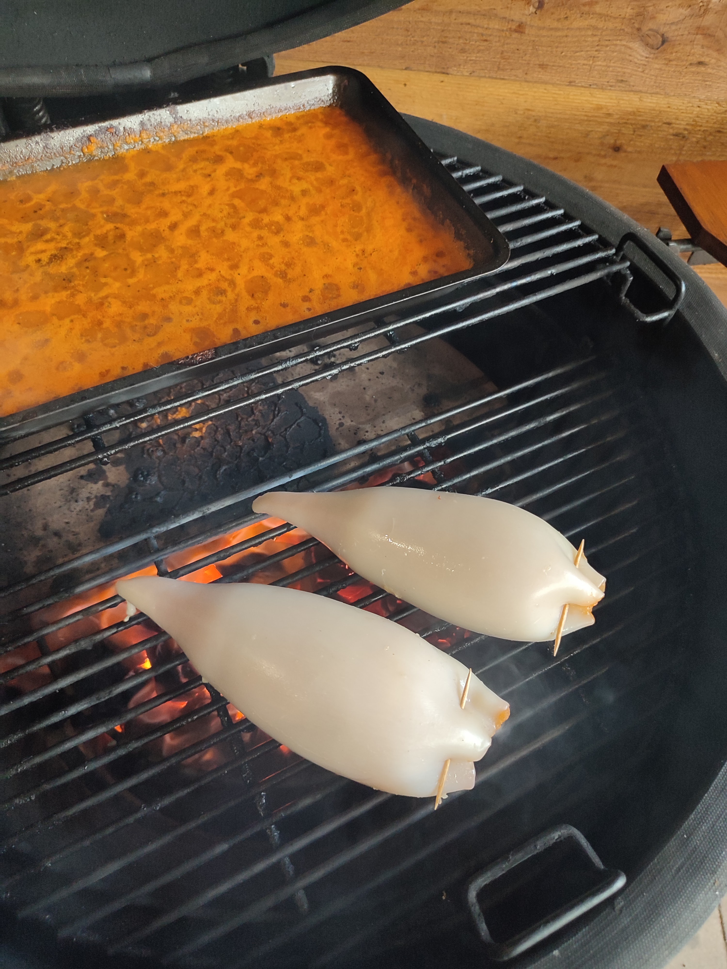 Snipper de ui fijn en hak de knoflook ook fijn. Voeg nu de garnalen, knoflook en de ui in een keukenmachine en pulseer deze een aantal keer tot je een grove farce krijgt. Heb je geen keukenmachine leg dan alles op een snijplank en hak het grof met een mes. Doe dit alles in een kom en voeg de nduja toe houdt je van pittig voeg dan wat extra toe houdt je van minder pittig voeg dan iets minder toe. Meng dit door elkaar en bak een klein beetje en proef en breng eventueel op smaak met peper en zout. Haal nu de inktvis uit de verpakking en kijk goed na of alle harde stukjes uit de binnenkant zijn. Vul de inktvis nu met de garnalen en nduja mengsel en druk goed aan. Maak de uiteinde dicht met een cocktail prikkertje. Zet de skillet of schaal met saus nu op de directe zijde en breng deze aan de kook. Zodra deze kookt roer dan de Italiaanse kruiden erdoorheen en zet de saus op de indirecte zijde. Grill nu aan alle kanten de gevulde inktvis aan en leg deze daarna in de saus. Schep de saus over de inktvis en stoof deze nu voor 30 minuten op 180 garden met af en toe omdraaien en saus eroverheen lepelen. Na 30 minuten is de vulling gaar en de inktvis zacht en klaar om te eten.