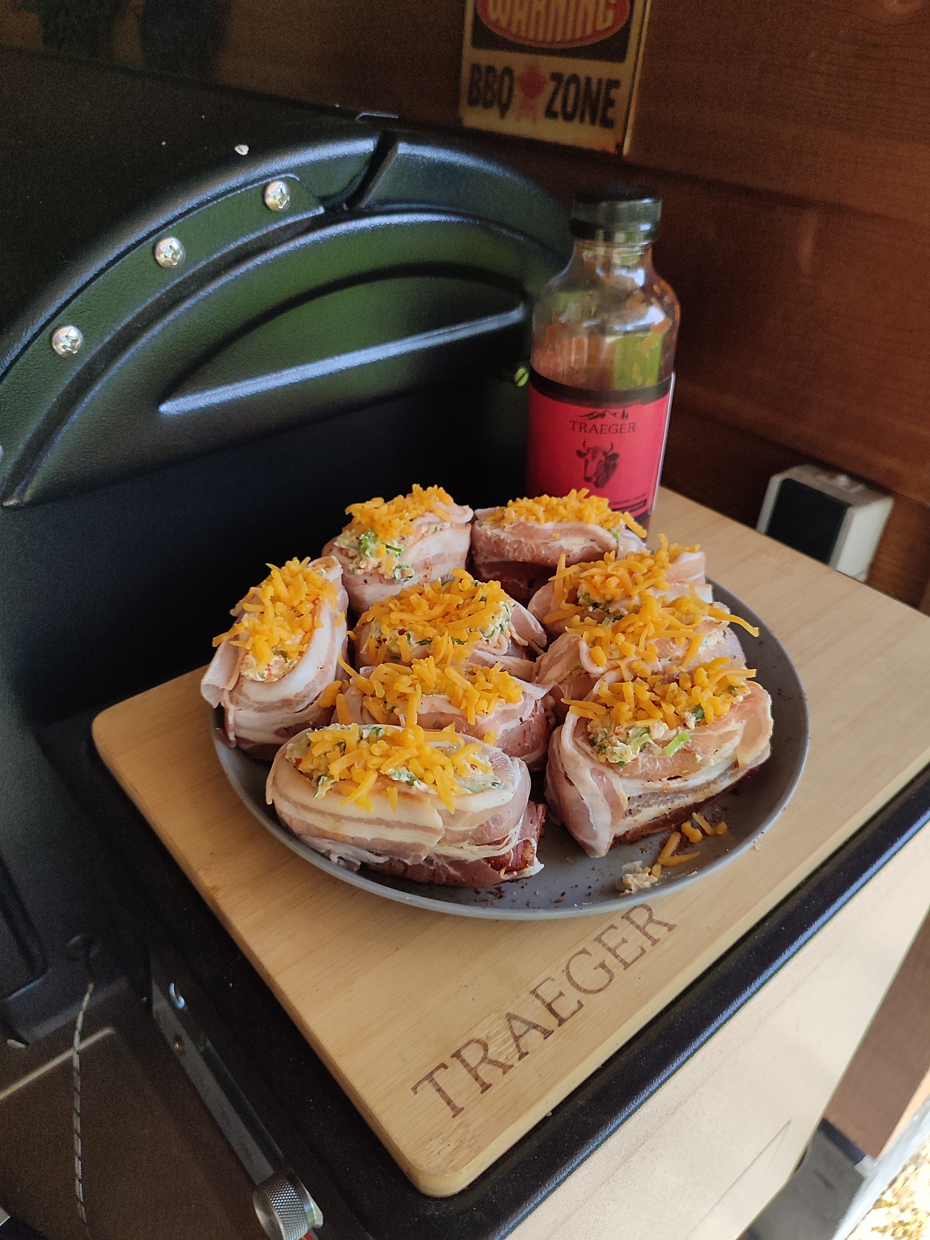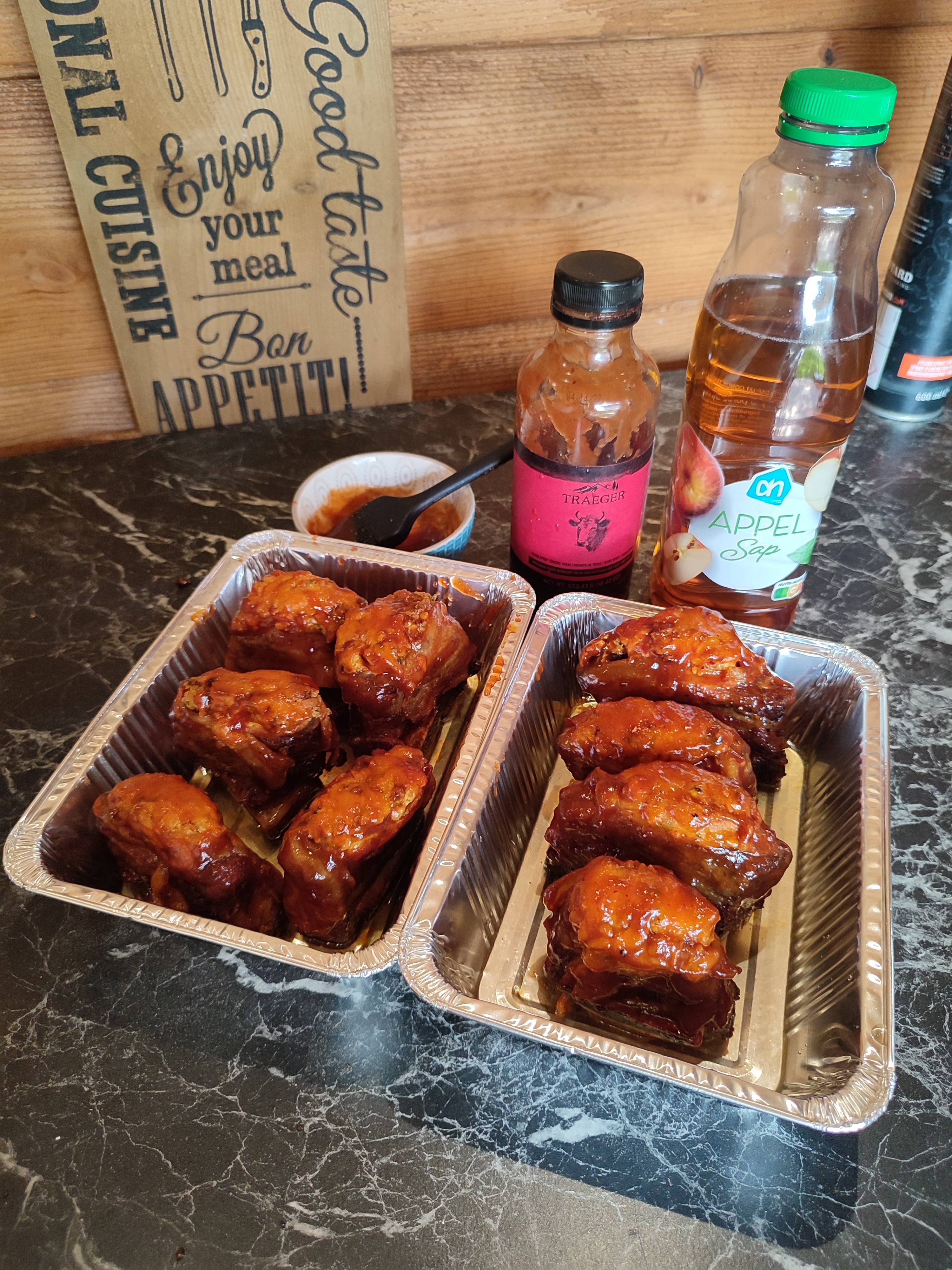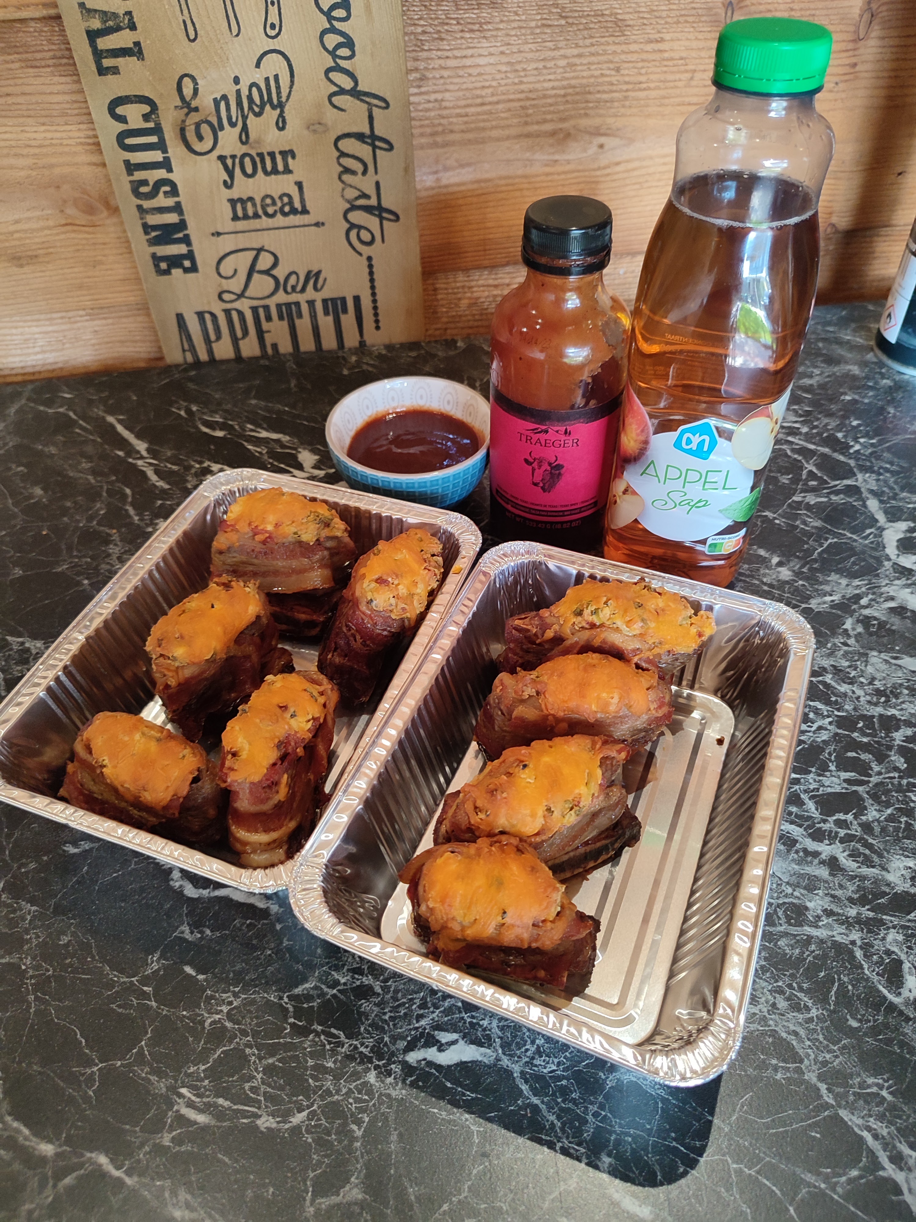 Snij de gezaagde shortribs tussen de botten door zodat je individuele mini shortribs krijgt. Zet ze in de beef rub en omwikkel de met de dikke spek plakken en zorg dat er wat spek boven de shortribs uitsteekt. Meng de roomkaas met 30 gr. Cheddar, de andere rub en in dunne ringen gesneden bosui. Doe dat mengsel nu bovenop de shortribs maar in het spek en strooi de rest van de cheddar eroverheen. Leg nu de rookhout op de bbq en zet het waterbakje op het rooster. Nu mogen de shortribs op de bbq en laat deze rustig roken tot een kern van 77 graden. Smeer nu de shortribs in met de bbqsaus en zet deze in de aluminium bakjes en giet daar de appelsap bij. Dek de bakjes af met aluminiumfolie en zet ze terug op de bbq. Laat de shortribs nu verder garen tot een kern van 93 graden. Haal ze uit de bakjes en smeer ze nog een keer in met de bbqsaus en zet ze terug op de bbq voor nog eens 30 minuten. Haal ze nu van de bbq en laat ze even rusten.