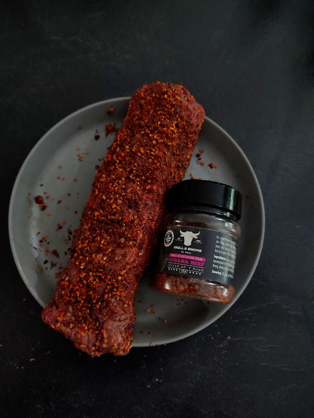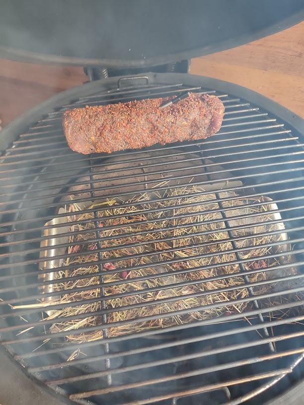Haal de ossenhaas ruim van te voren uit de koelkast zodat hij wat op temperatuur kan komen. Doe nu de rub op de ossenhaas en zorg dat deze goed verdeelt over de hele ossenhaas zit. Zodra de bbq op temperatuur is doe je de geweekte hooi in de geperforeerde schaal ik gebruikte hiervoor een groenten grill schaal voor op de bbq. Zet deze schaal zo dicht mogelijk boven de kolen op de directe kant en leg de ossenhaas op de indirecte kant van de bbq. Laat nu de ossenhaas rustig roken en garen tot een kern van ongeveer 47 graden voor uiteindelijk medium rare wil je hem liever rare hebben laat hem dan garen tot 44 graden kern. Zodra de temperatuur behaalt is haal je de ossenhaas van de bbq en verwijder je de schaal waar het hooi in zat. Dek de ossenhaas af met aluminiumfolie en laat deze nu rusten. Breng nu de bbq naar ongeveer 200 tot 220 graden. Als de bbq de temperatuur gehaald heeft grill dan de ossenhaas op de directe kant nog eens mooi aan tot een mooi korst heeft gevormd. Haal de ossenhaas weer van de bbq af en laat hem weer minimaal 10 minuten rusten ingepakt in aluminiumfolie.