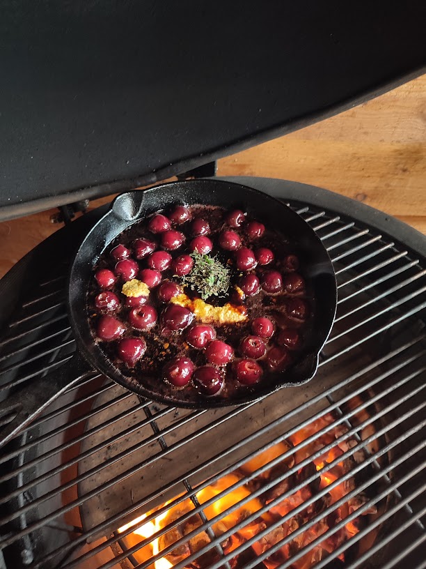 Warm tijdens het verhogen van de temperatuur van de bbq voor het af grillen van de ossenhaas een skillet mee op. Snipper ondertussen de sjalot of rode ui en maak de teentjes knoflook schoon en hak deze ook fijn ris ook de blaadjes van de takjes tijm. Als de skillet op temperatuur voeg dan de olie en boter toe en laat dit smelten en uit bruisen. Zodra dat gebeurt is fruit dan de sjalot of rode ui aan tot glazig voeg daarna de knoflook toe en bak kort zachtjes mee. Voeg nu de kersen en tijm toe en laat 5 minuten zachtjes bakken tot de kersen wat zachter zijn geworden onder regelmatig roeren. Als dat gebeurt is voeg dan de wijn, balsamico, honing en mosterd toe en roer door. Breng dit nu aan de kook en laat rustig koken voor ongeveer 10 minuten tot het een mooie saus dikte heeft. Haal de skillet van de bbq en hak nu de chocolade grof en voeg dit aan de saus toe en roer het door tot het opgelost is. Breng de saus nu nog eventueel op smaak met zout en peper.