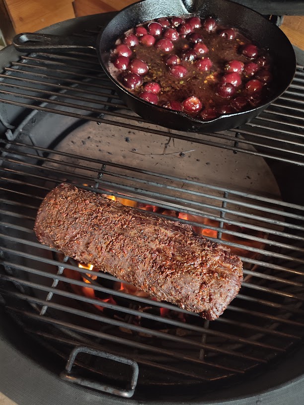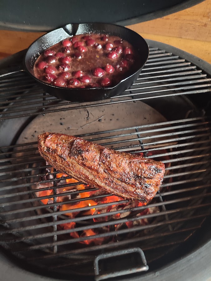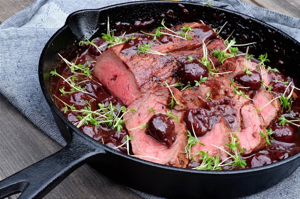 Nu we midden in het kersen seizoen zitten is dit een hele mooi leuk gerecht voor deze zomer om te maken. De lekkere zoete smaak van de kersen gaat goed samen met het bittere van de pure chocolade en beide smaken passen zeer goed bij de ossenhaas. En de kruidige rook smaak van de hooi maakt het gerecht helemaal af.