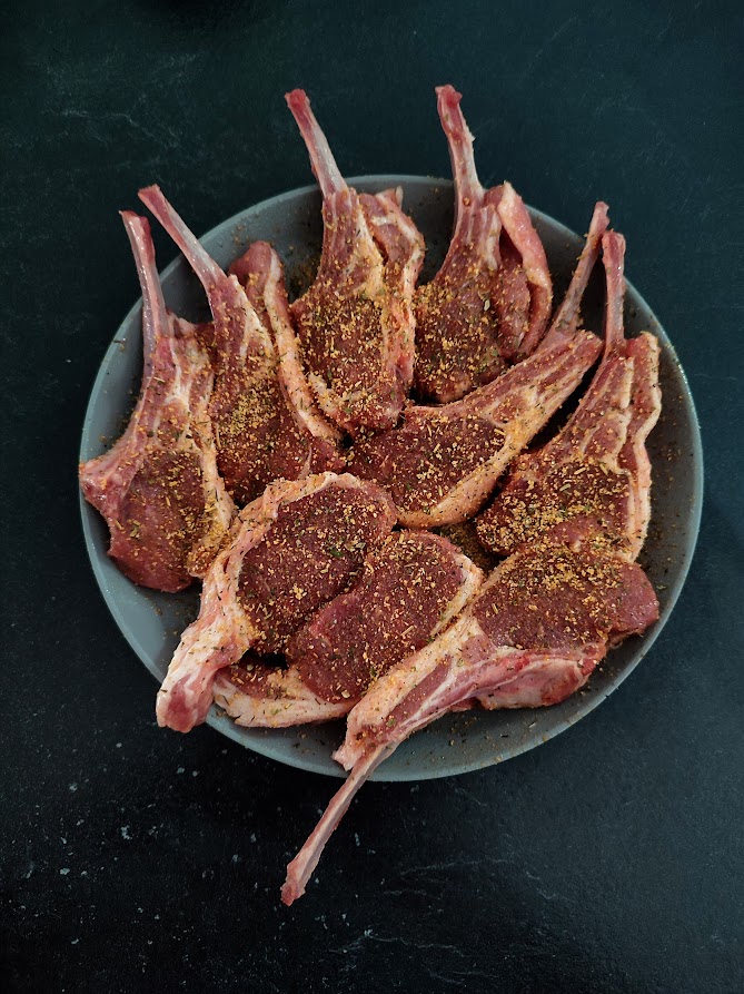 Snij de lamsrack in koteletten door steeds aan een kant van het botje naar beneden te snijden als dat gebeurt is houdt je 1 stuk over zonder bot. Mocht deze een stuk dikker zijn dan de koteletten snij deze dan nog een keer doormidden. Bestrijk de koteletten met wat olie en verdeel de rub eroverheen. Als de bbq op temperatuur is en het rooster goed heet grill dan de koteletten kort direct boven de kolen ongeveer 2 minuten aan iedere kant. Haal ze van de bbq en laat ze even rusten.